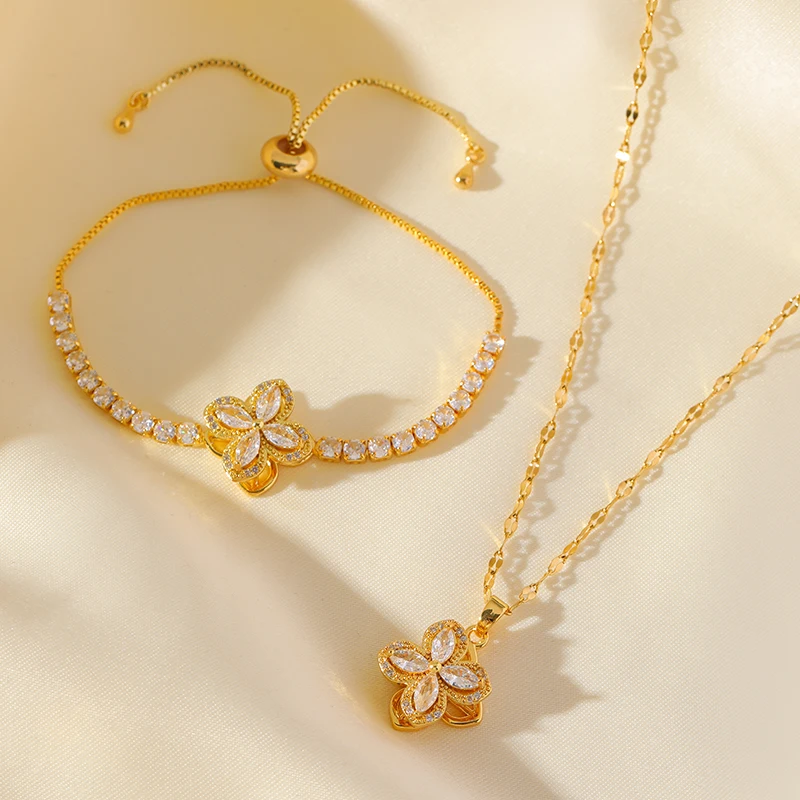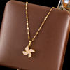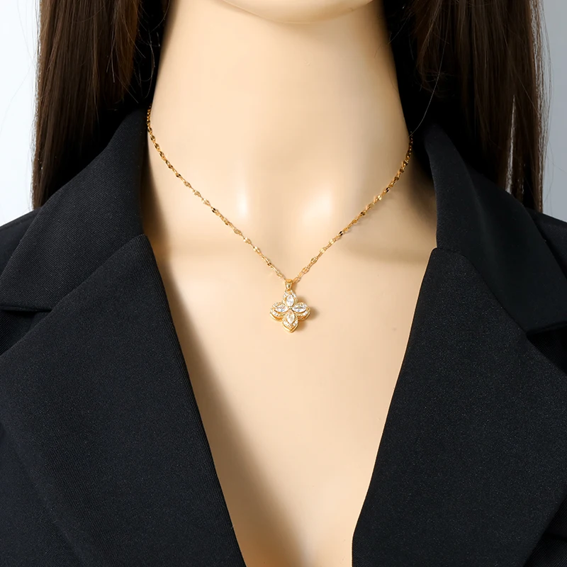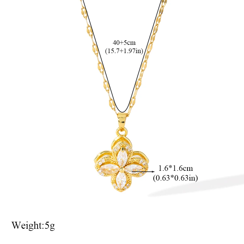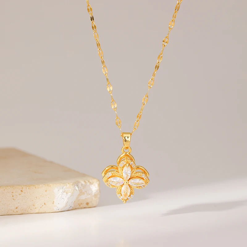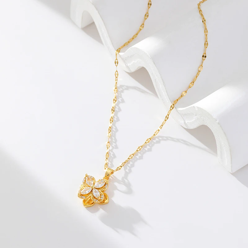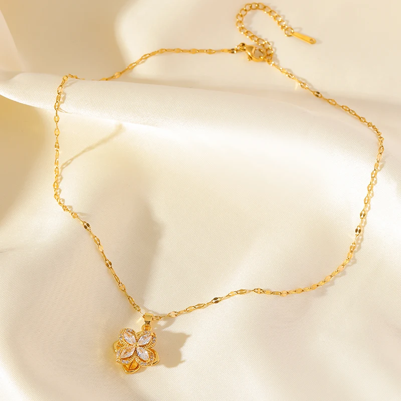 GANEMLY 316L Stainless Steel White Zircon Flower Necklace For Women Fashion Rotatable Dangle Neck Chain Waterproof Jewelry Gift