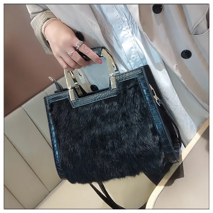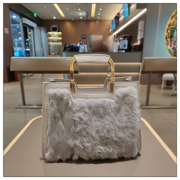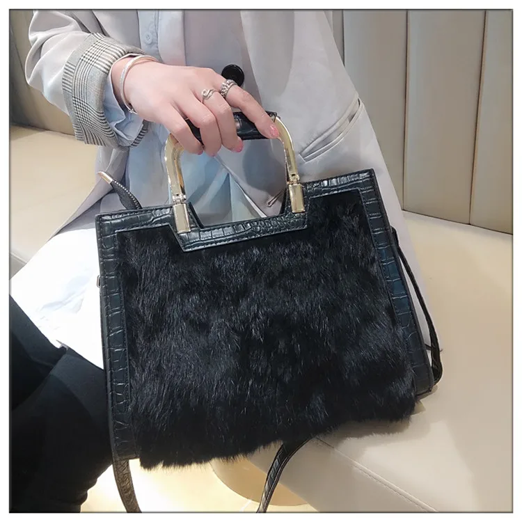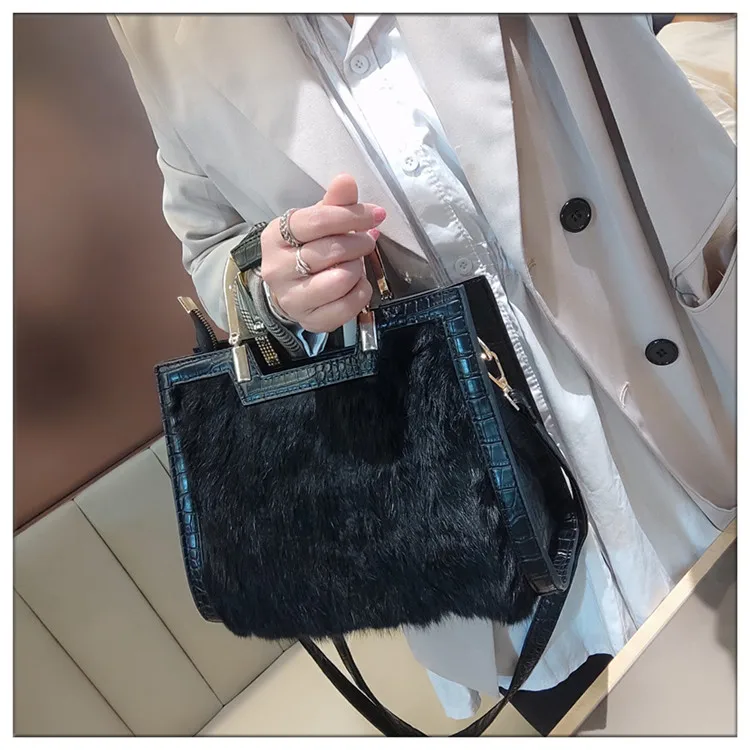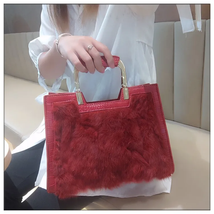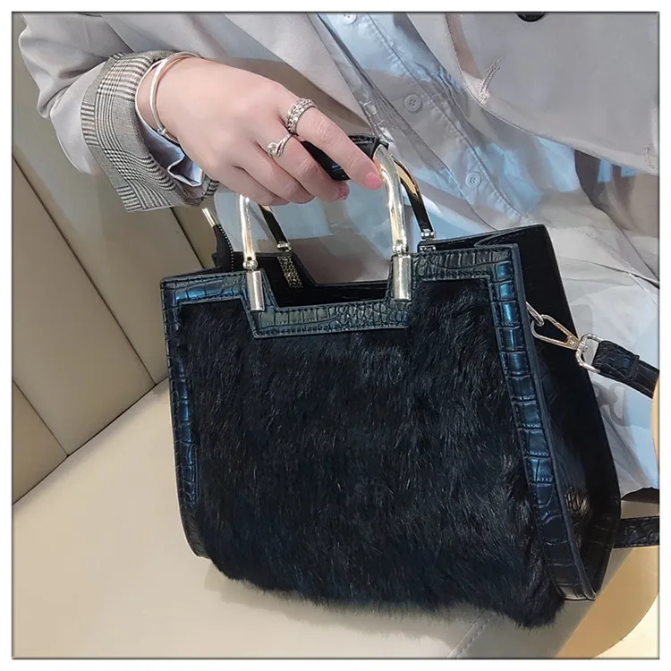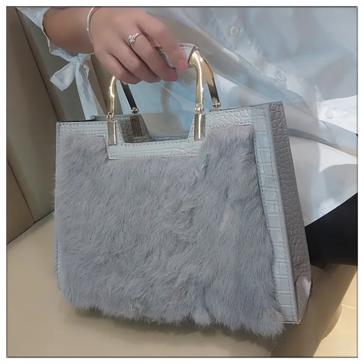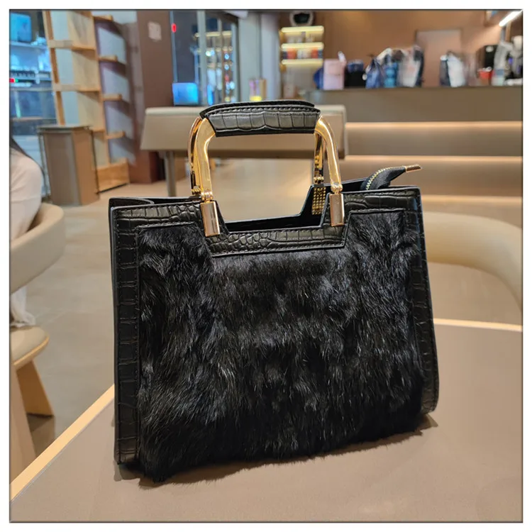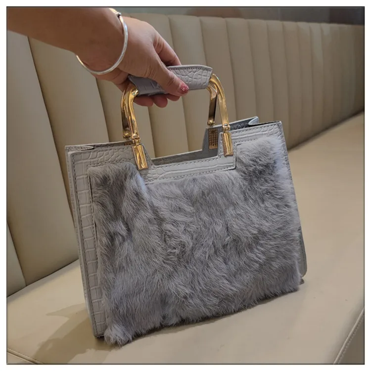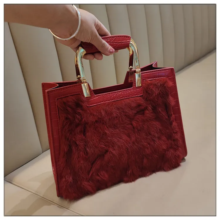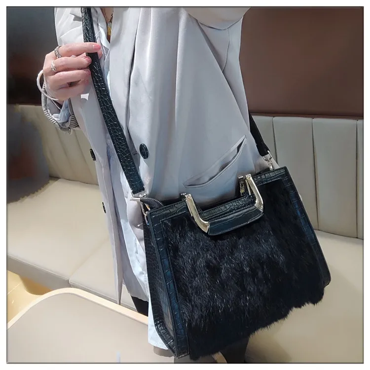 Genuine Leather Women’s Handbag Luxury Fashion Real Rabbit Hair Single Shoulder Messenger Bag Large Capacity Portable Tote Bags