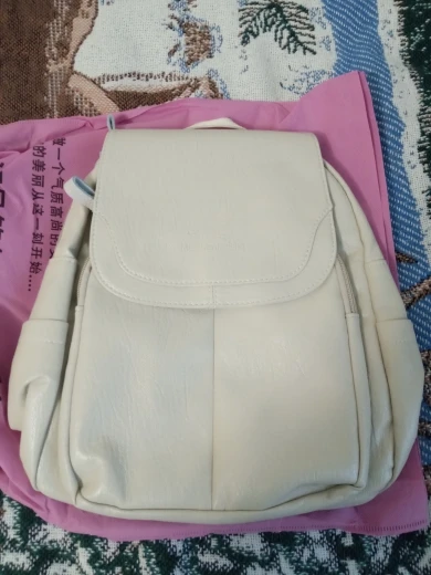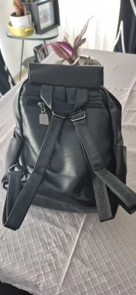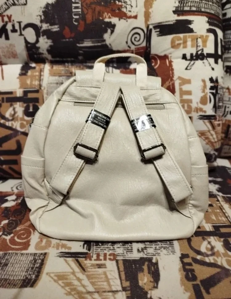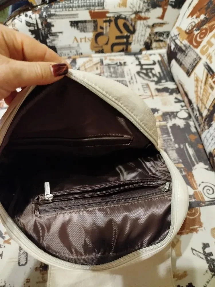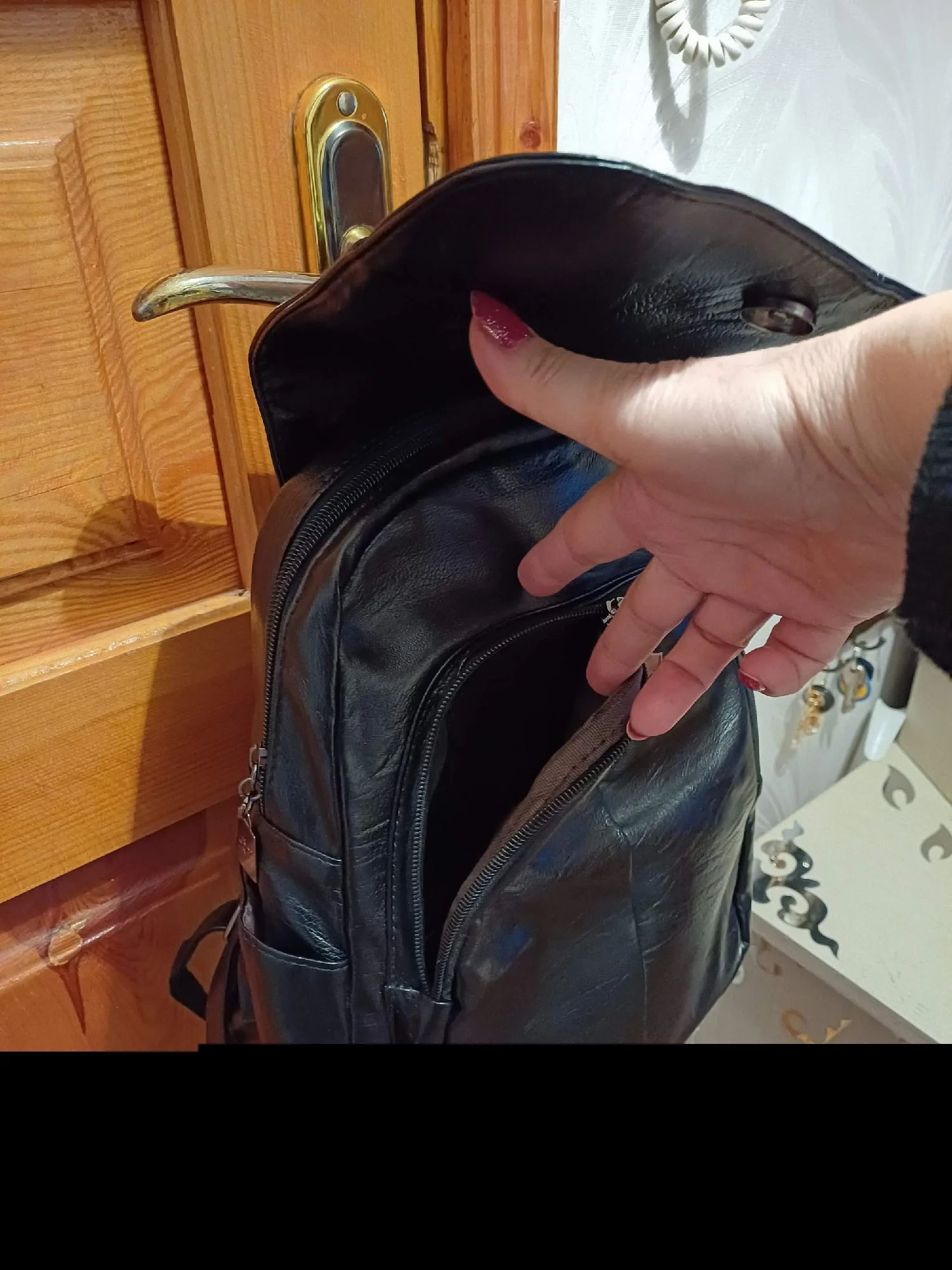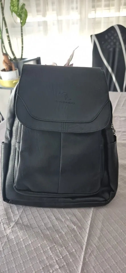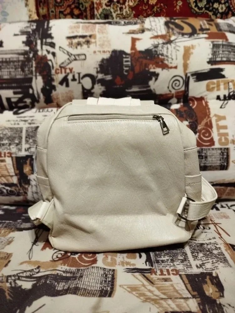 Very comfortable black backpack made of soft eco-leather. The main volume of the bag is convenient and quite spacious, along with several additional external pockets: at the front and back with zippers, and simply slip pockets on the sides. The stitching is neat, the seams are straight. The only downside is the paint smell, which is quite strong but will obviously dissipate quickly. Overall, the product looks simple and convenient. I'm buying a second one of these bags; I really liked the previous white one and used it actively. I think that this bag will be just as functional and useful. Thanks to the manufacturer and seller!