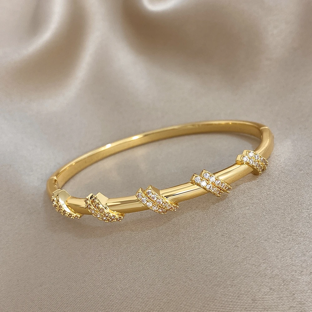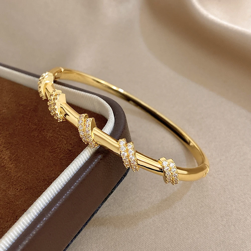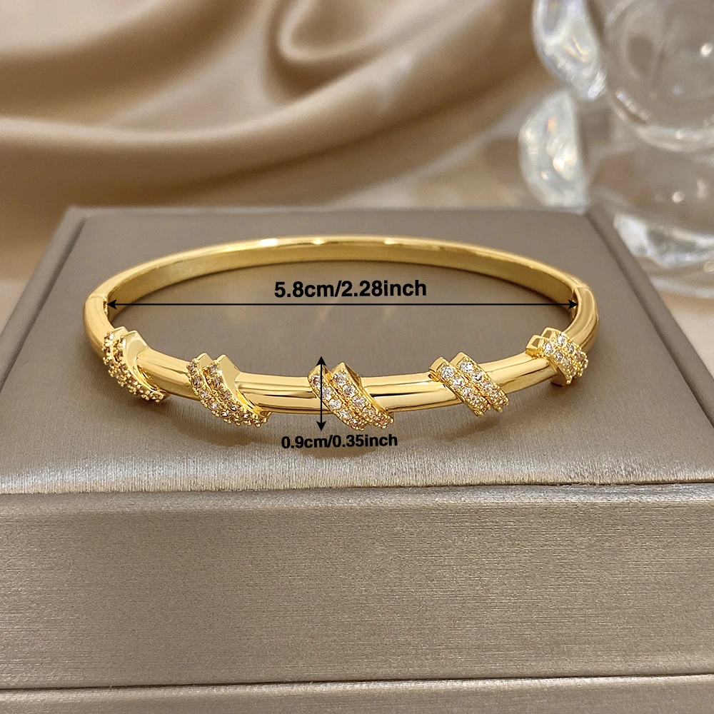 Glossy Double Circle Zircon Twisted Cuff Bangle Bracelets for Women Trendy Gold Plated Copper Wristband Bracelet Party Jewelry
