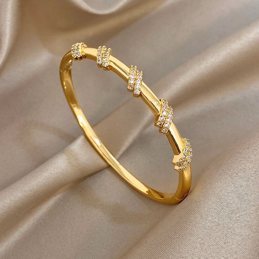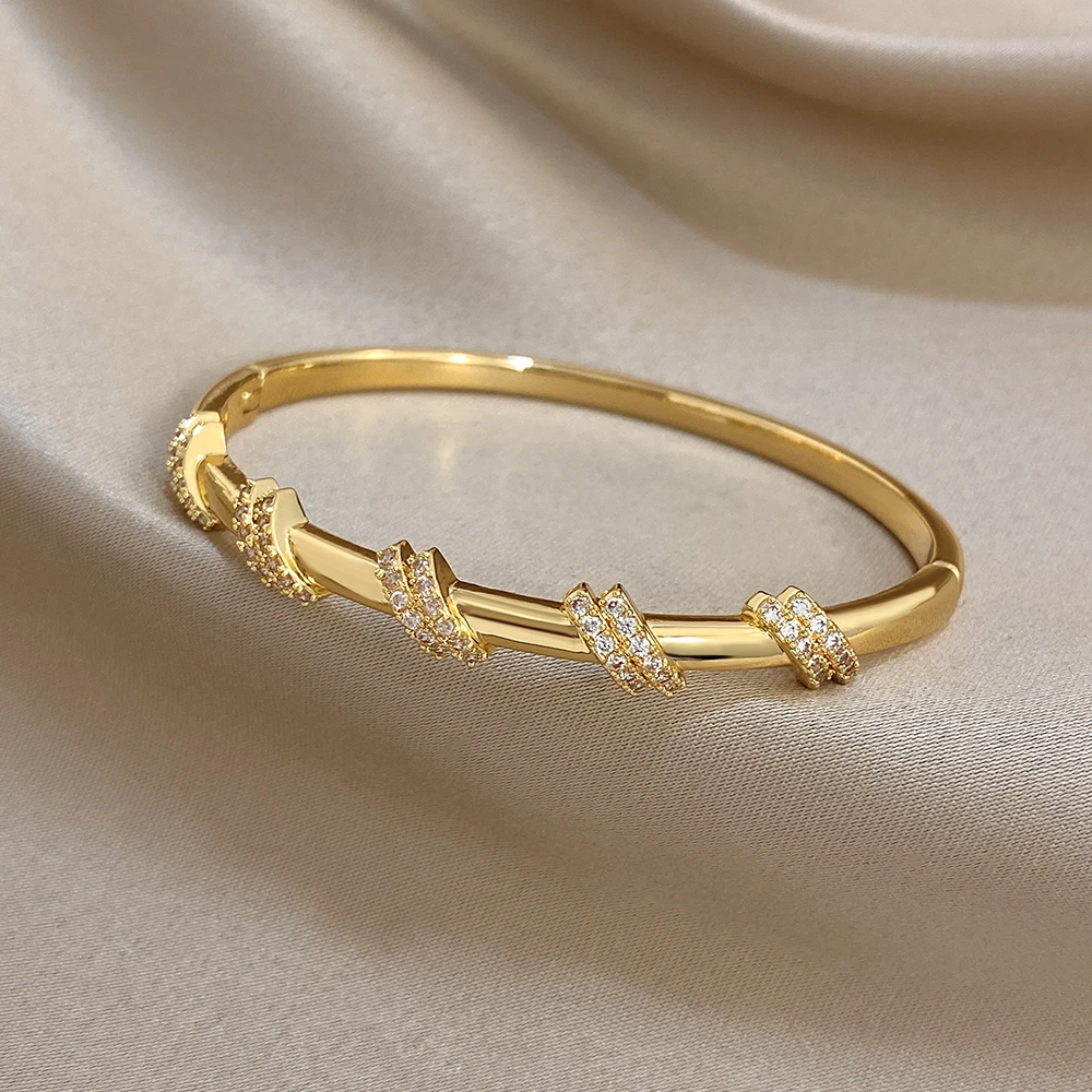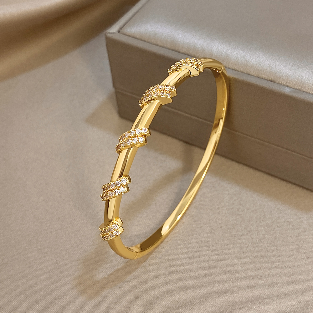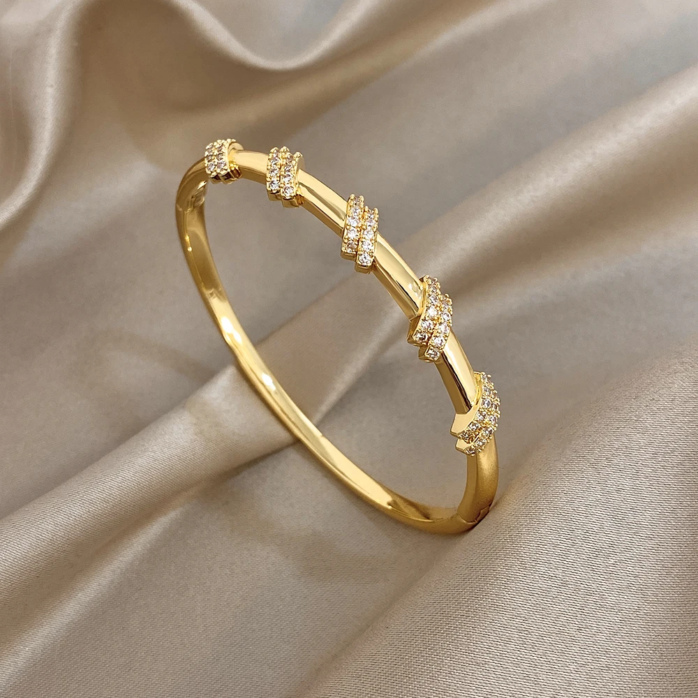 Glossy Double Circle Zircon Twisted Cuff Bangle Bracelets for Women Trendy Gold Plated Copper Wristband Bracelet Party Jewelry