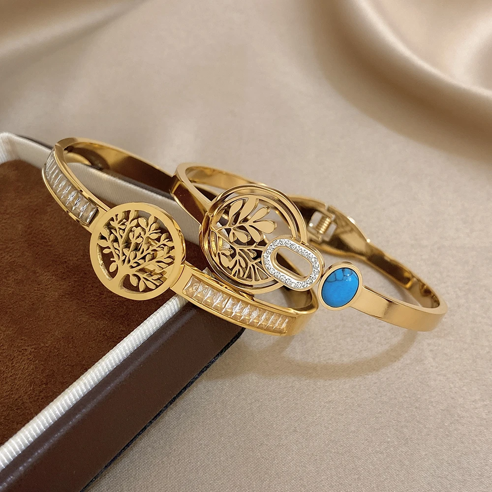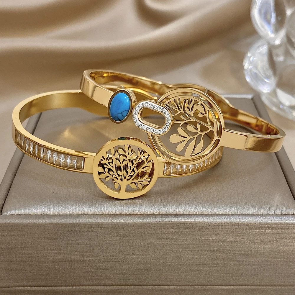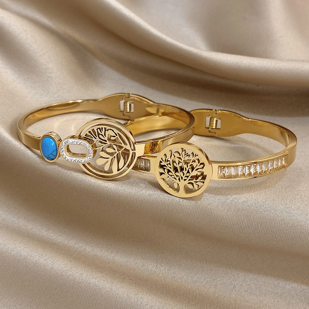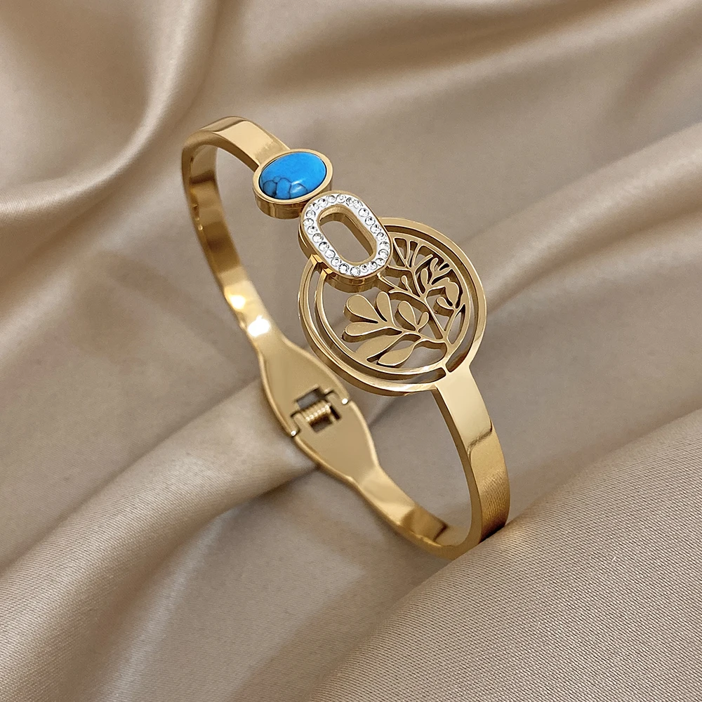 Greatera Blue Turquoise Life Tree Rhinestone Inlaid Open Bracelet Charm High-end Versatile Unique Men Women’s Bangles Jewelry