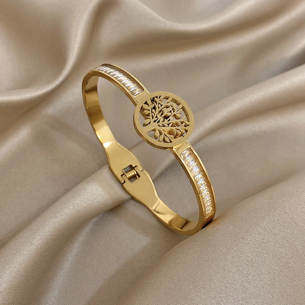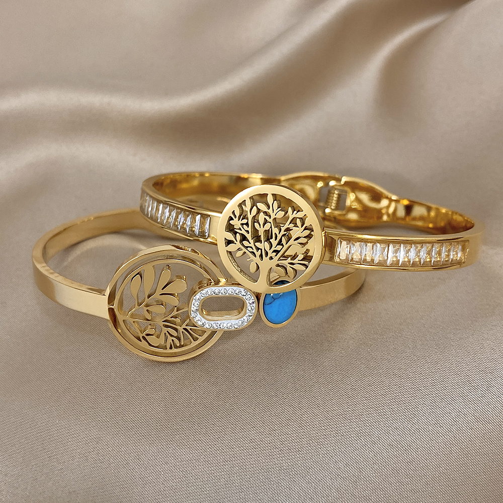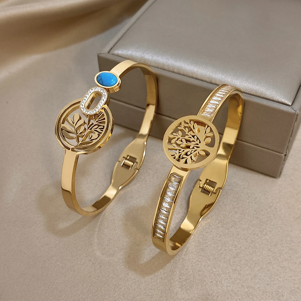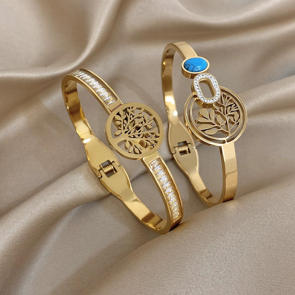 Greatera Blue Turquoise Life Tree Rhinestone Inlaid Open Bracelet Charm High-end Versatile Unique Men Women’s Bangles Jewelry