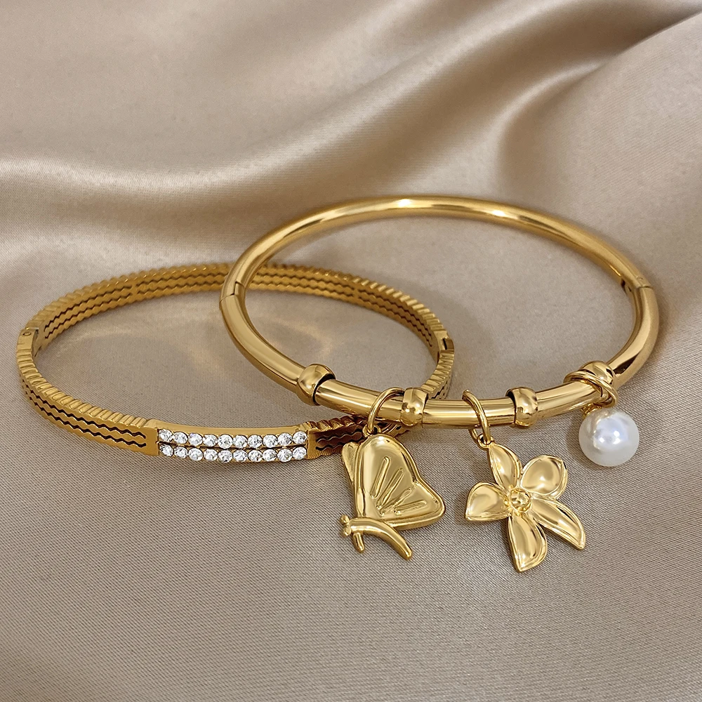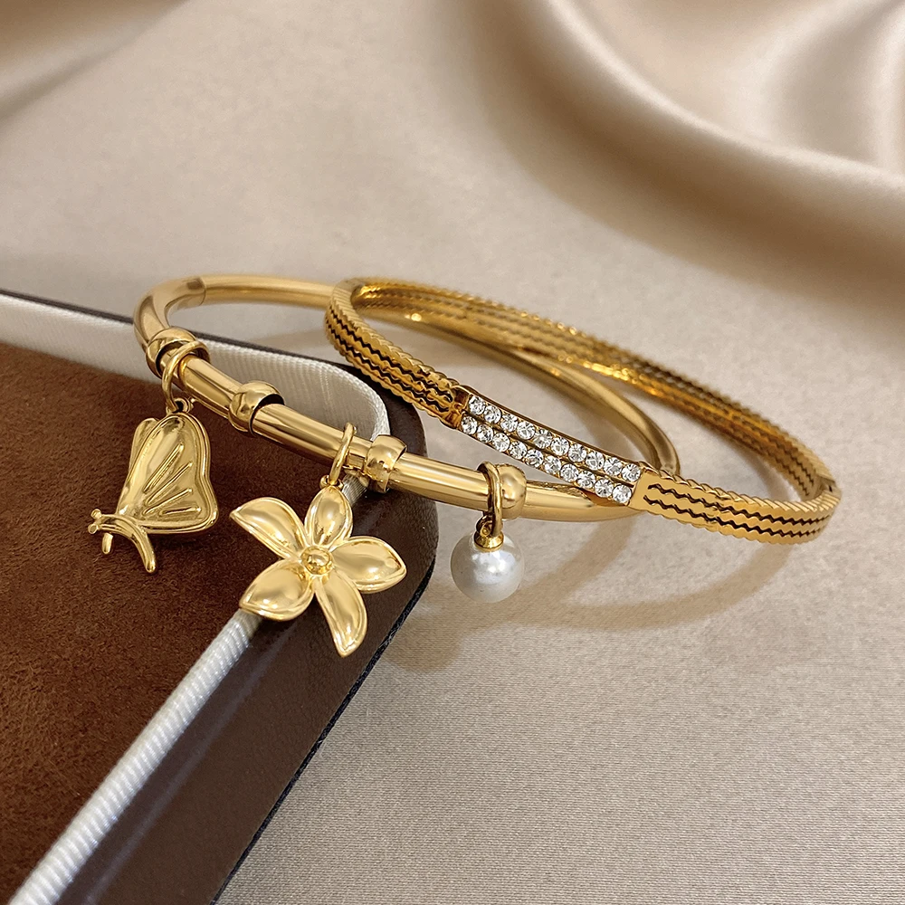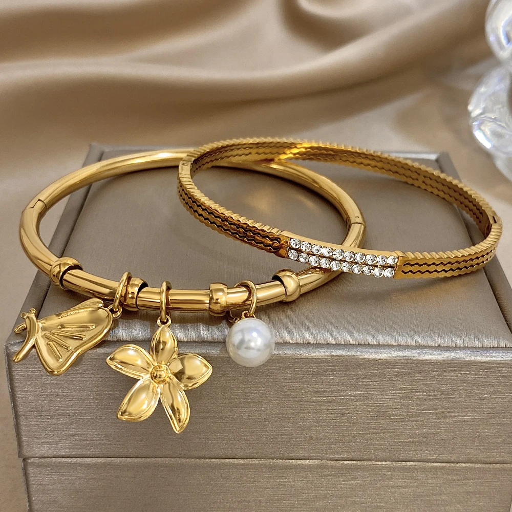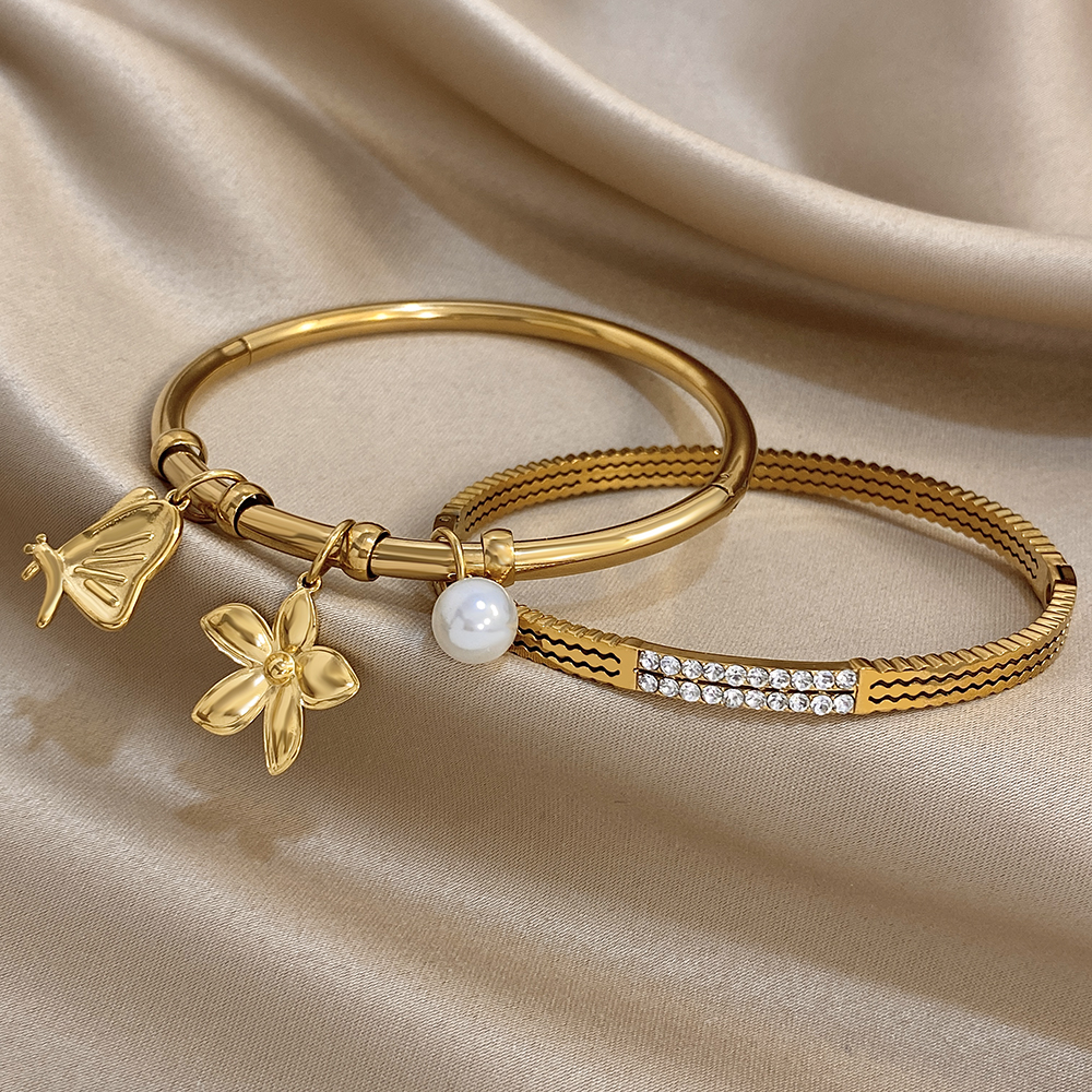 Greatera Double-row Fine Rhinestone Inlaid Cuff Bracelet Flower Pearl Pendant Stainless Steel Unique Open Bangle For Women Men
