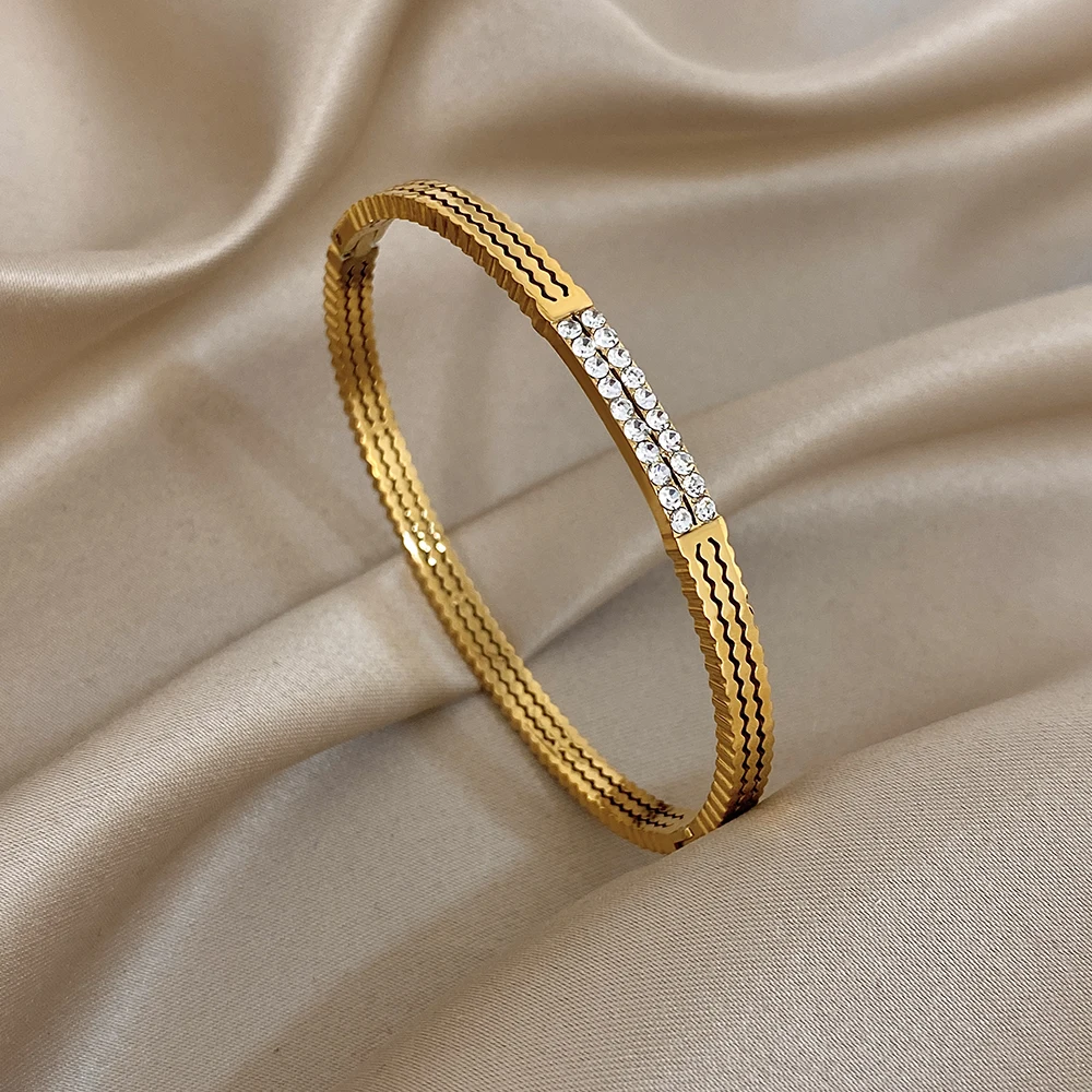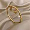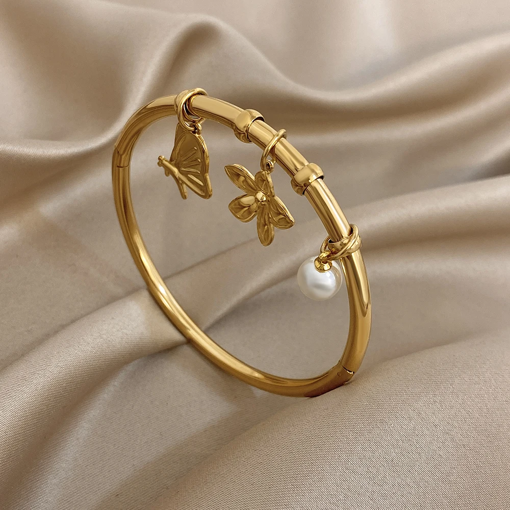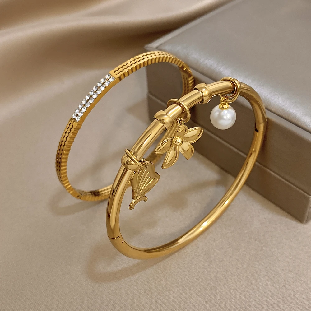 Greatera Double-row Fine Rhinestone Inlaid Cuff Bracelet Flower Pearl Pendant Stainless Steel Unique Open Bangle For Women Men