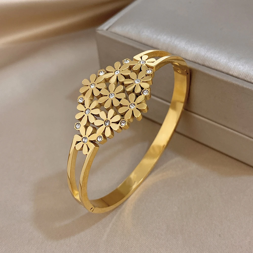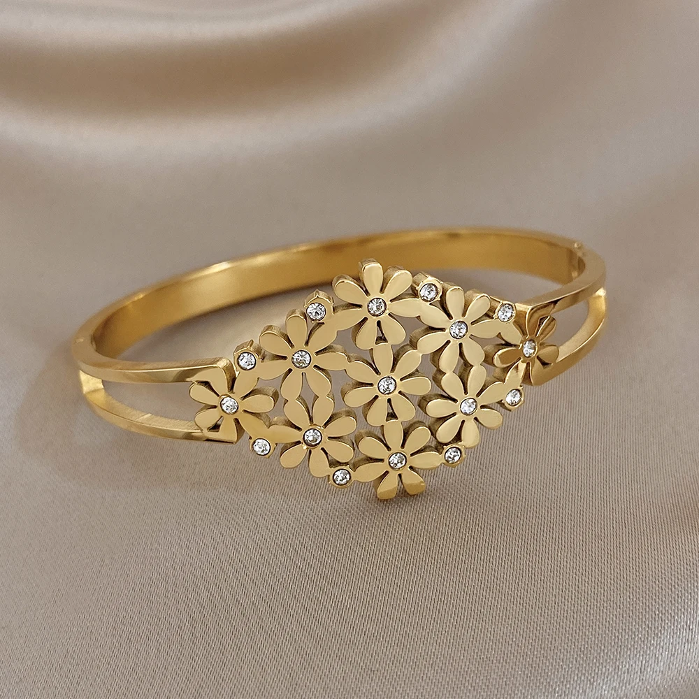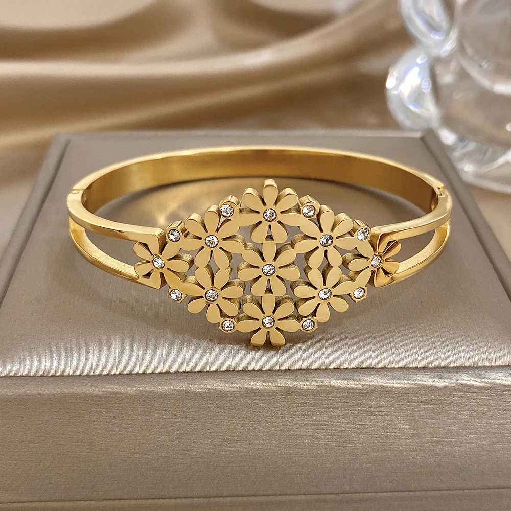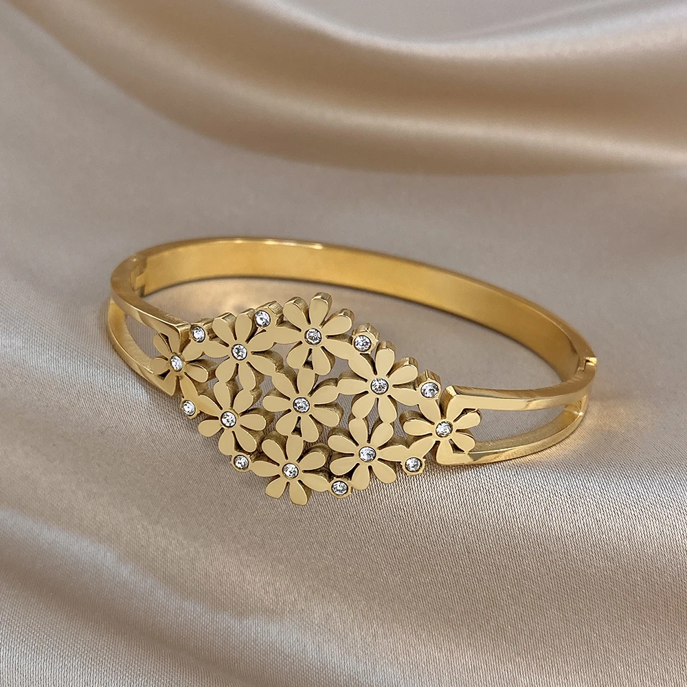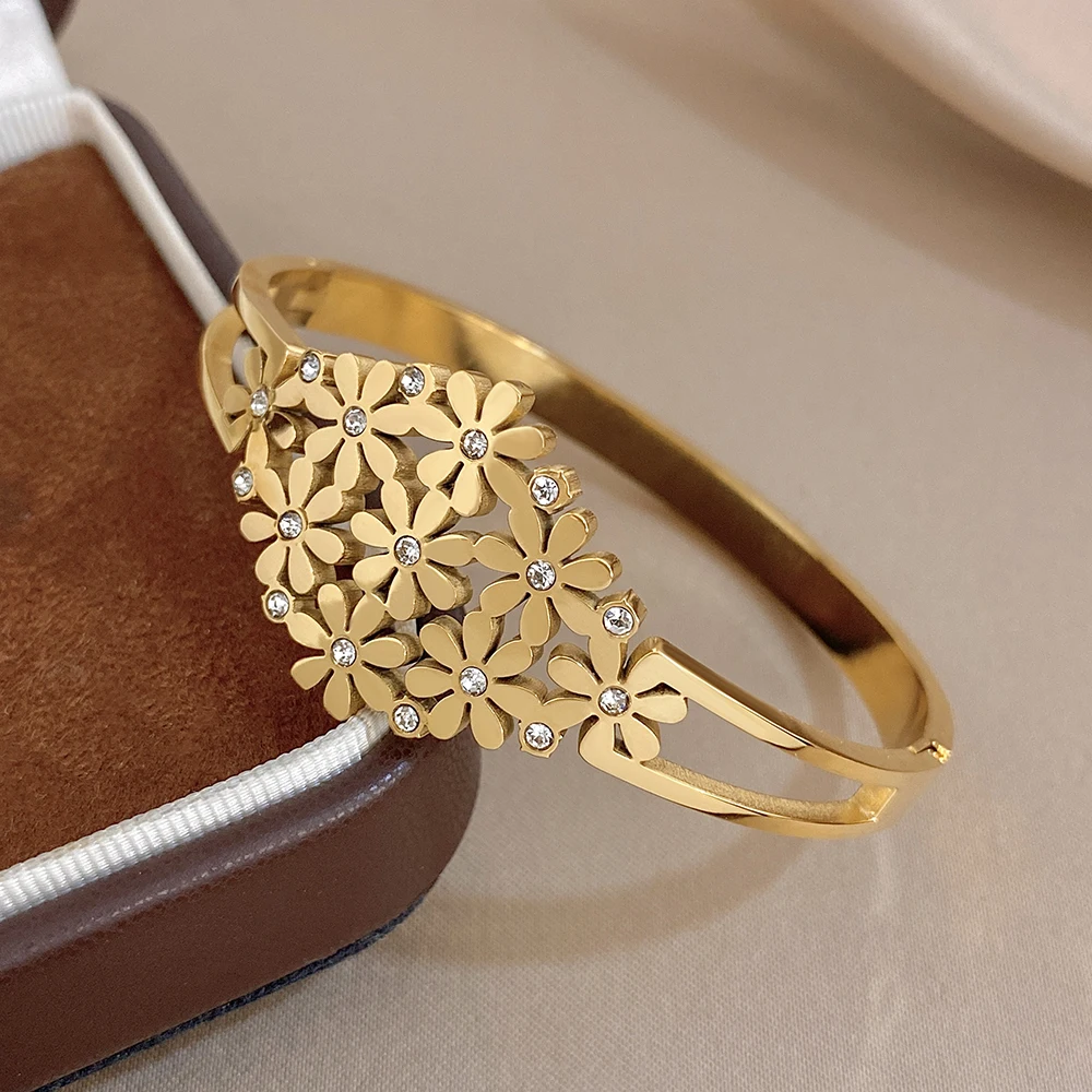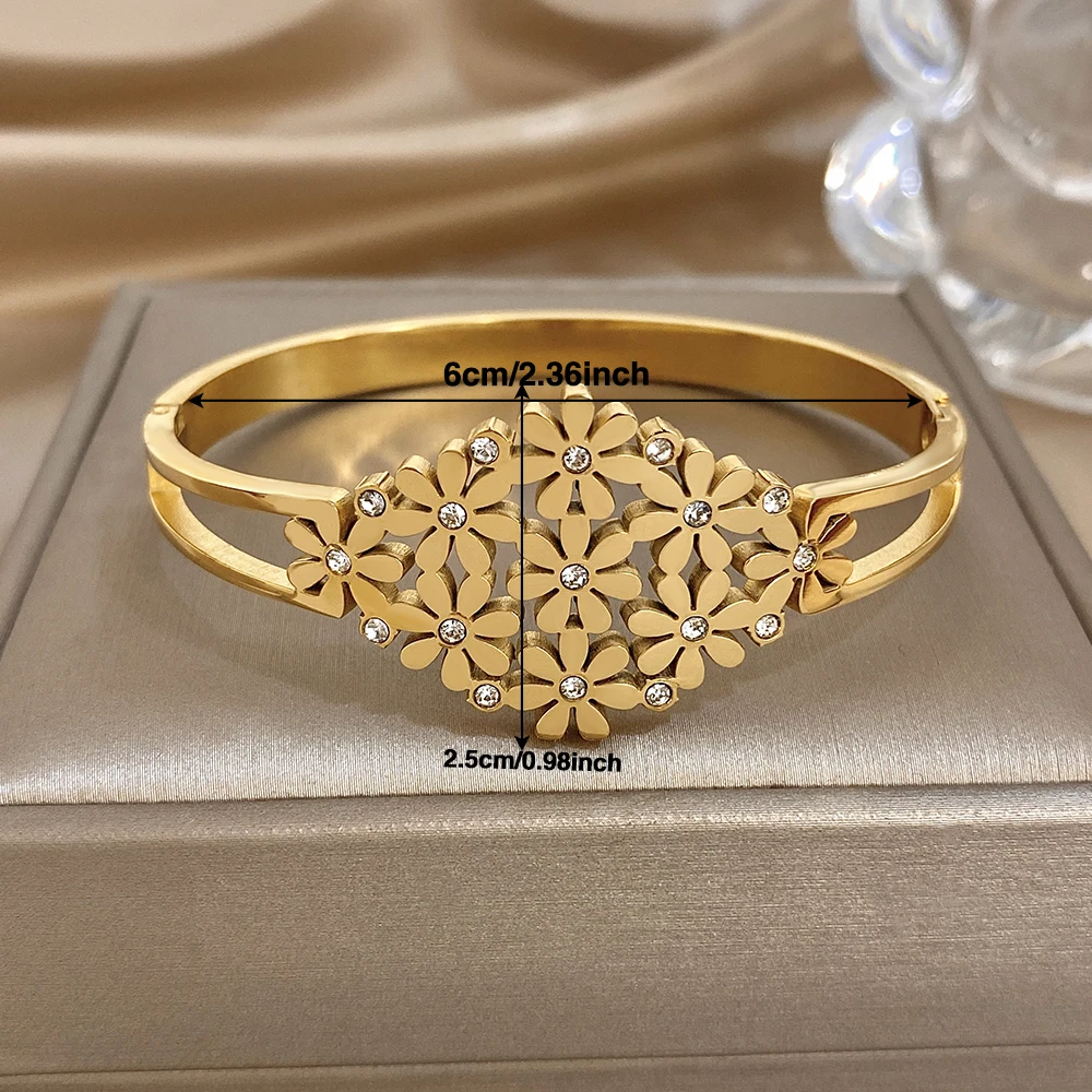 Greatera Flower Cluster Rhinestone Inlaid Cuff Bracelet Light Luxury 316L Stainless Steel Waterproof Women’s Open Bangle Jewelry