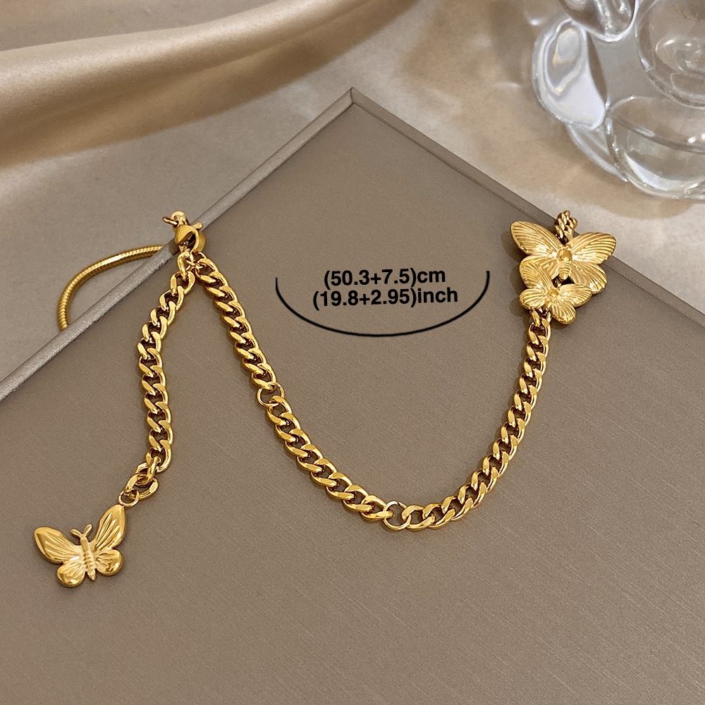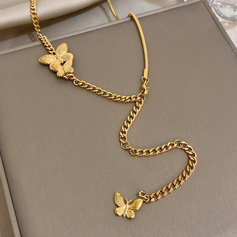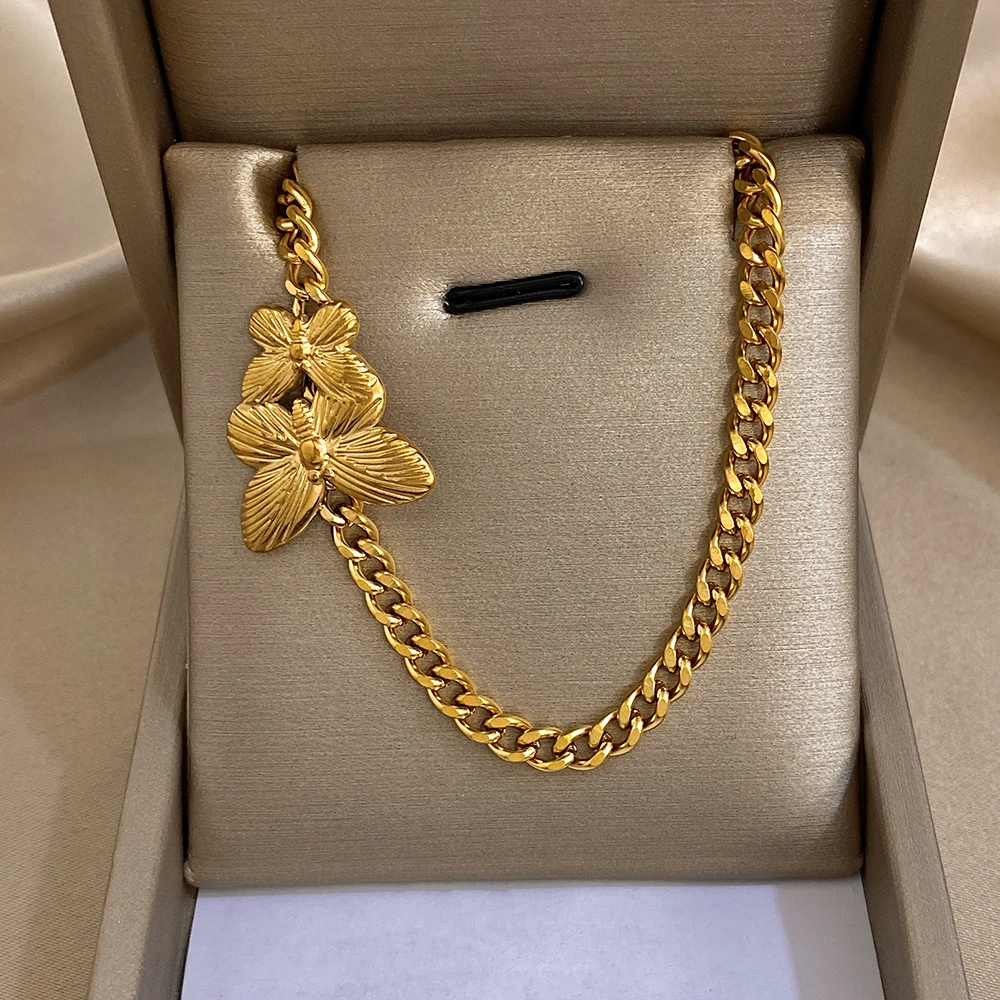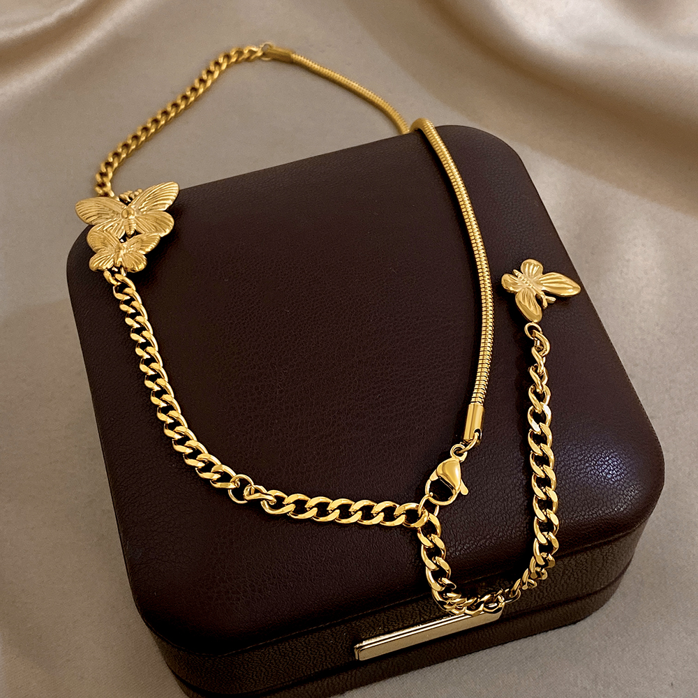 Greatera Golden Stainless Steel Double Butterfly Snake Bone Chain Necklace Niche Design Artistic Waterproof Women Jewelry Party