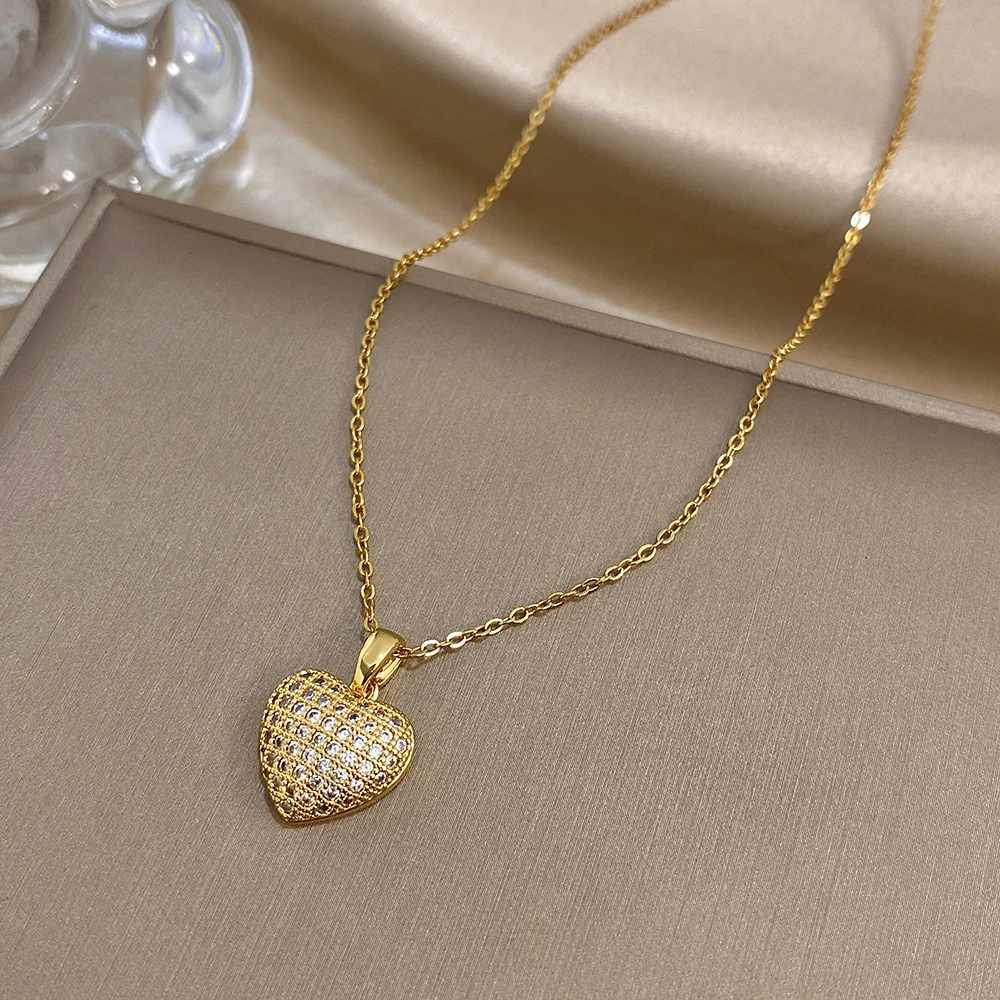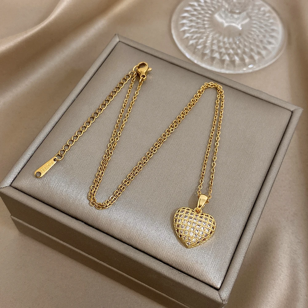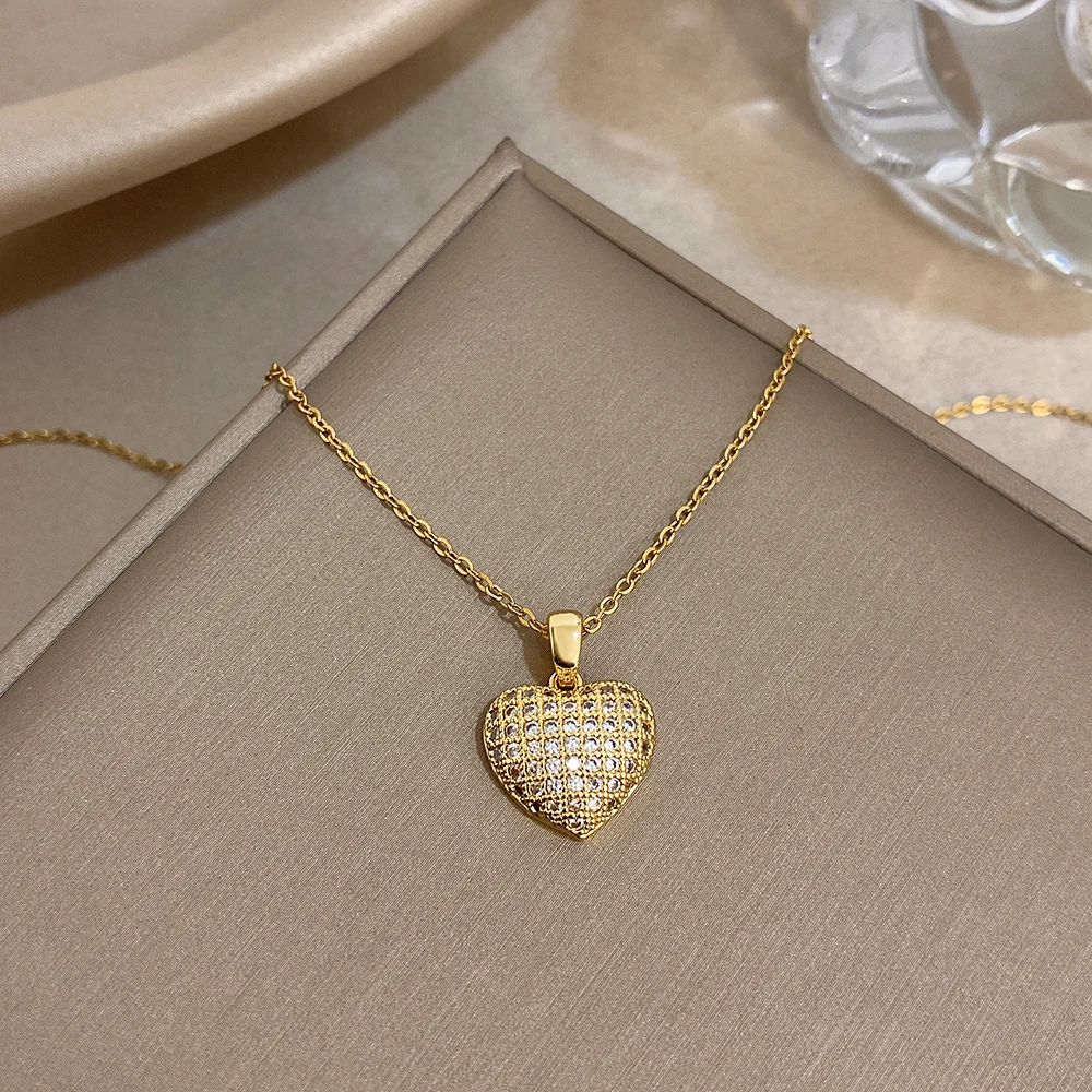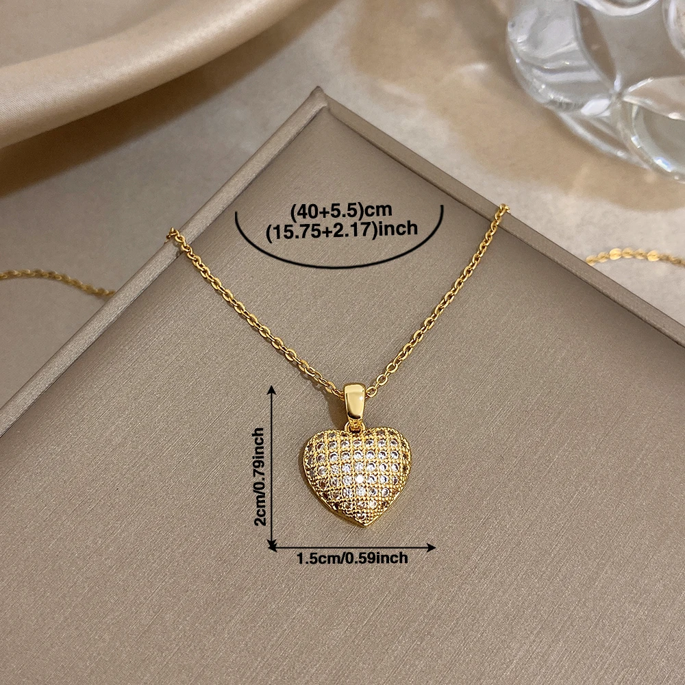 Greatera Heart-shaped Woven Texture Pendant Necklace Luxurious Zircon Versatile Plated Gold Clavicle Chain Valentine’s Day Gifts