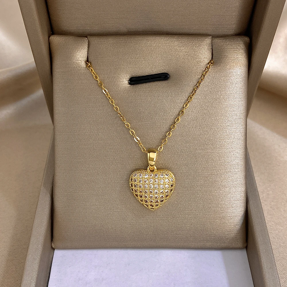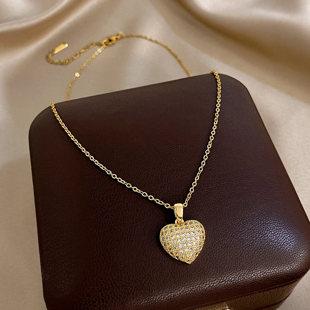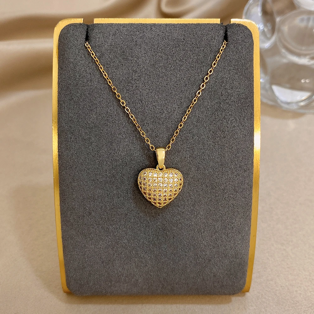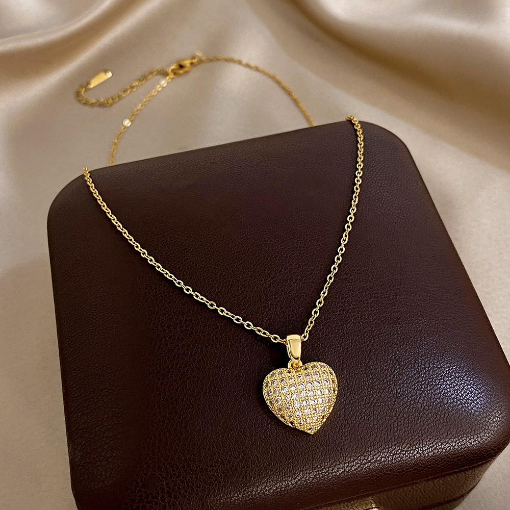 Greatera Heart-shaped Woven Texture Pendant Necklace Luxurious Zircon Versatile Plated Gold Clavicle Chain Valentine’s Day Gifts