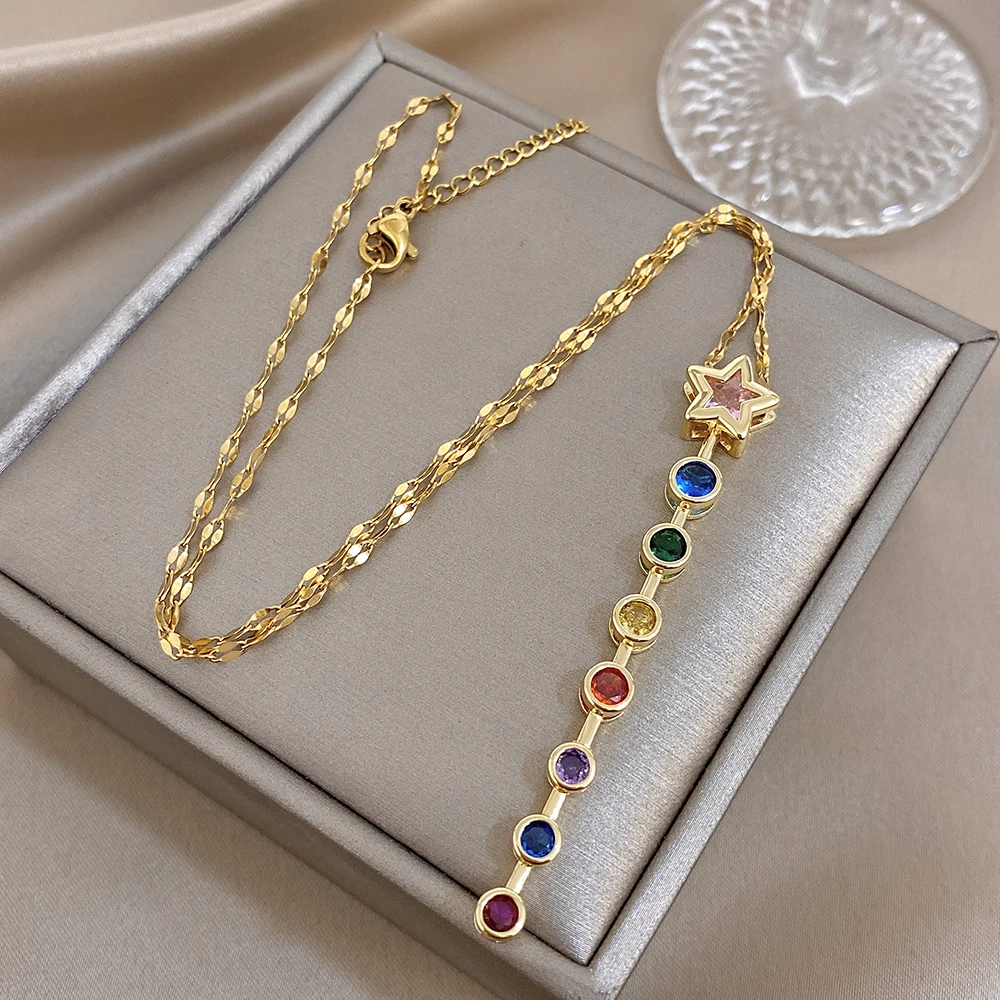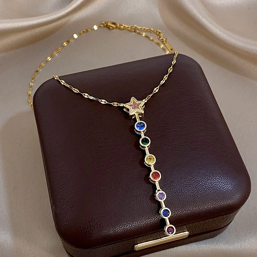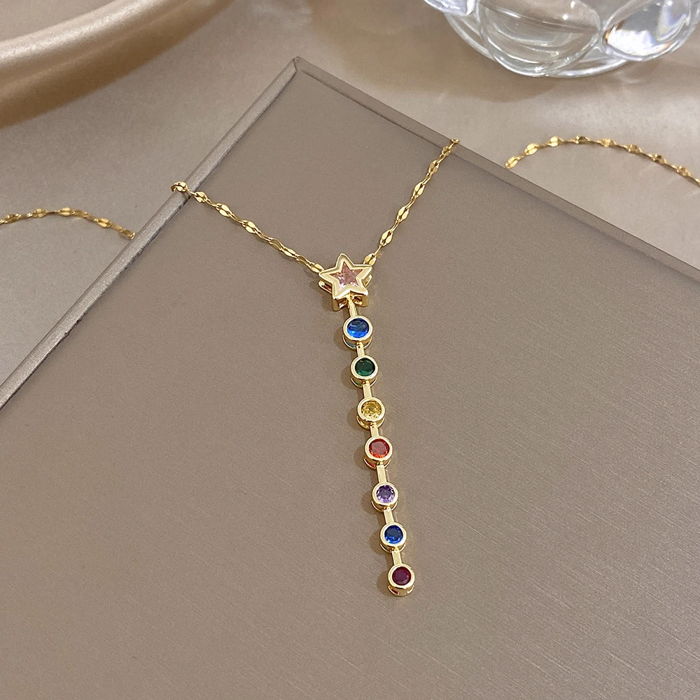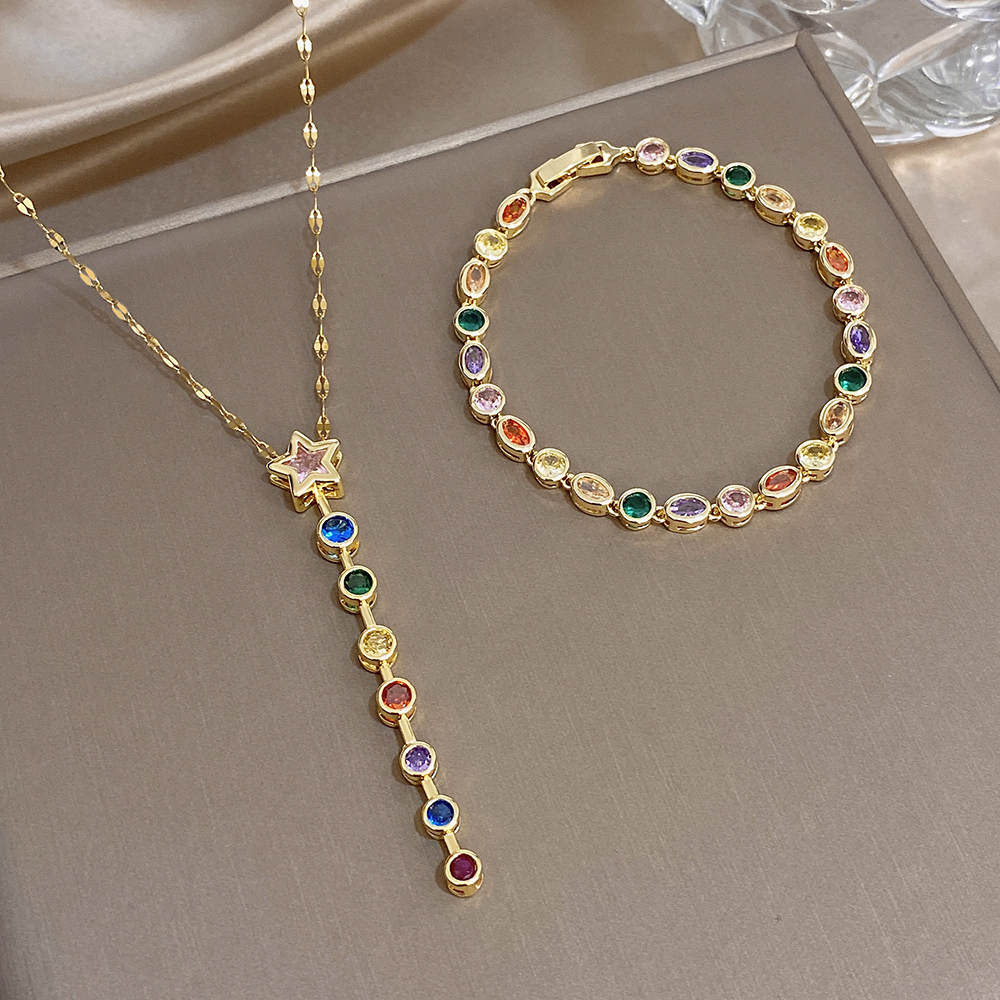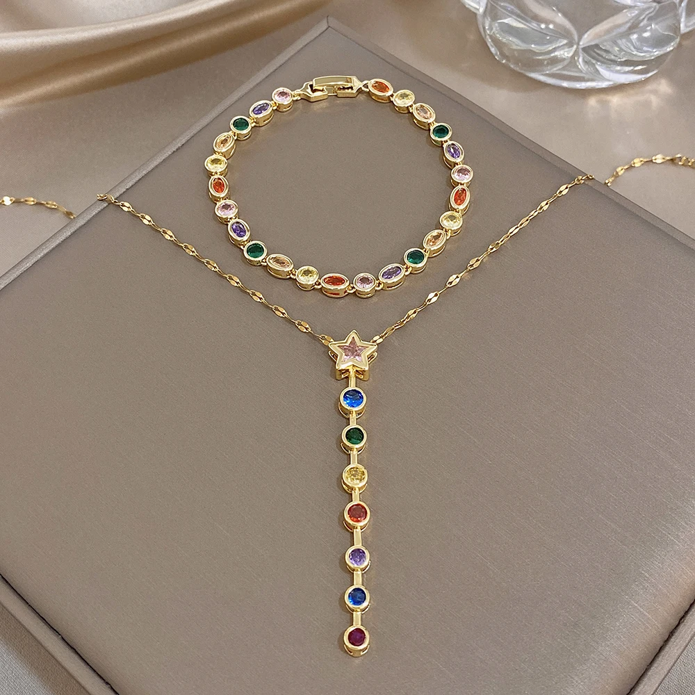 Greatera Oval Spliced Bracelet Five-pointed Star Colorful Zirconium Pendant Necklace Fashion Y-shaped Long Tassel Jewelry Party