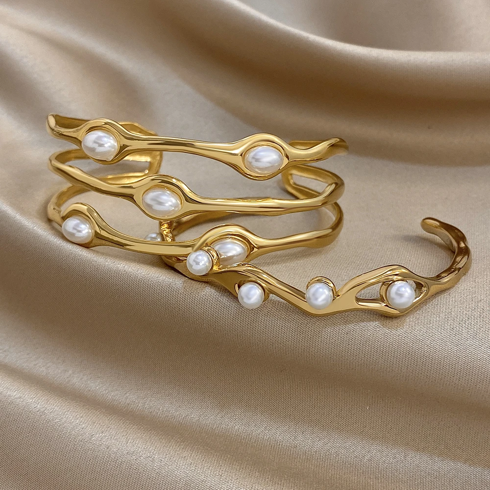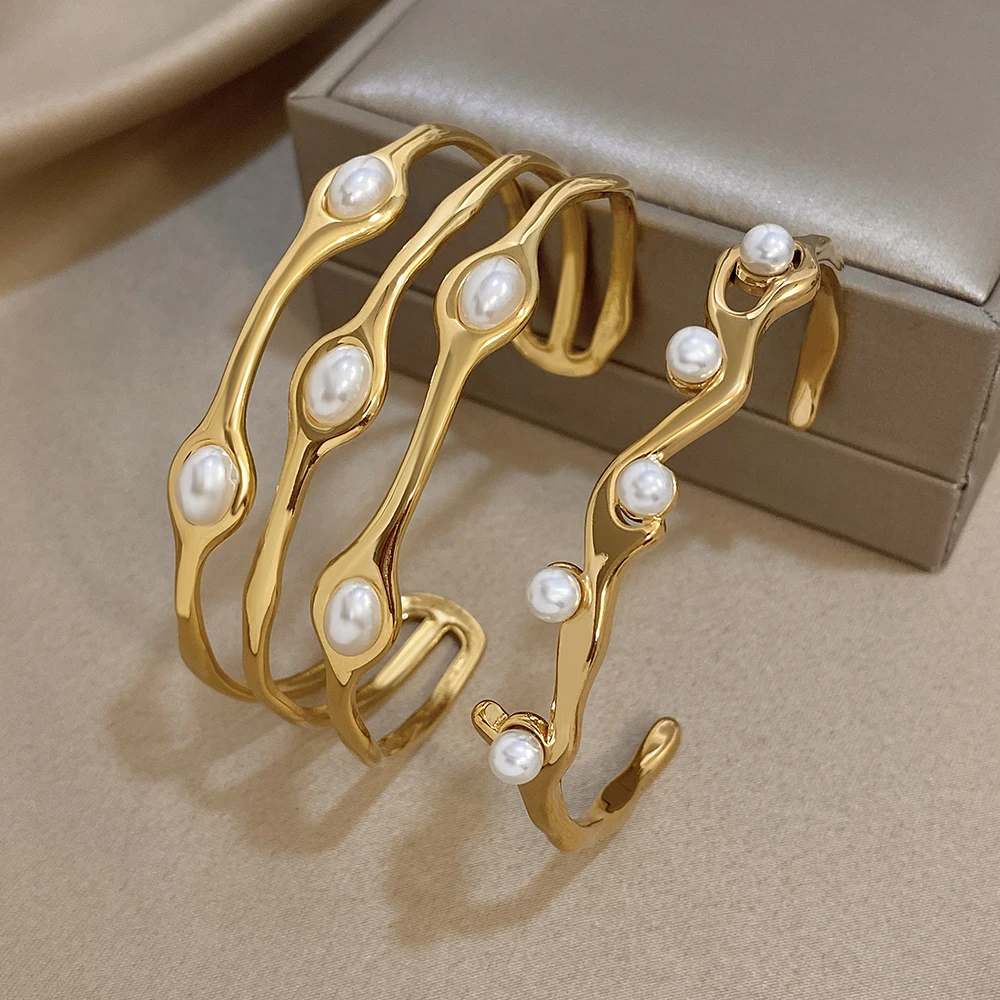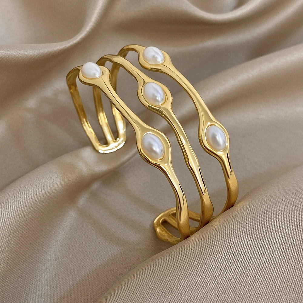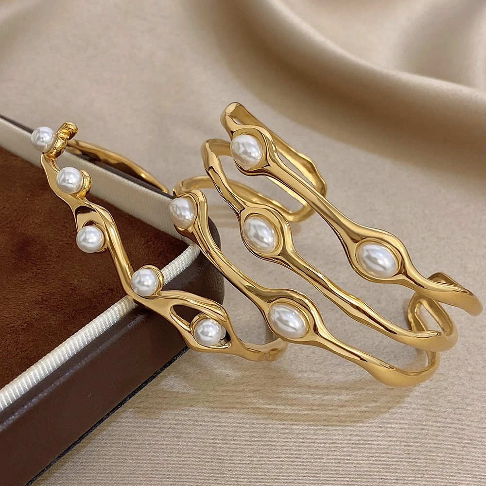 Greatera Pearl Wavy Branch Stainless Steel Bracelet For Women Chunky Three-layer Ellipse Hollow Design Exaggerate Bangle Jewelry