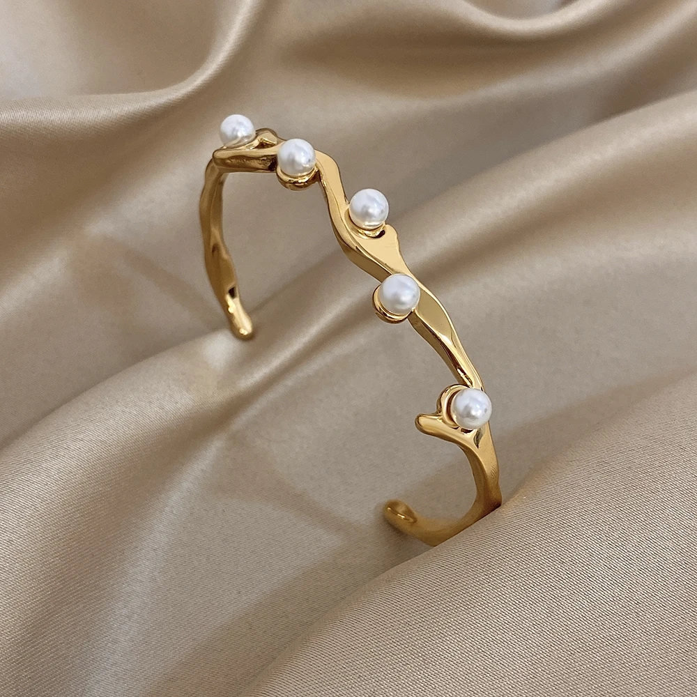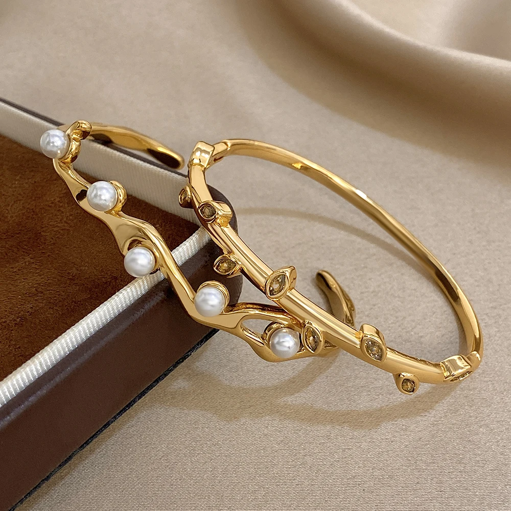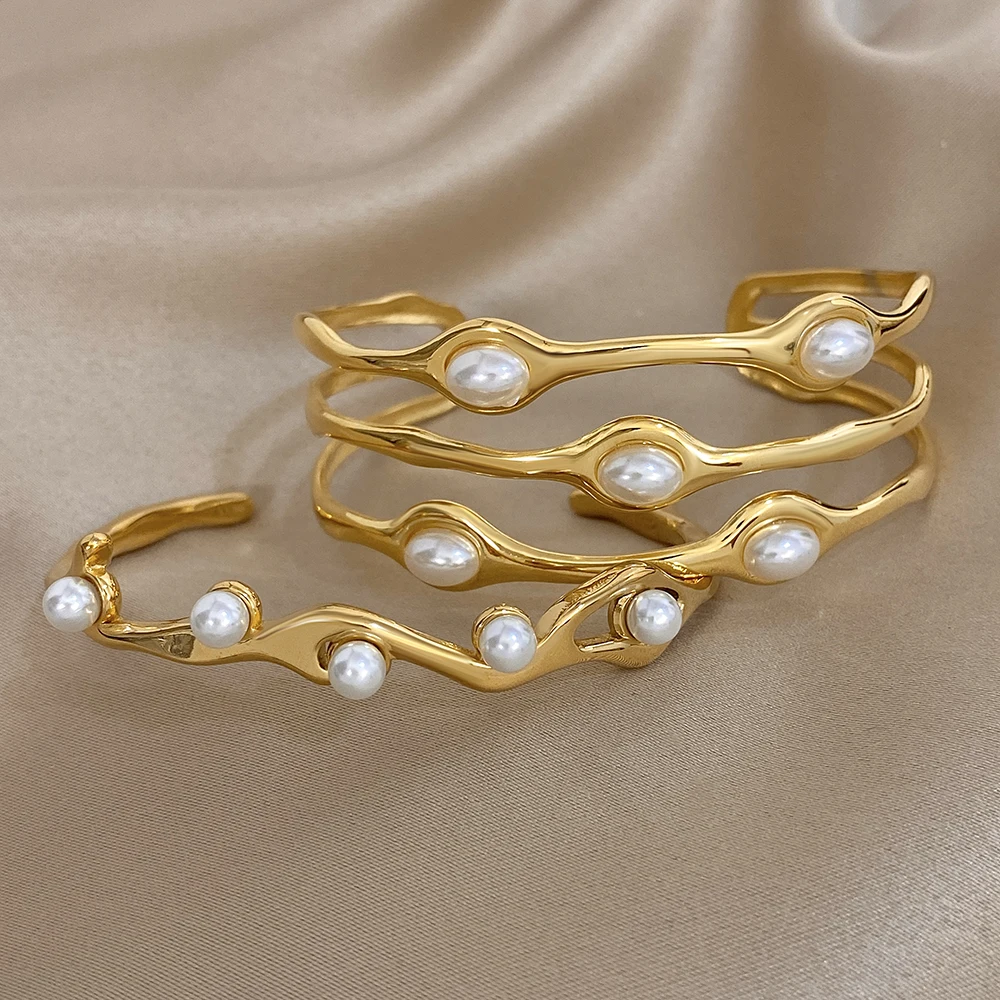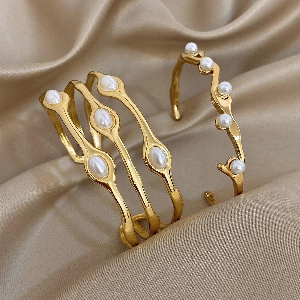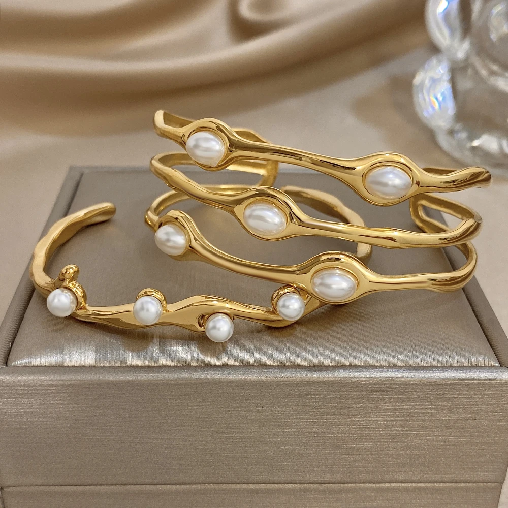 Greatera Pearl Wavy Branch Stainless Steel Bracelet For Women Chunky Three-layer Ellipse Hollow Design Exaggerate Bangle Jewelry