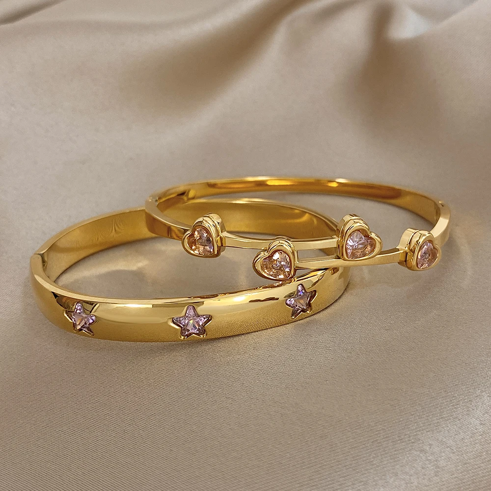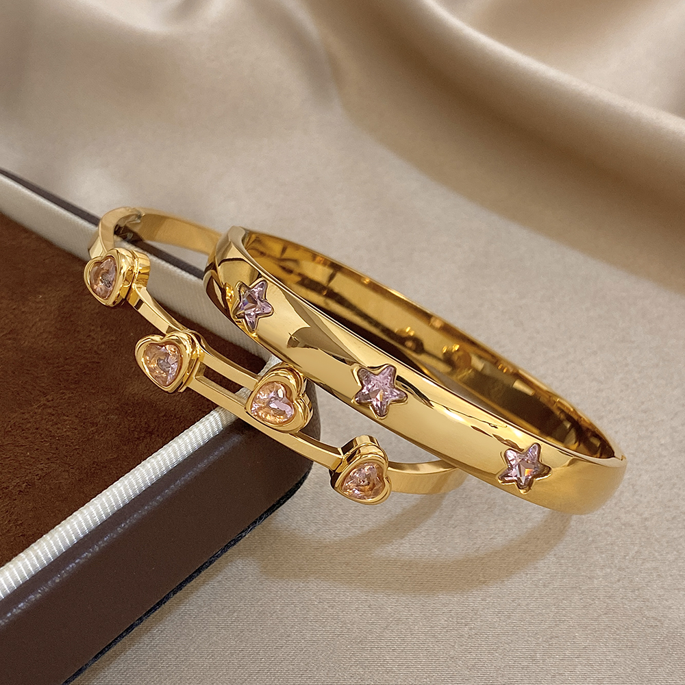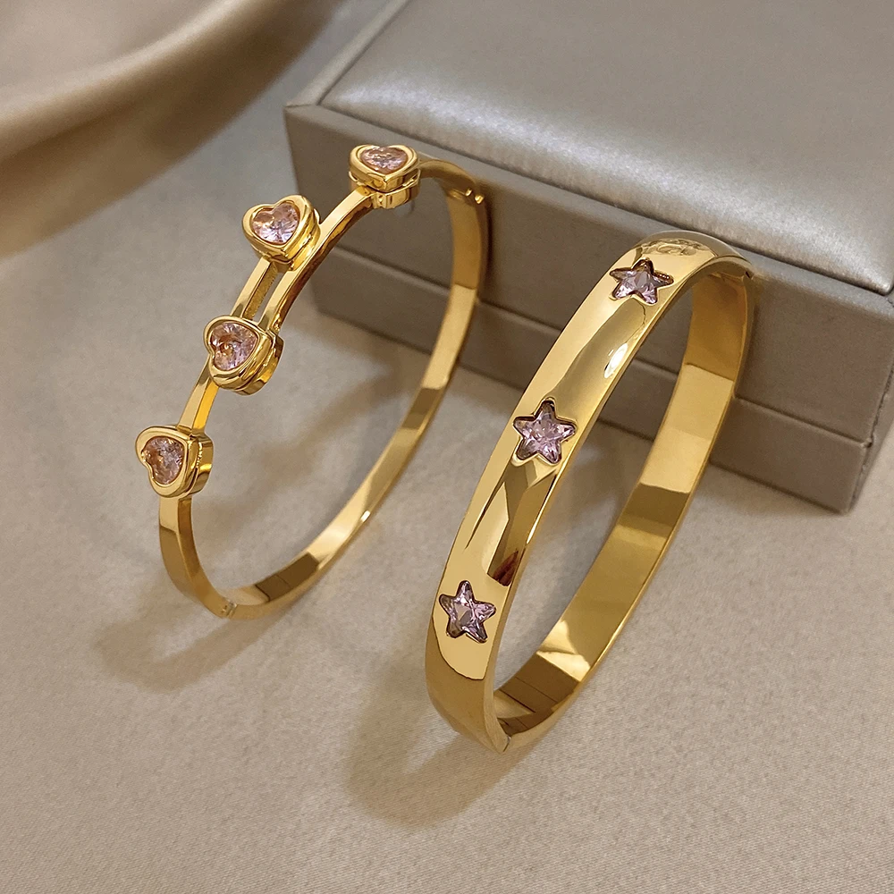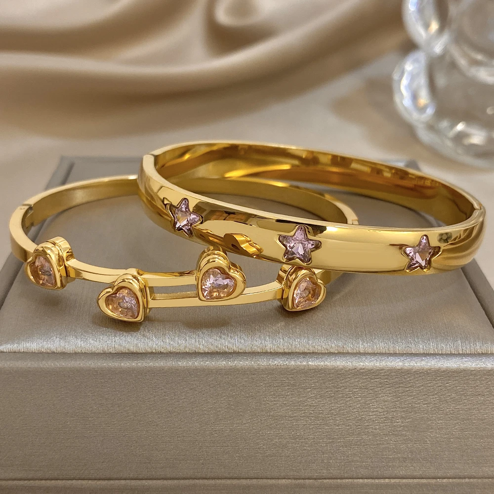 Greatera Pink Rhinestone Valentine’s Day Gift Cuff Bangle For Women Trendy Heart Star Shape Zircon Inlaid Popular Cool Bracelet