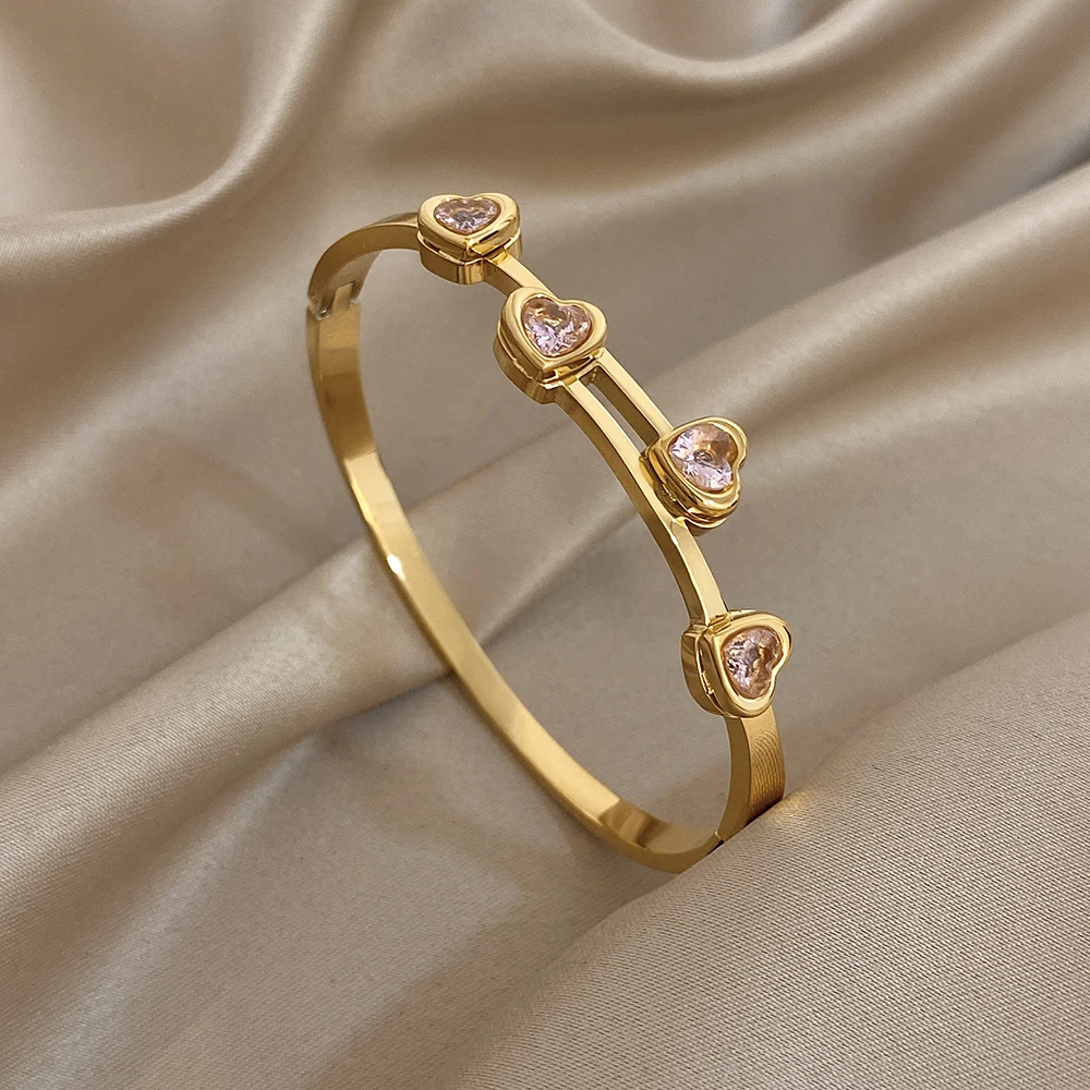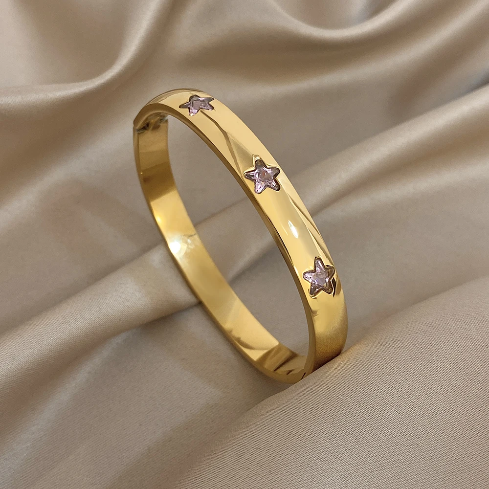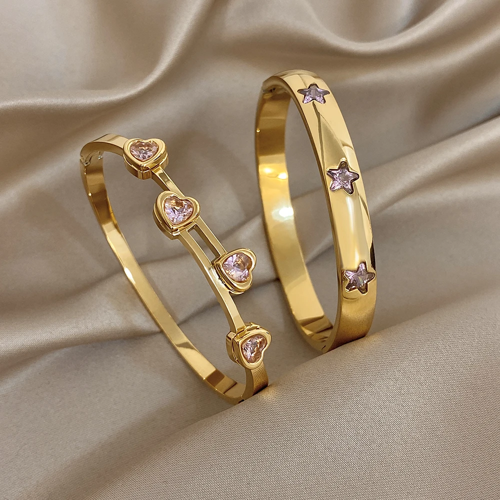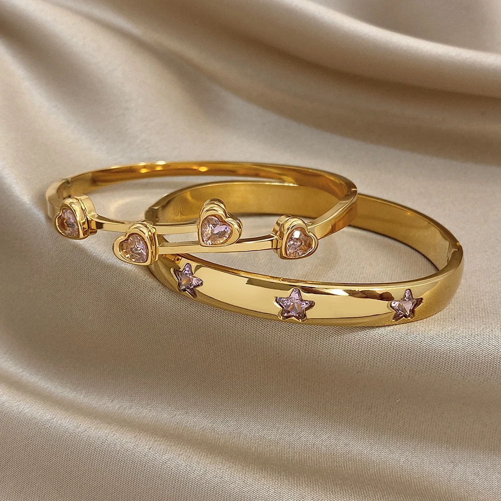Greatera Pink Rhinestone Valentine’s Day Gift Cuff Bangle For Women Trendy Heart Star Shape Zircon Inlaid Popular Cool Bracelet