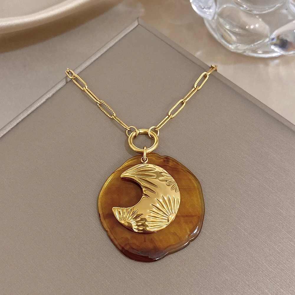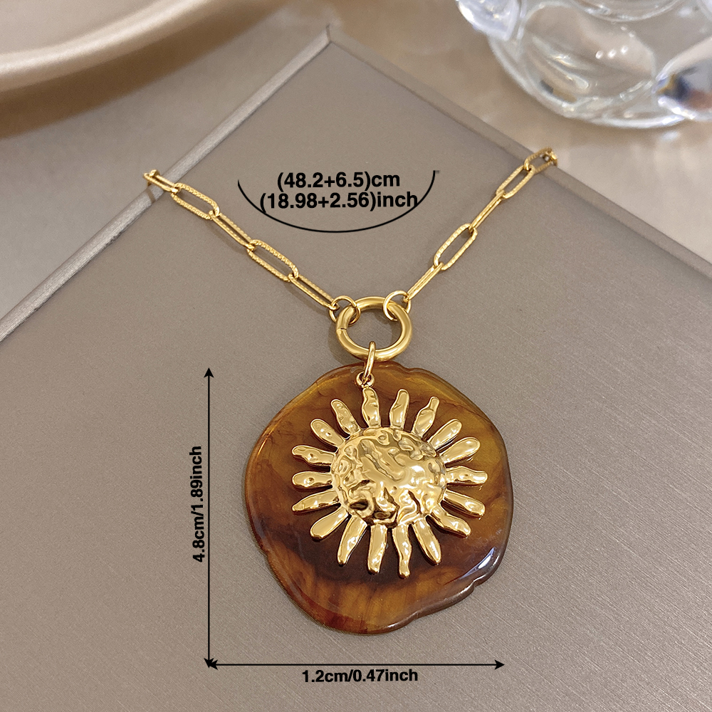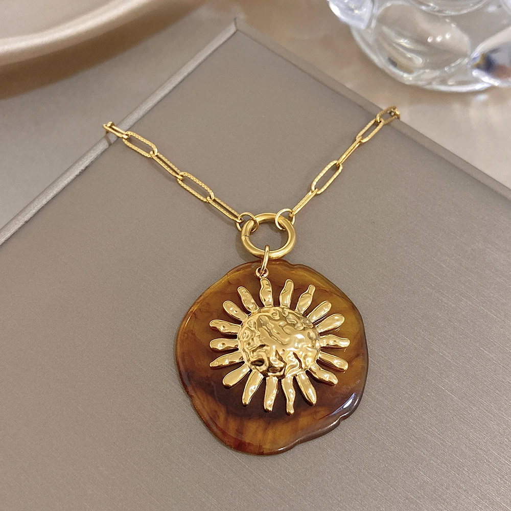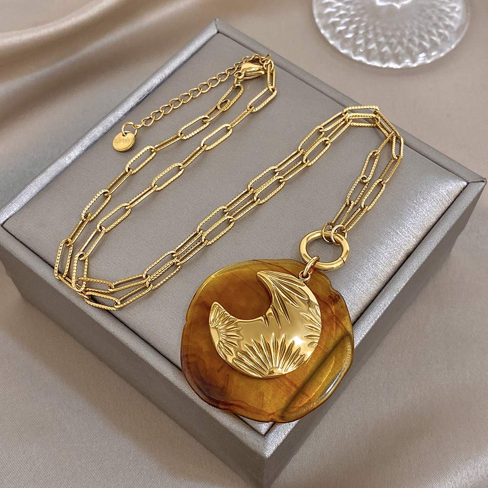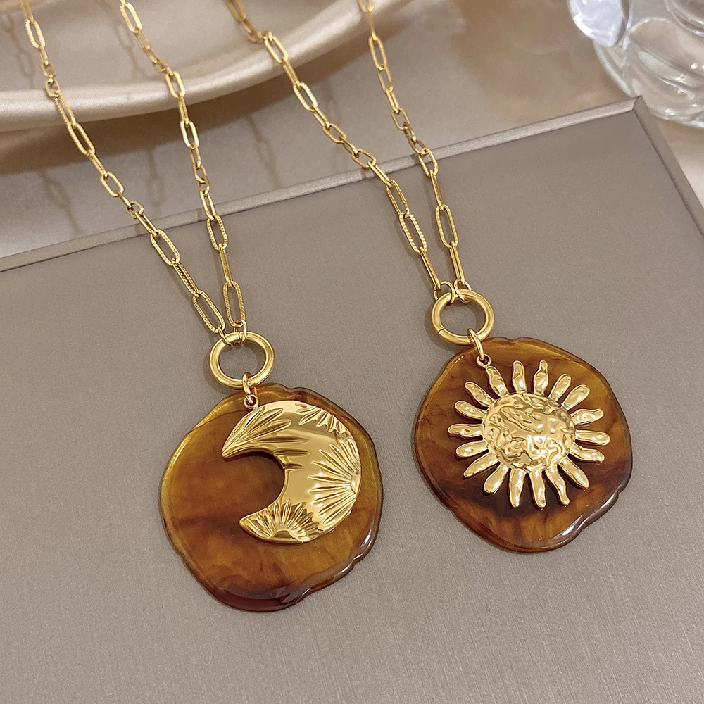 Greatera Retro Amber Pattern Moon Sun Pendant Necklace Round Design Niche Stainless Steel Waterproof Women’s New Style Jewelry
