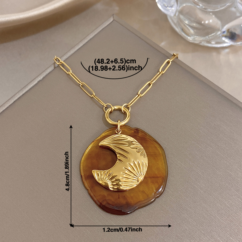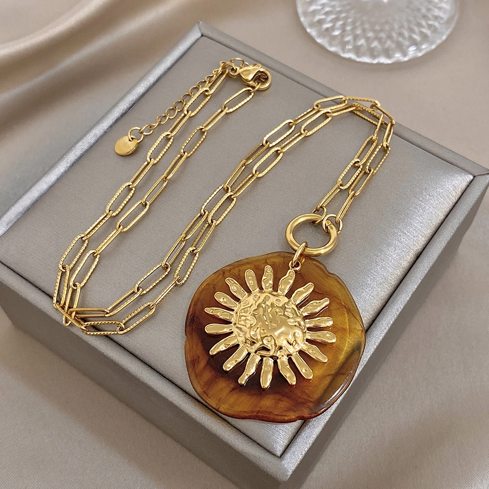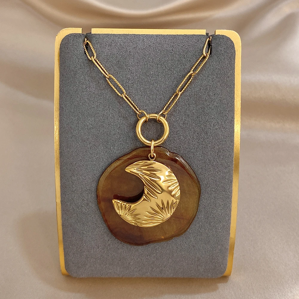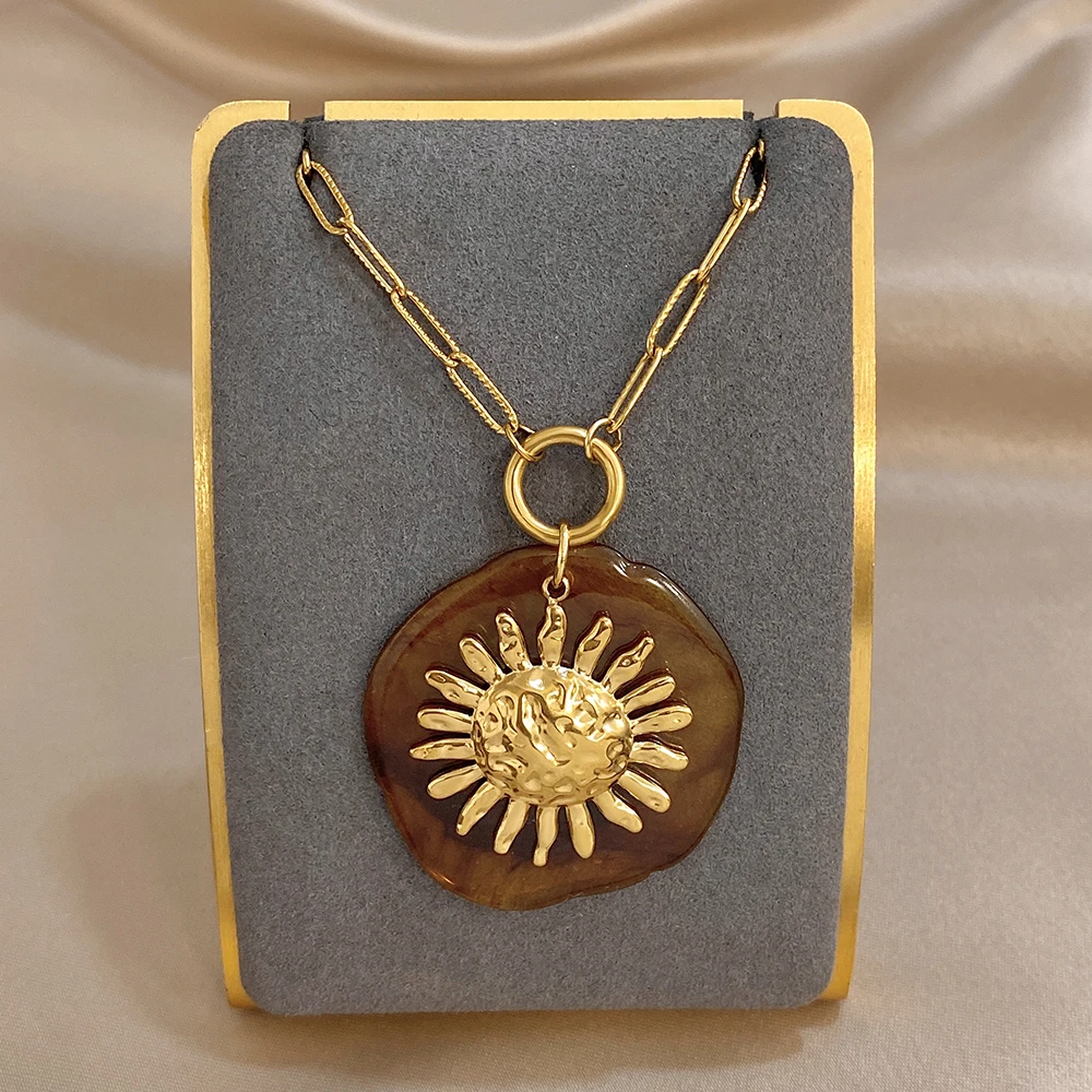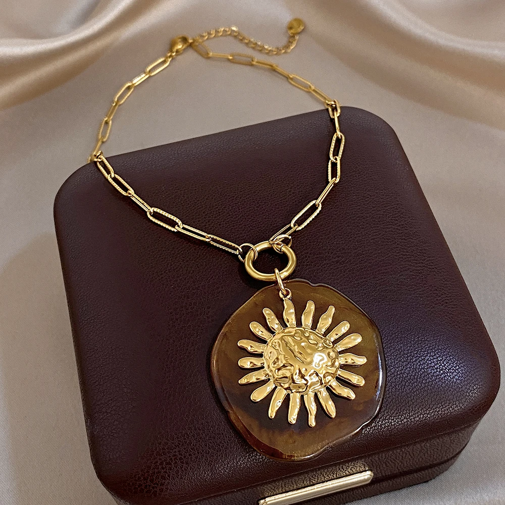 Greatera Retro Amber Pattern Moon Sun Pendant Necklace Round Design Niche Stainless Steel Waterproof Women’s New Style Jewelry