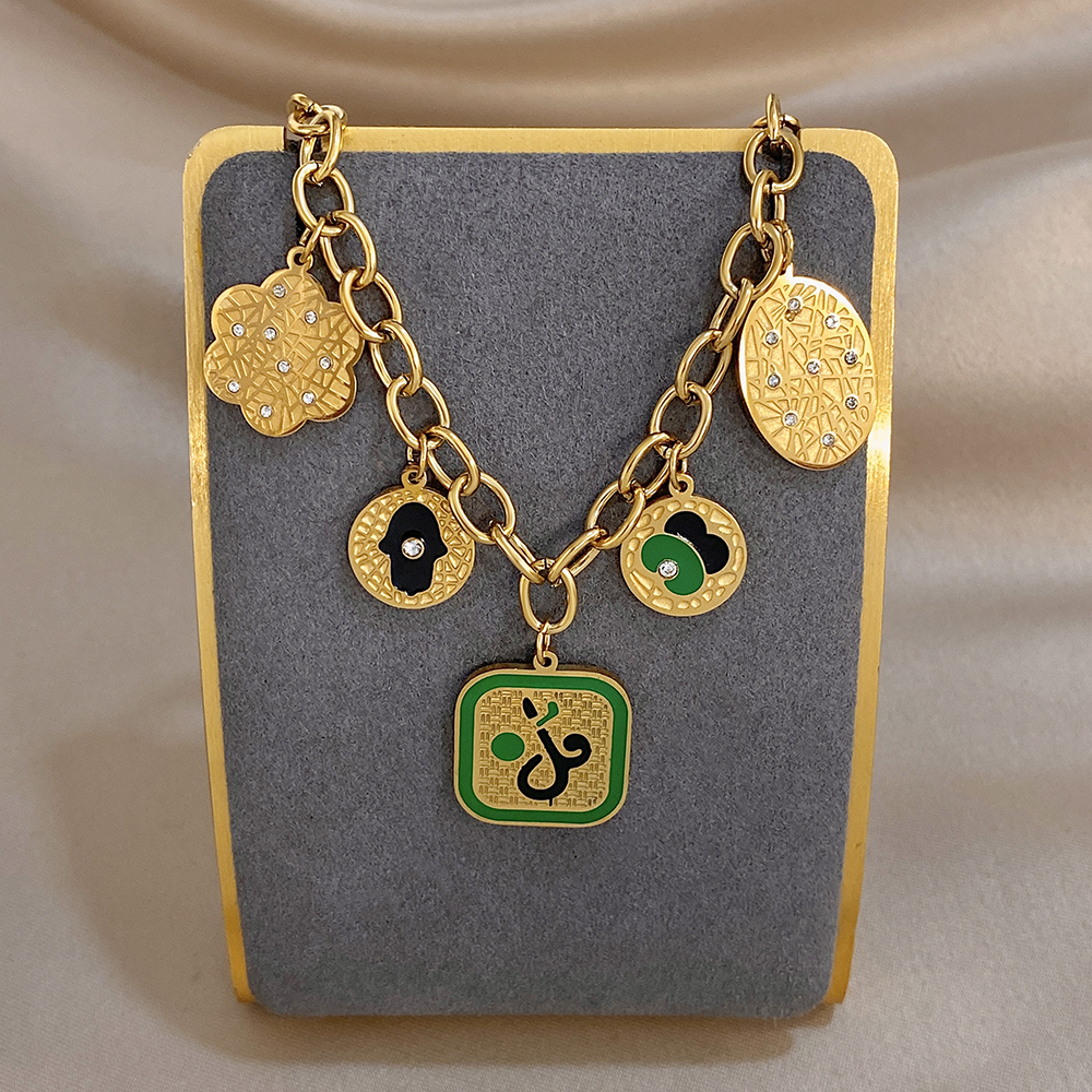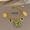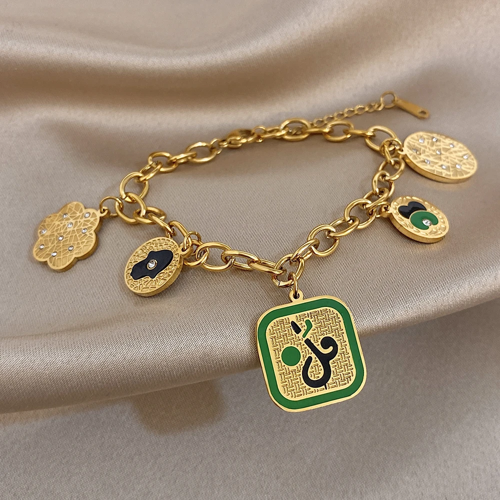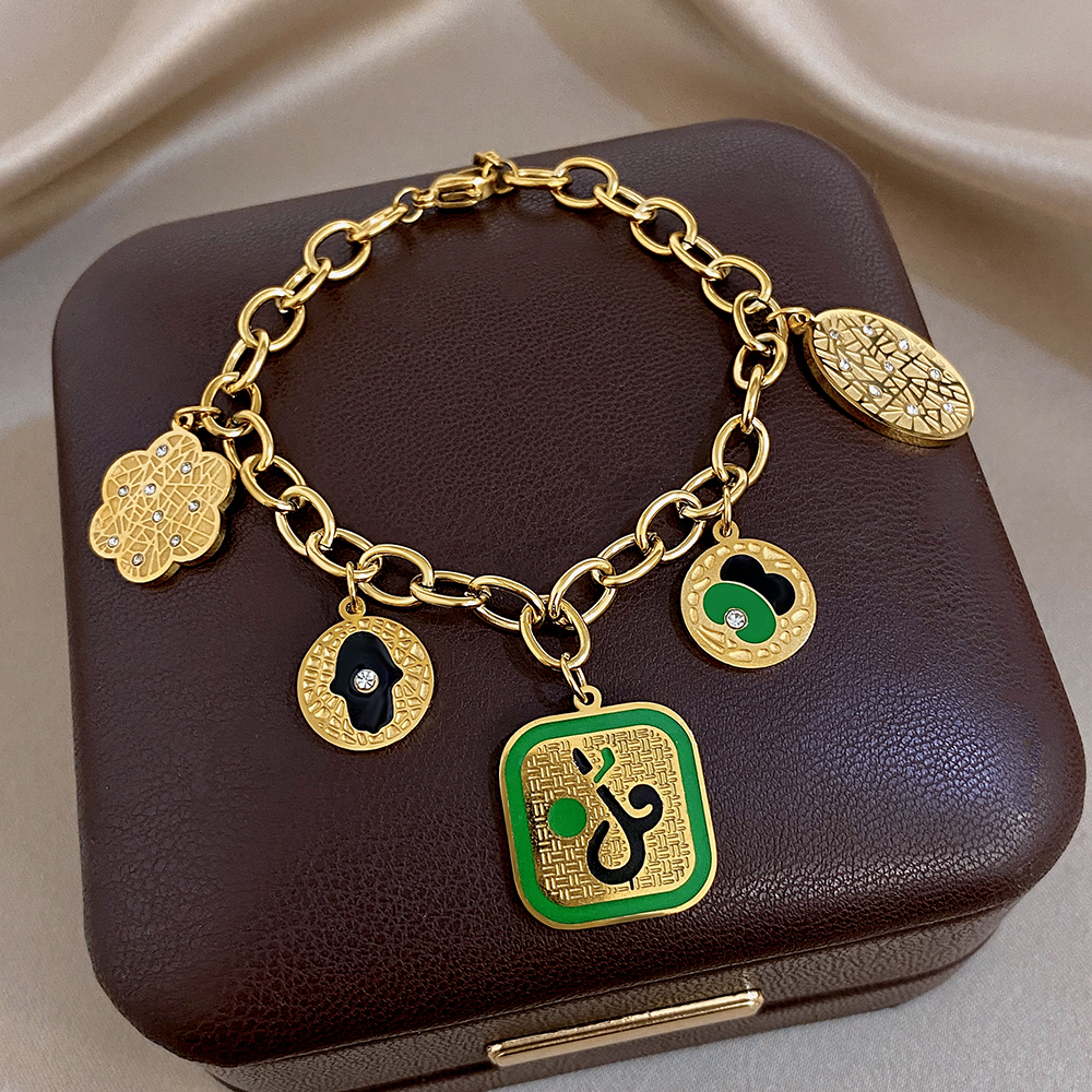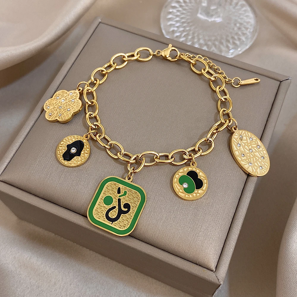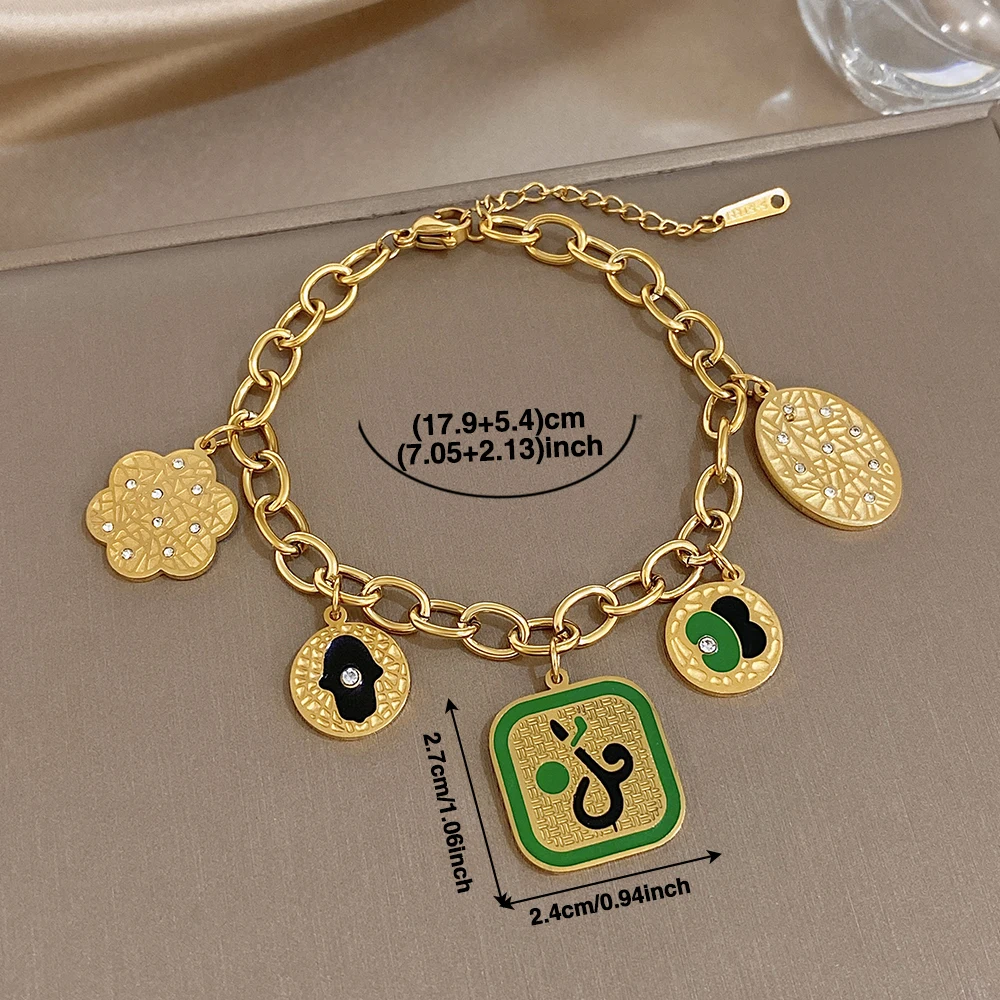Greatera Small Flower Badge Multi-pendant Bracelet Green Enamel Oil Drop Stainless Steel Chain Men Women’s Rhinestone Bangle INS