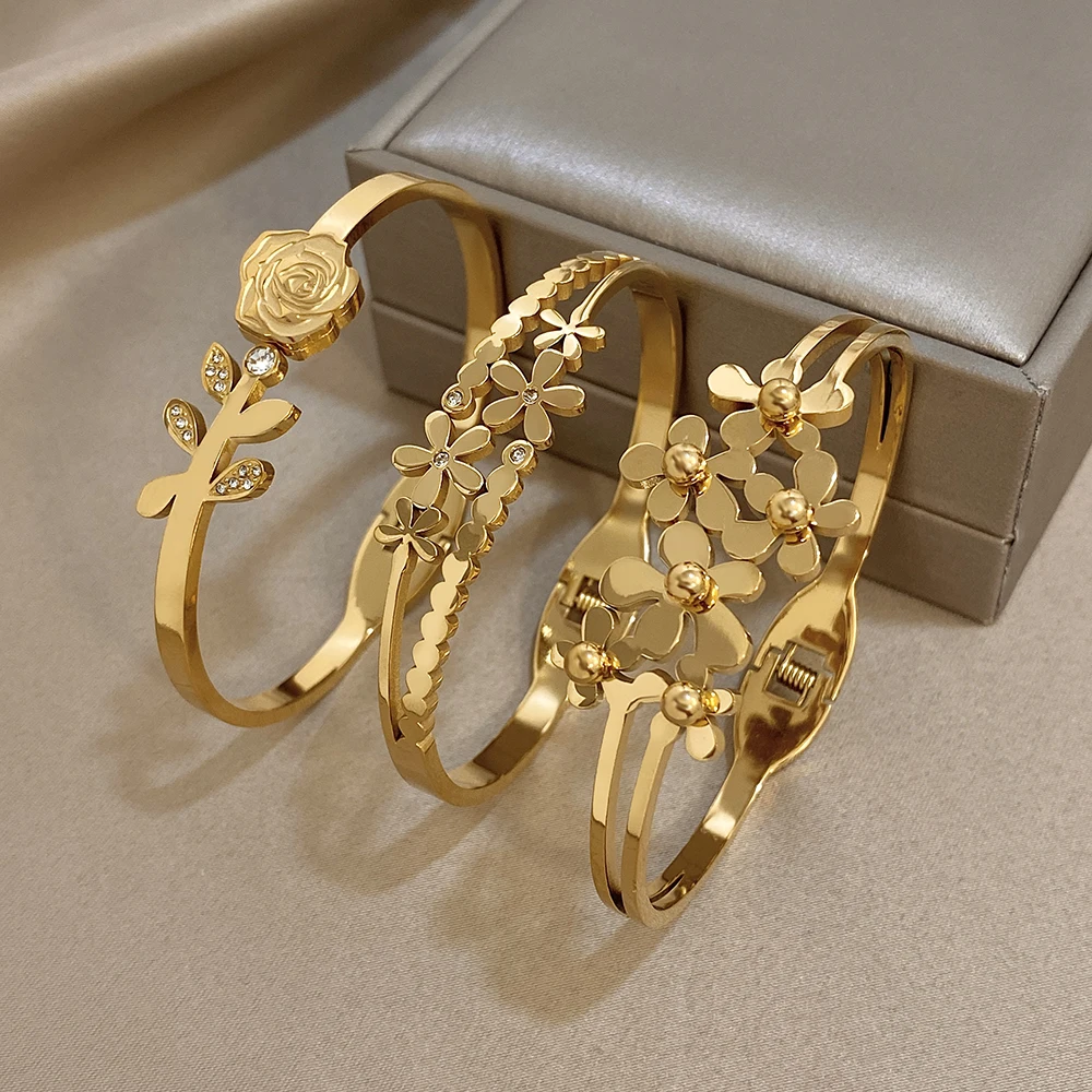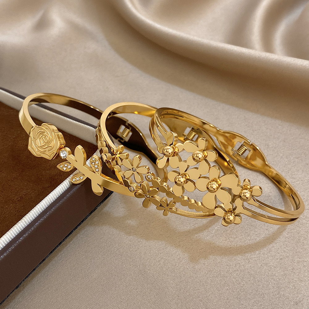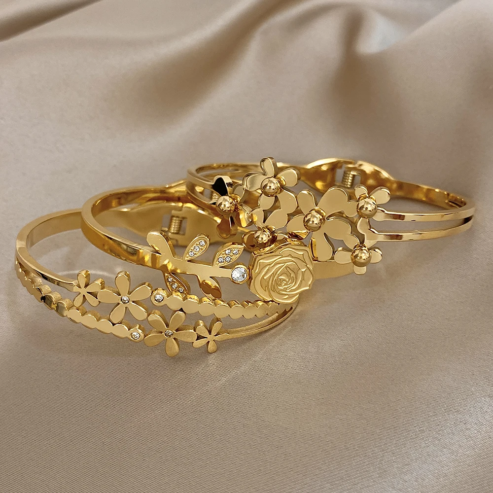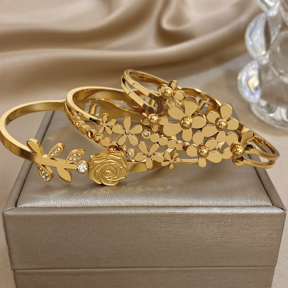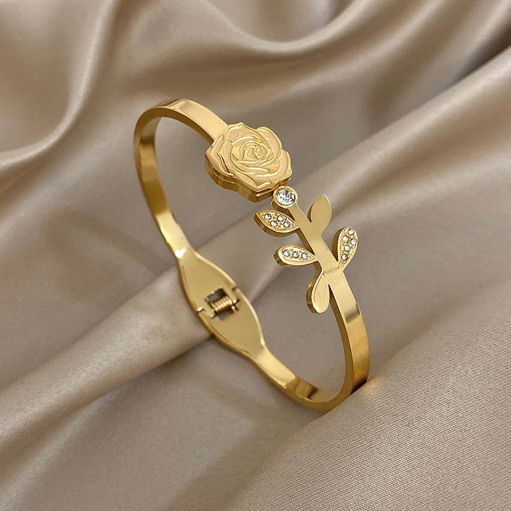 Greatera Small Rose Flower-studded Rhinestone Inlaid Cuff Bracelet Gold Color Stainless Steel Series High-end Women’s Bangle New