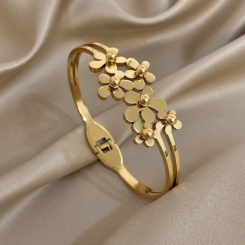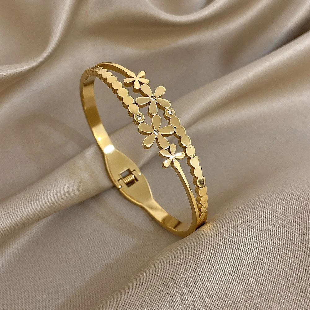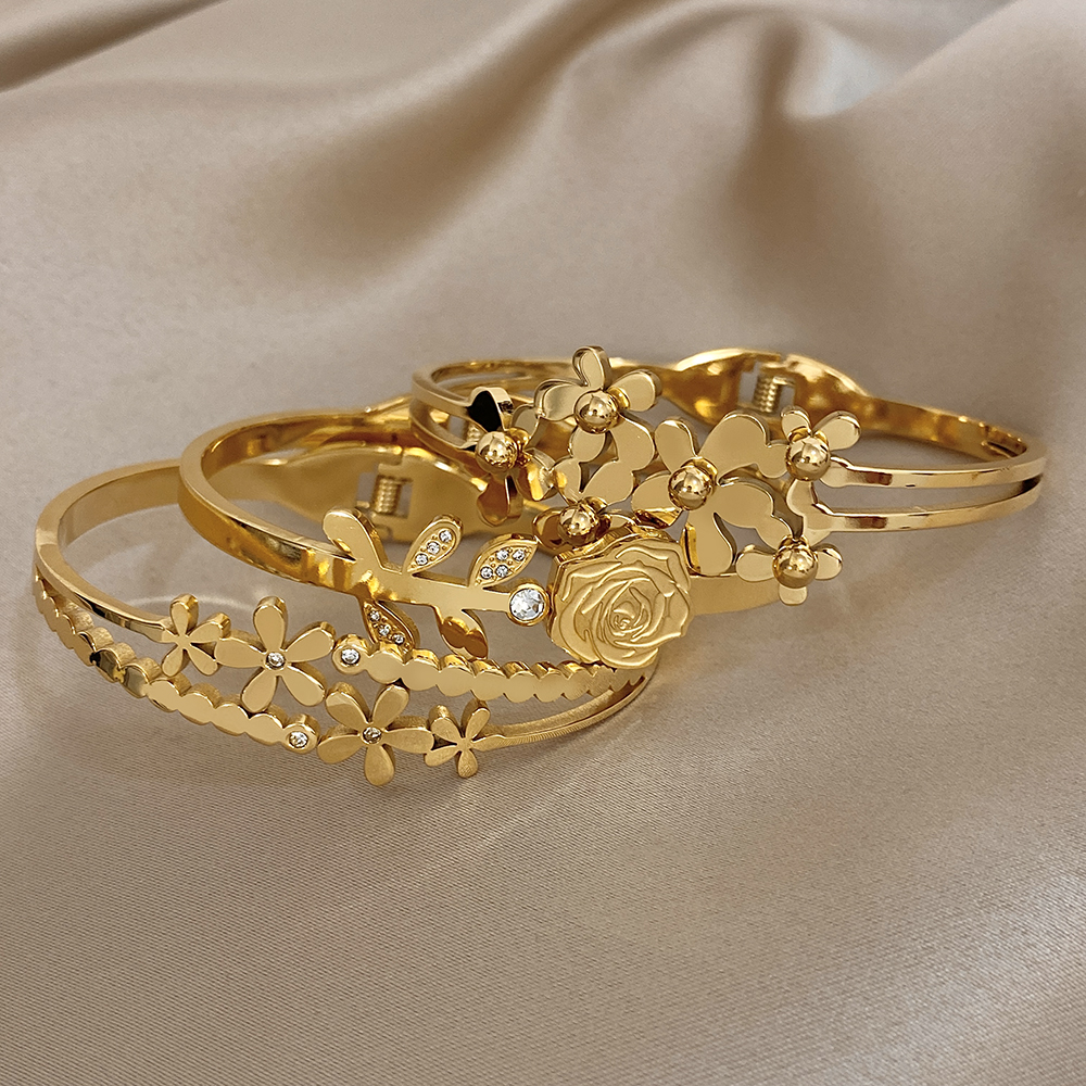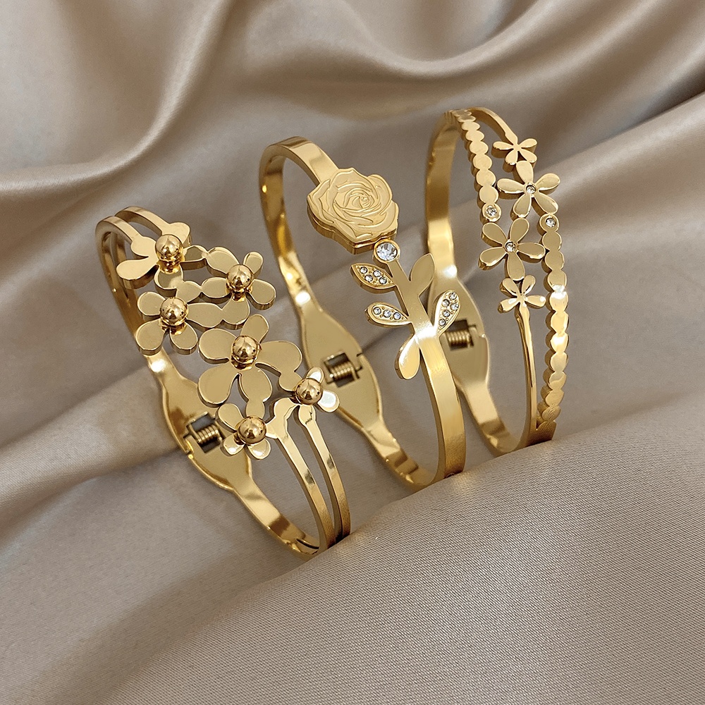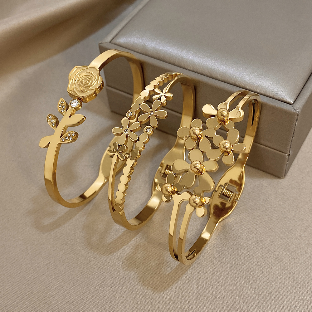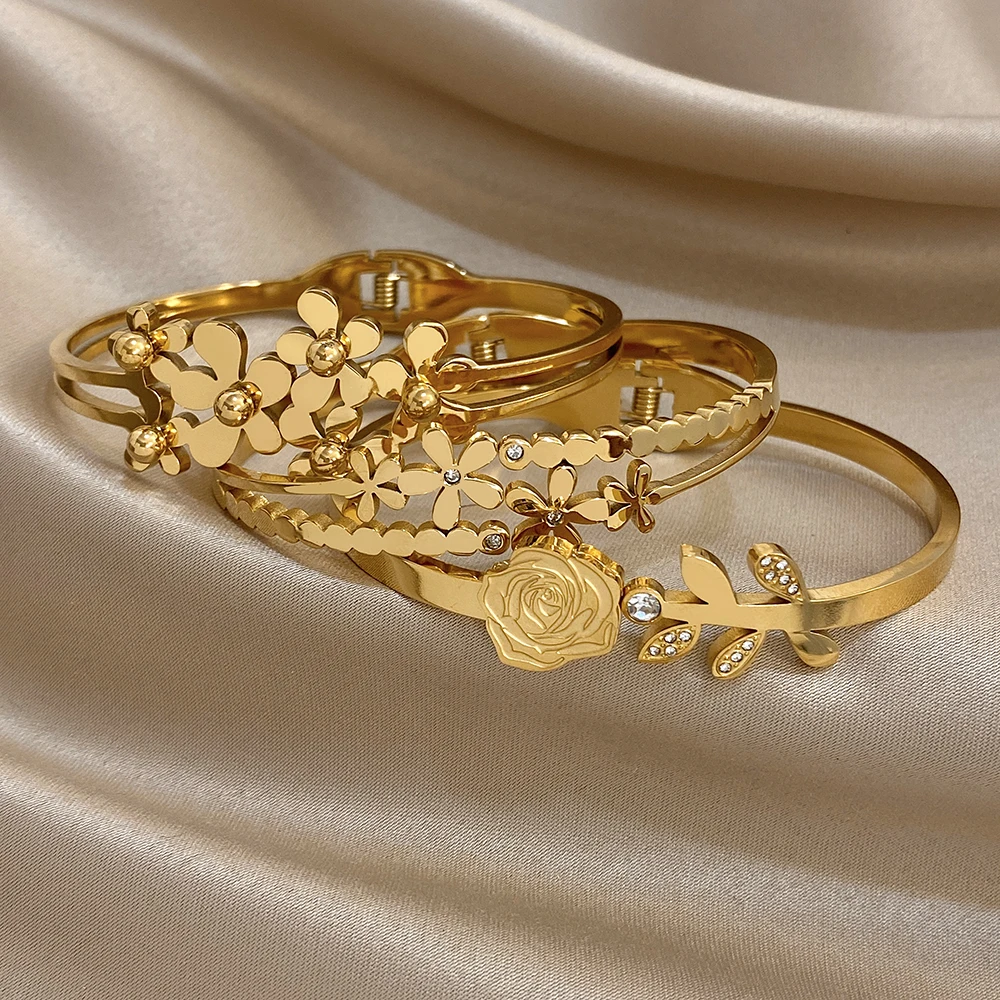 Greatera Small Rose Flower-studded Rhinestone Inlaid Cuff Bracelet Gold Color Stainless Steel Series High-end Women’s Bangle New