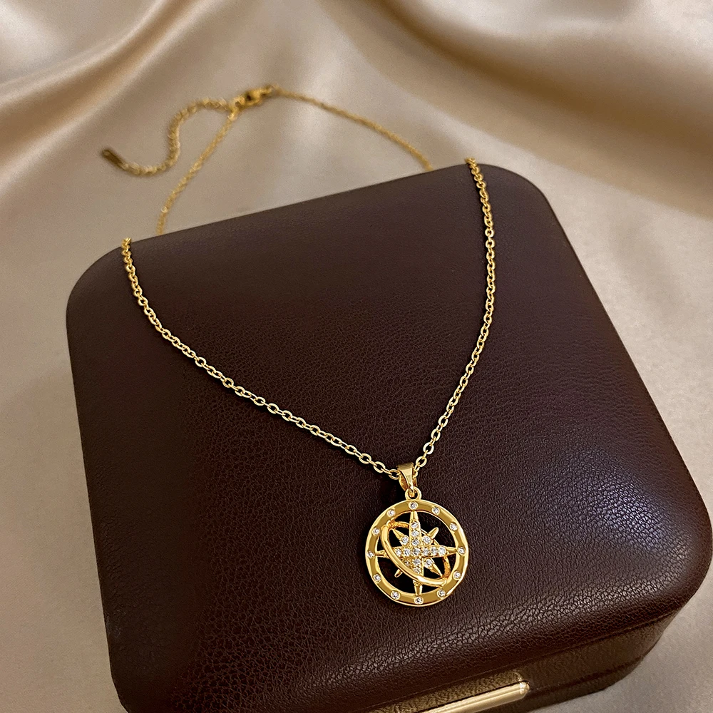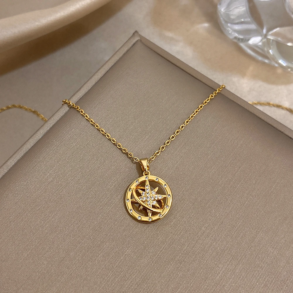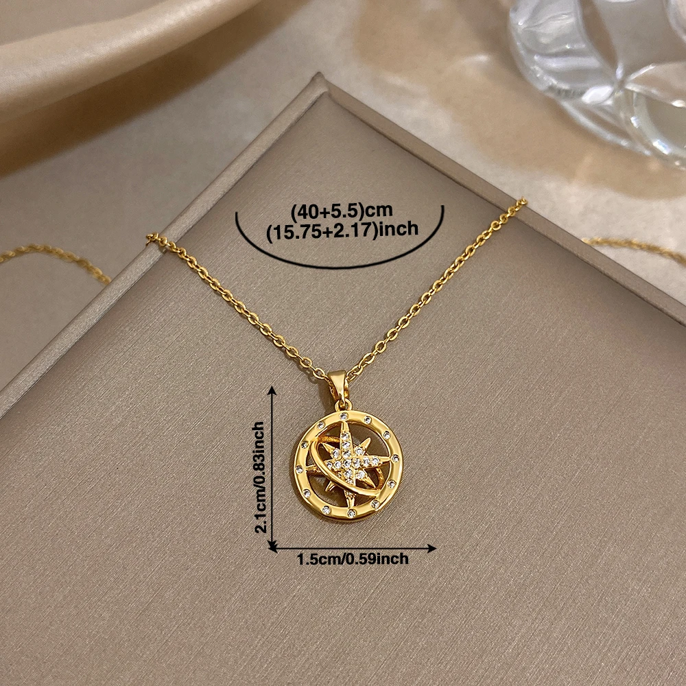 Greatera Star Wheel Compass Personalized Pendant Necklace Fashion Shiny Rhinestone Inlaid Women’s Collarbone Chain Jewelry Gift