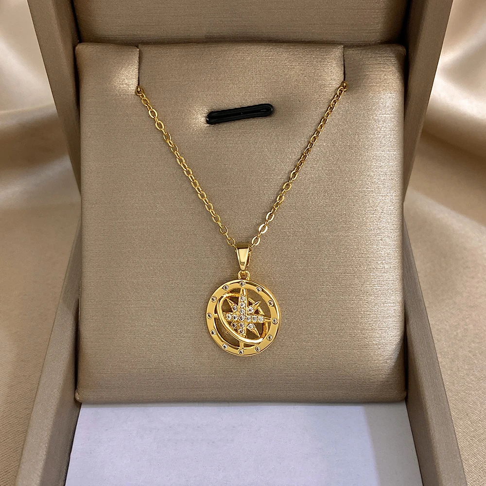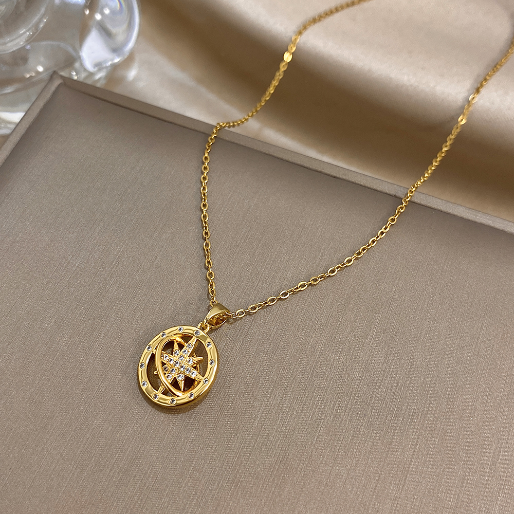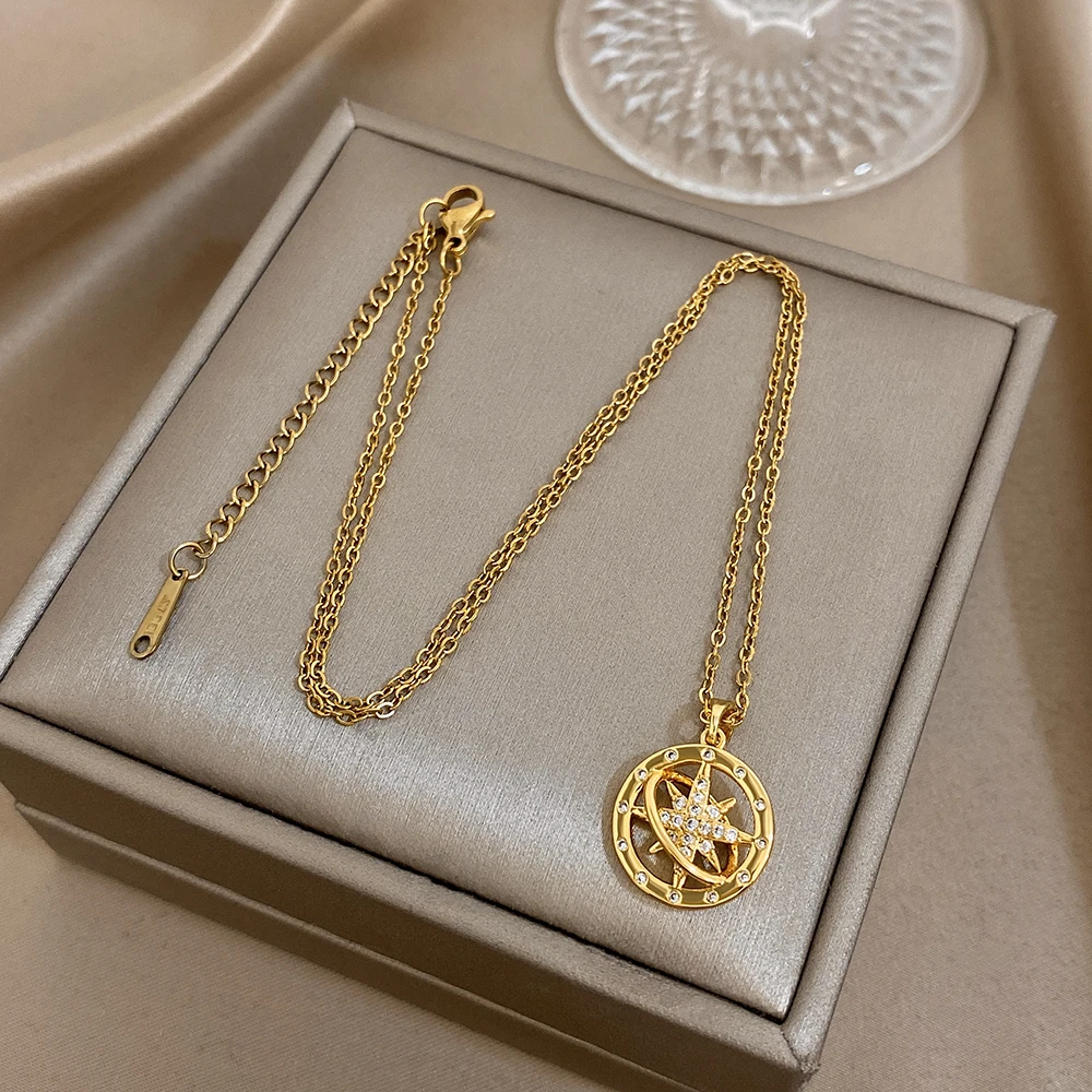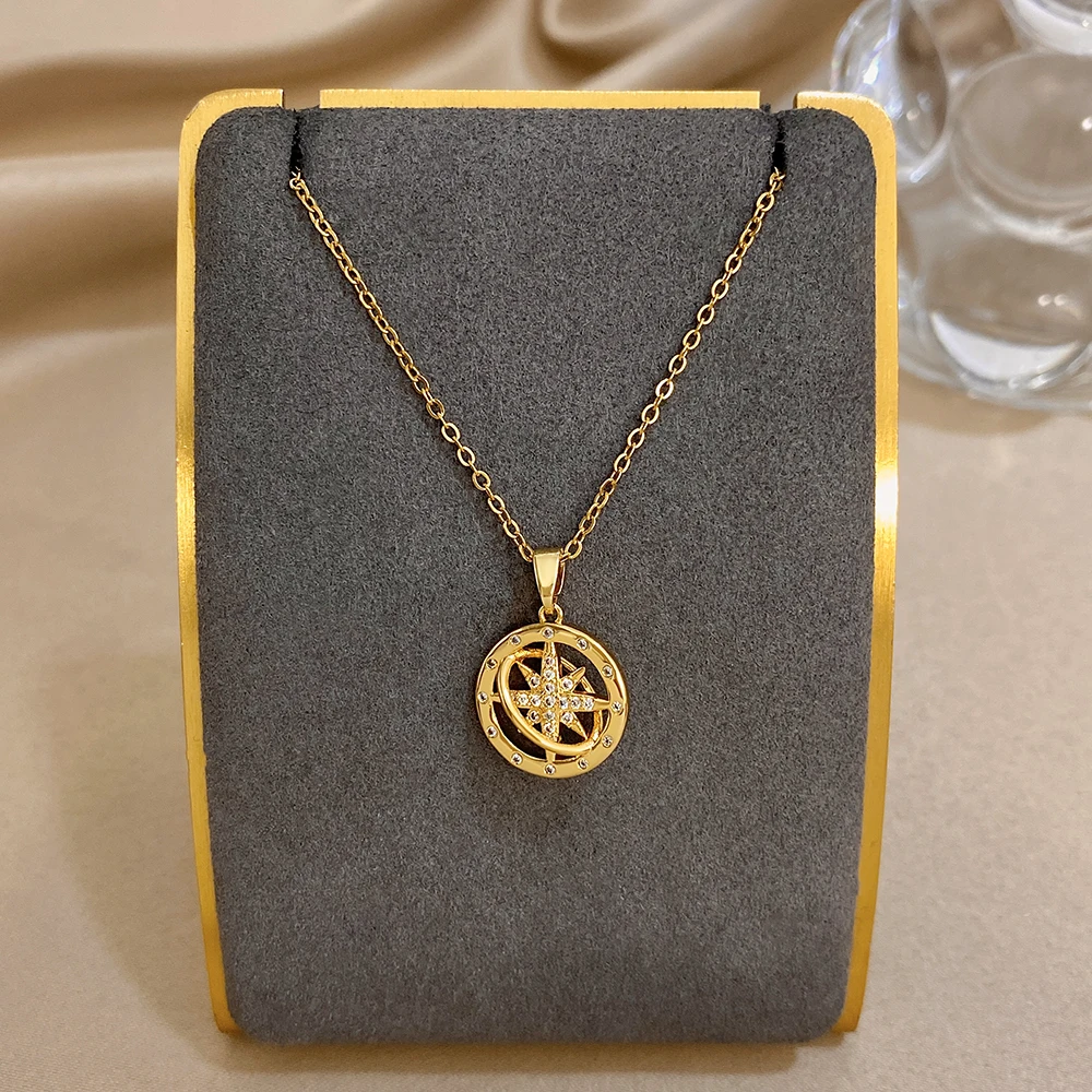 Greatera Star Wheel Compass Personalized Pendant Necklace Fashion Shiny Rhinestone Inlaid Women’s Collarbone Chain Jewelry Gift