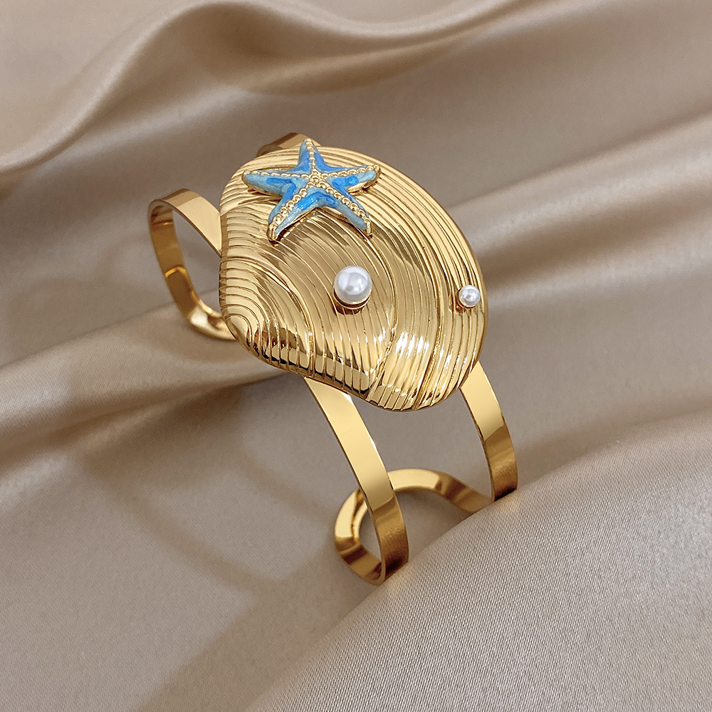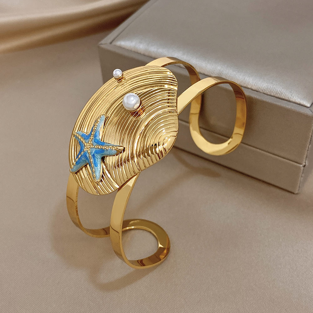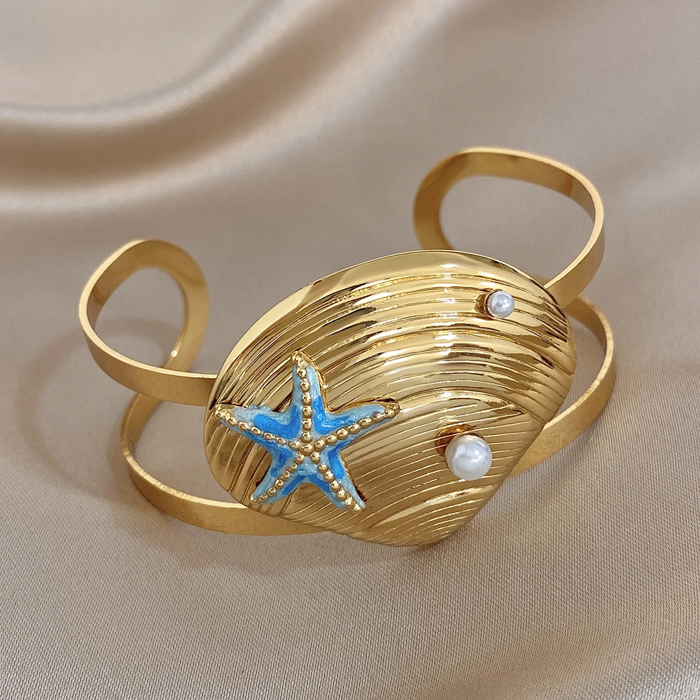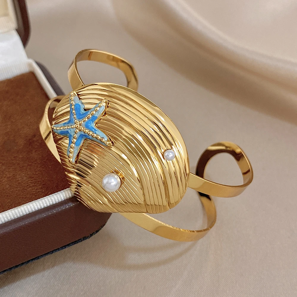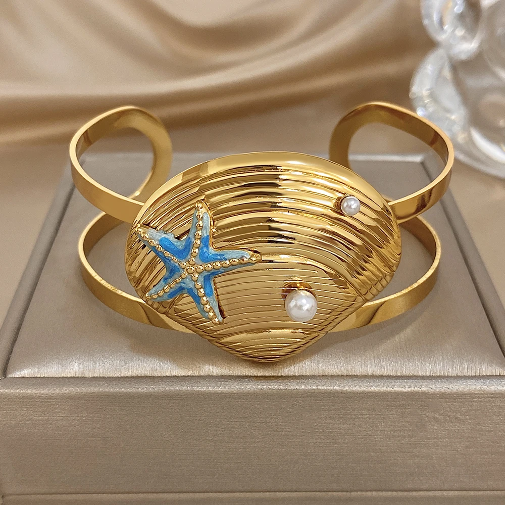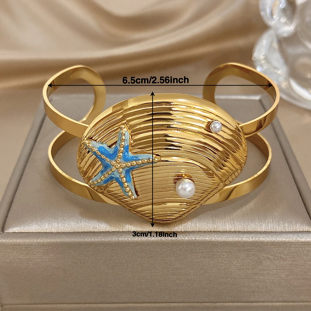 Greatera Trendy Ocean-style Scallop Starfish Pearl Open Bangle Personality Stainless Steel High Quality Women’s Bracelet Jewelry
