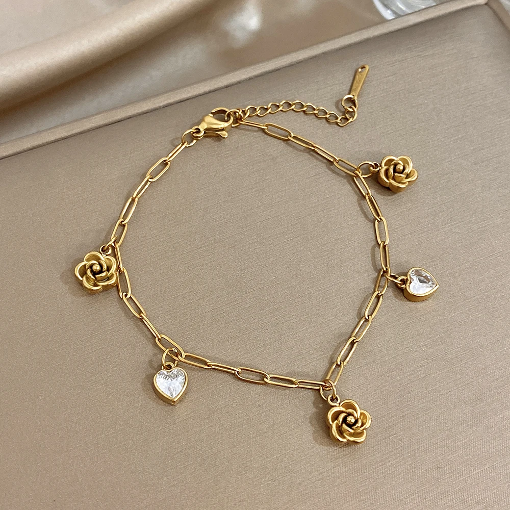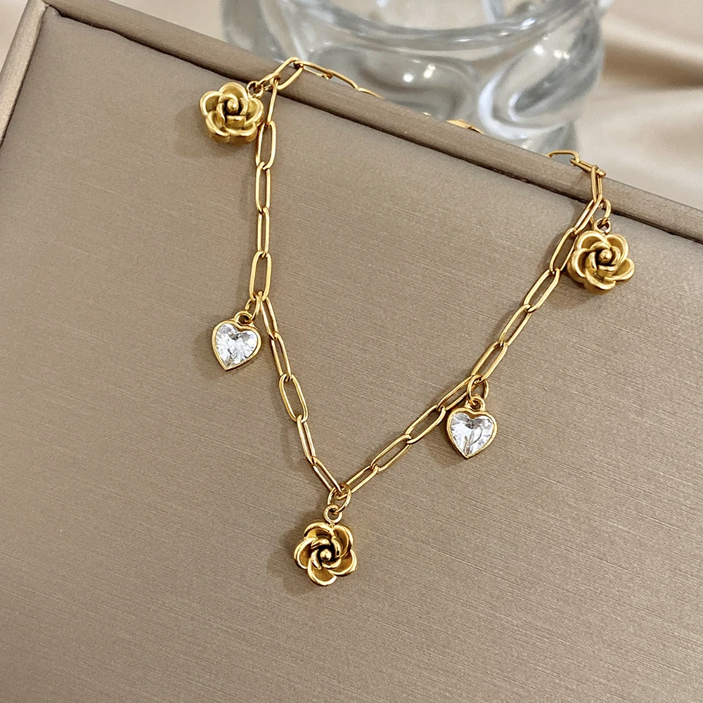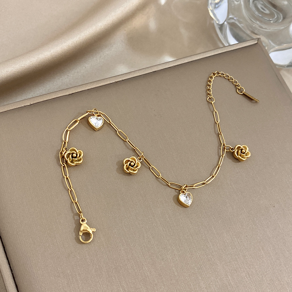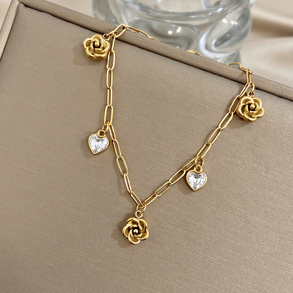 Greatera White Rhinestone Inlaid Camellia Heart-shaped Pendant Fine Bangle Trendy Stainless Steel Temperament Women’s Bracelets