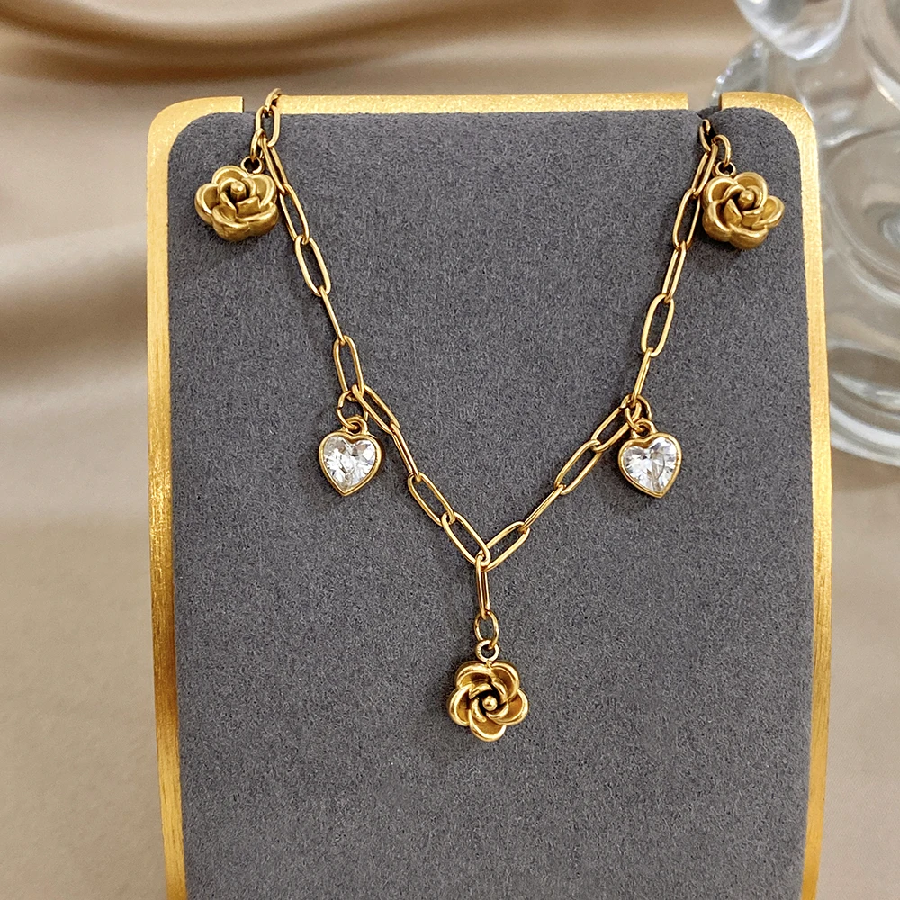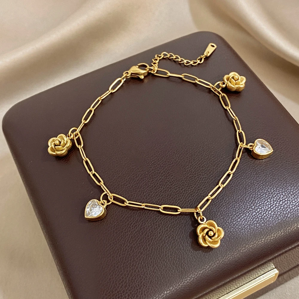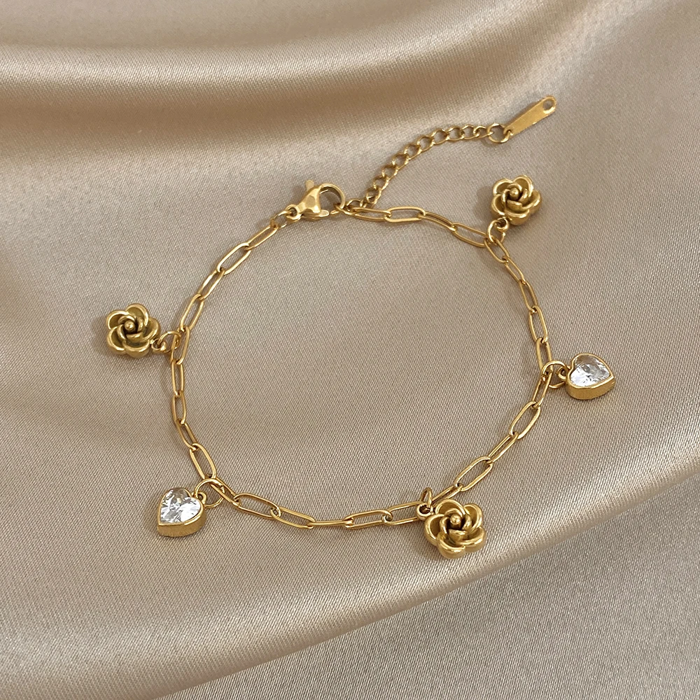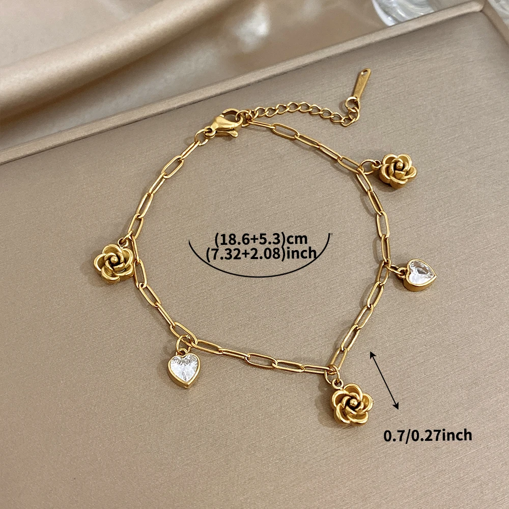 Greatera White Rhinestone Inlaid Camellia Heart-shaped Pendant Fine Bangle Trendy Stainless Steel Temperament Women’s Bracelets