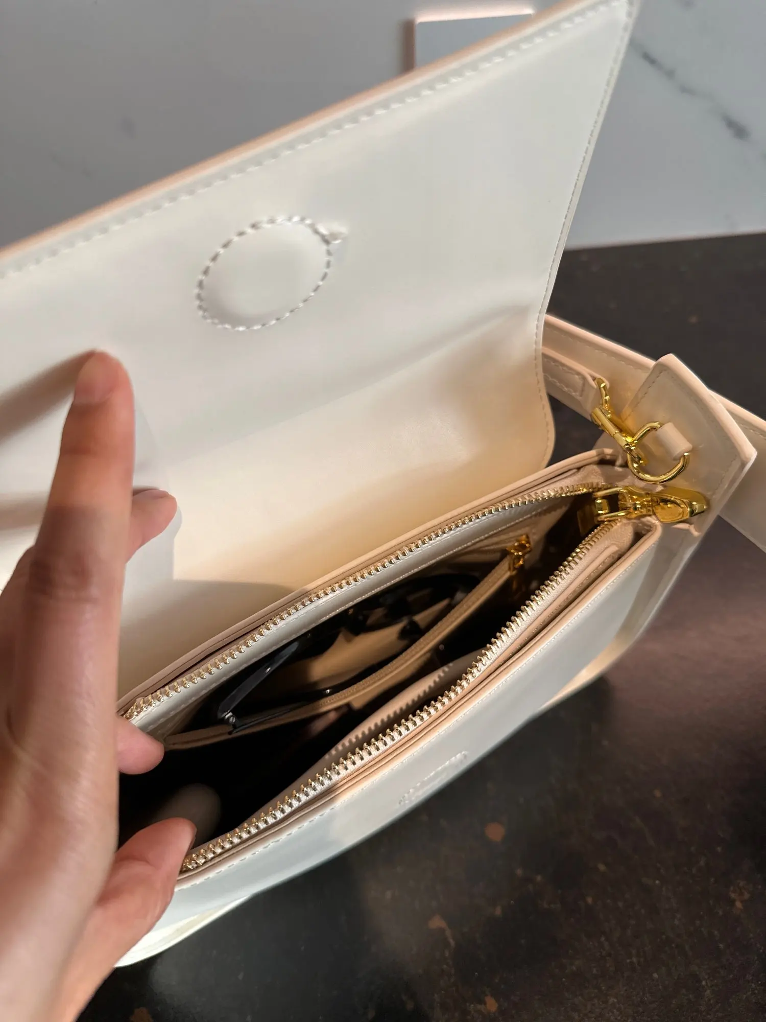 The bag matches the description and photo. The color is not snow-white. milky. The quality is not bad for its price.