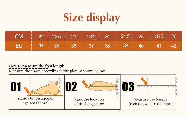 Size Tip:Please Measure your feet length before place the order, then refer to the size chart to choose the size according to your feet length.