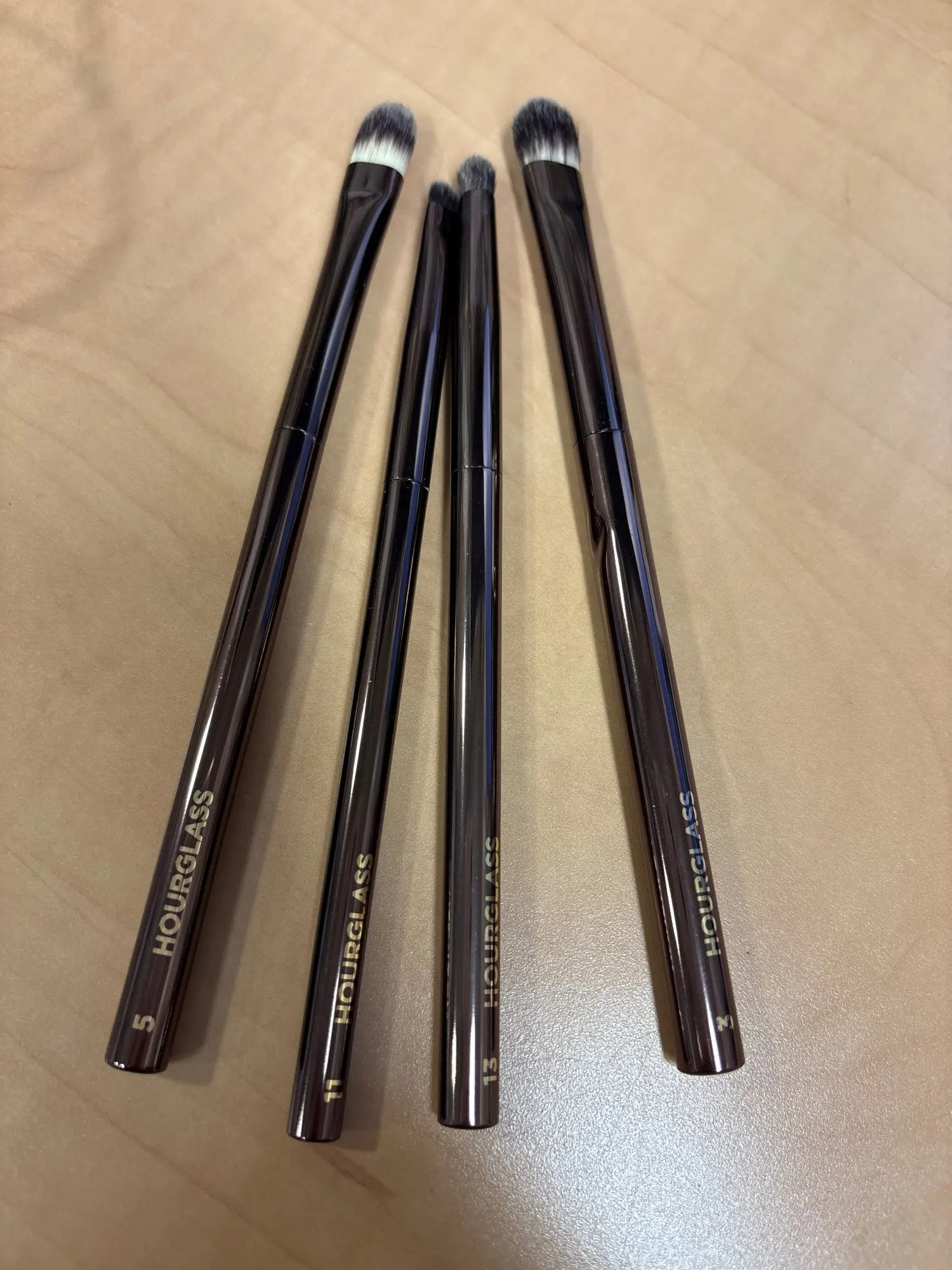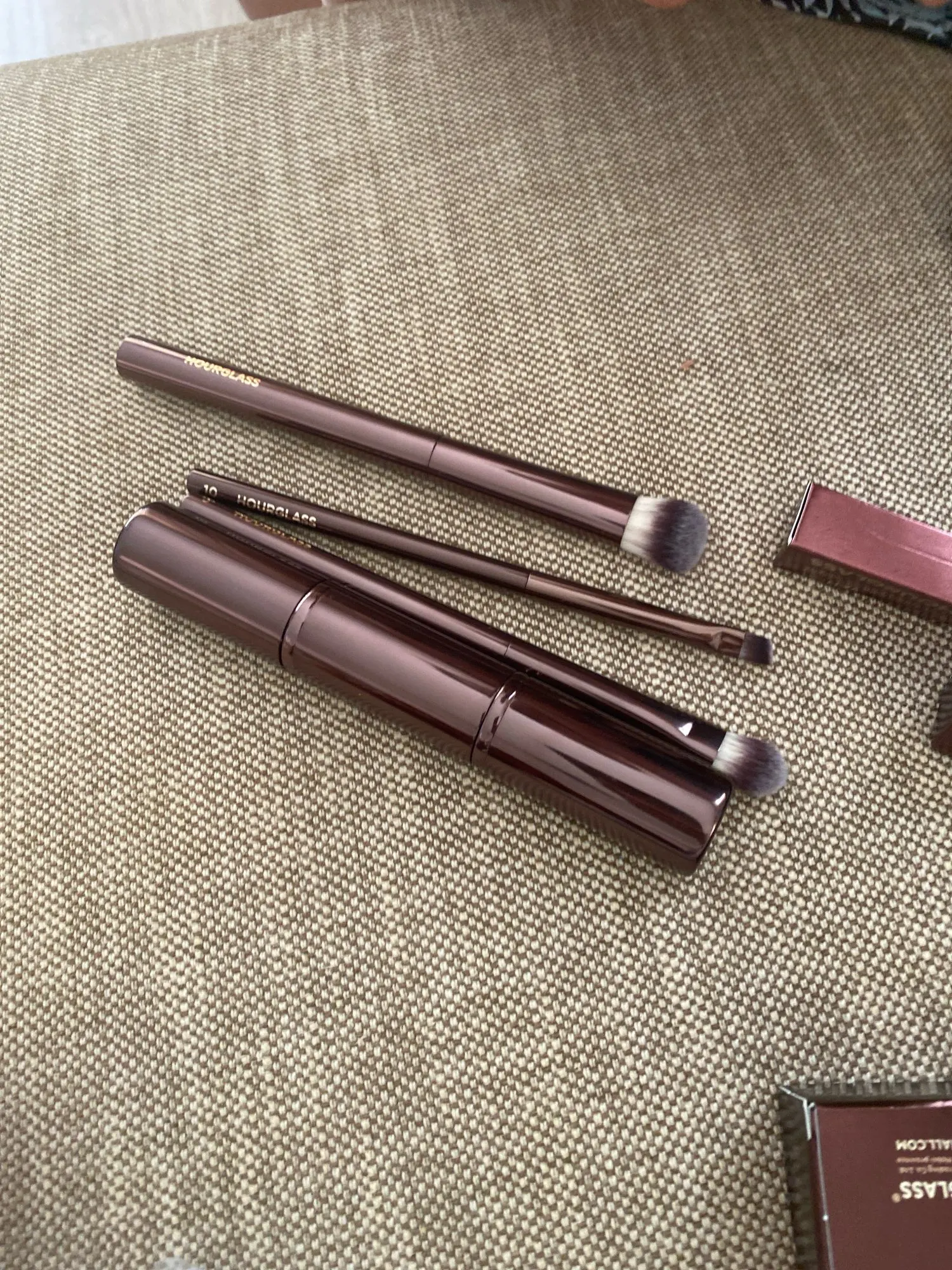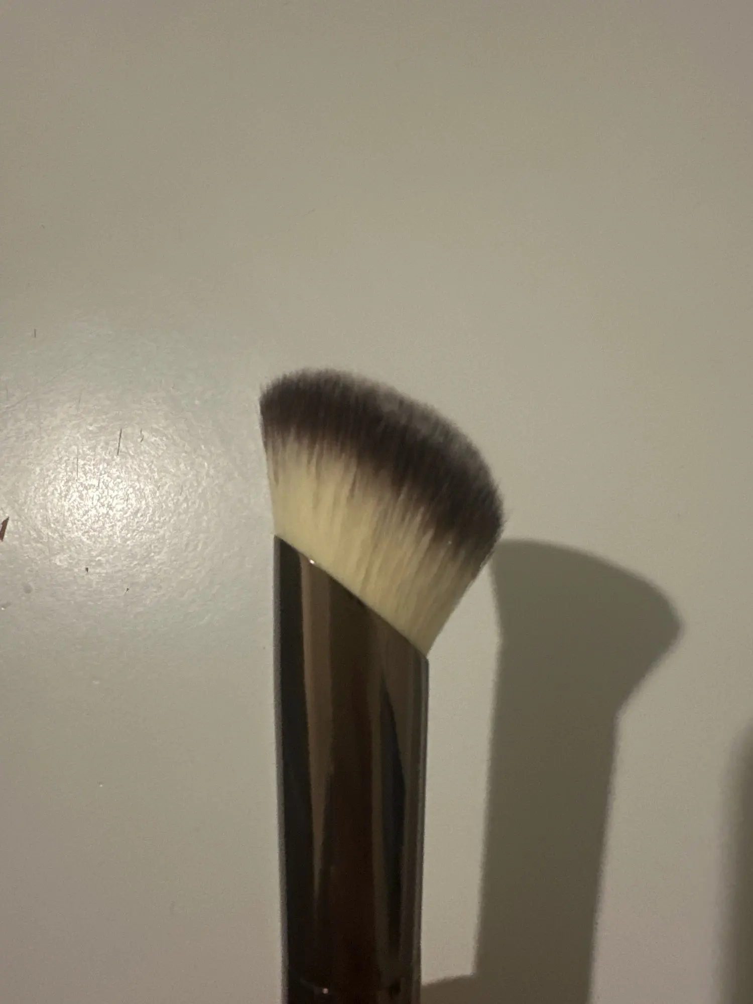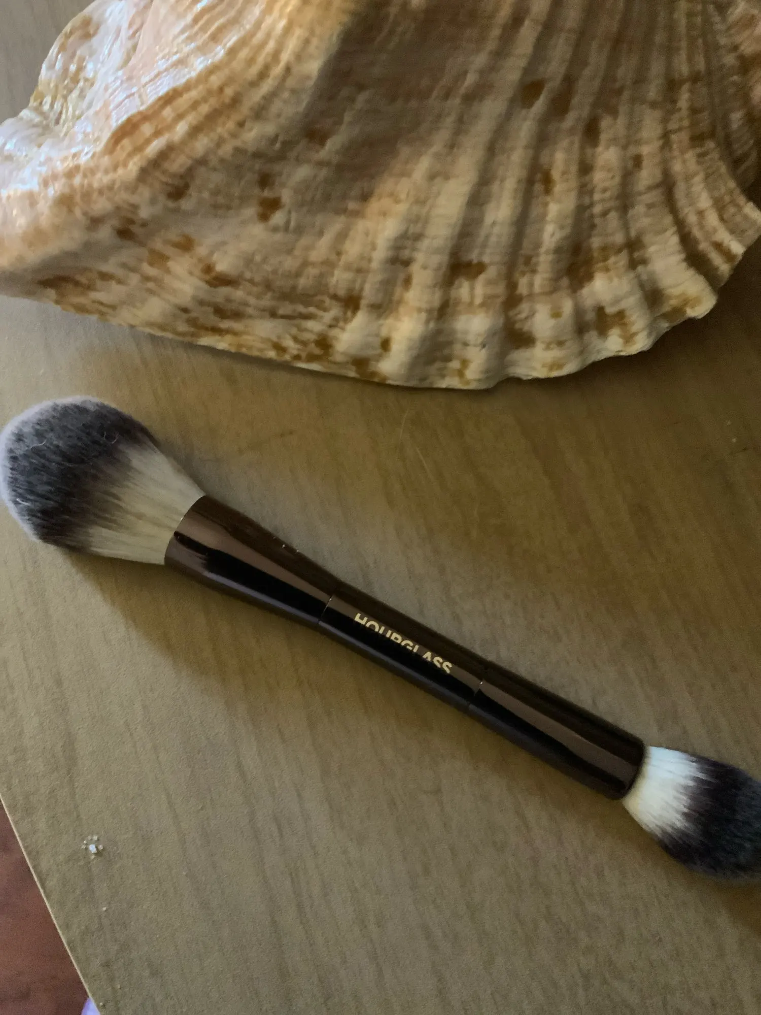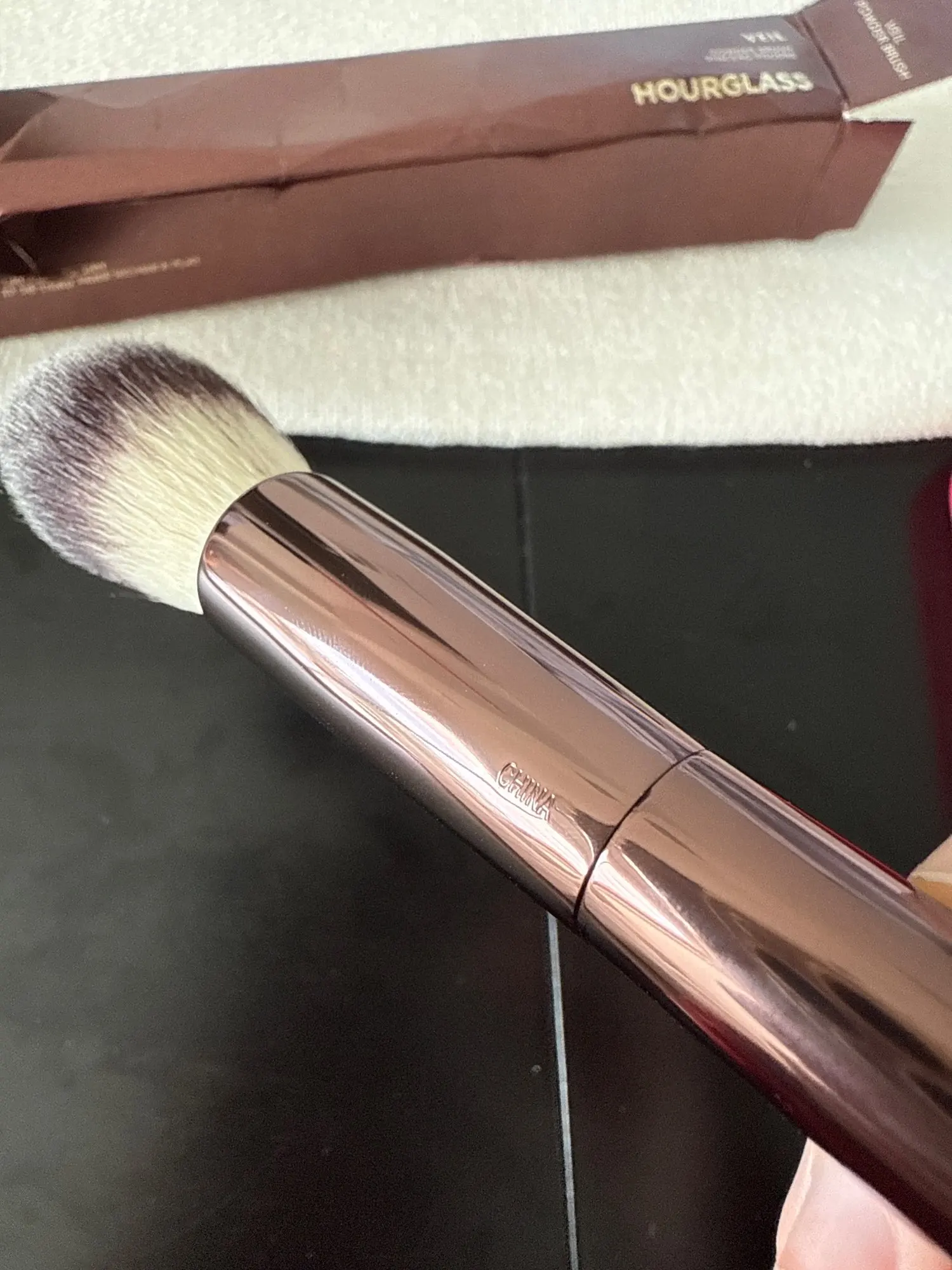 Really nice foundation brush, dense, soft and applies base products smoothly. Brush bristles are even and have a rounded slanted top. Washed the brush twice and no bristles came loose, very good quality but was so dense it took a whole day to dry. Came packaged up nicely in logo cardboard boxes, with plastic moulded around the bristles to keep the shape and the entire brush wrapped in a plastic sleeve. Brush handle is a light bronze, mid-weight and slightly heavy. Hourglass branding on the ambient lighting foundation brush was a warm gold, came with a slight scratch across the g in hourglass but no other defects.