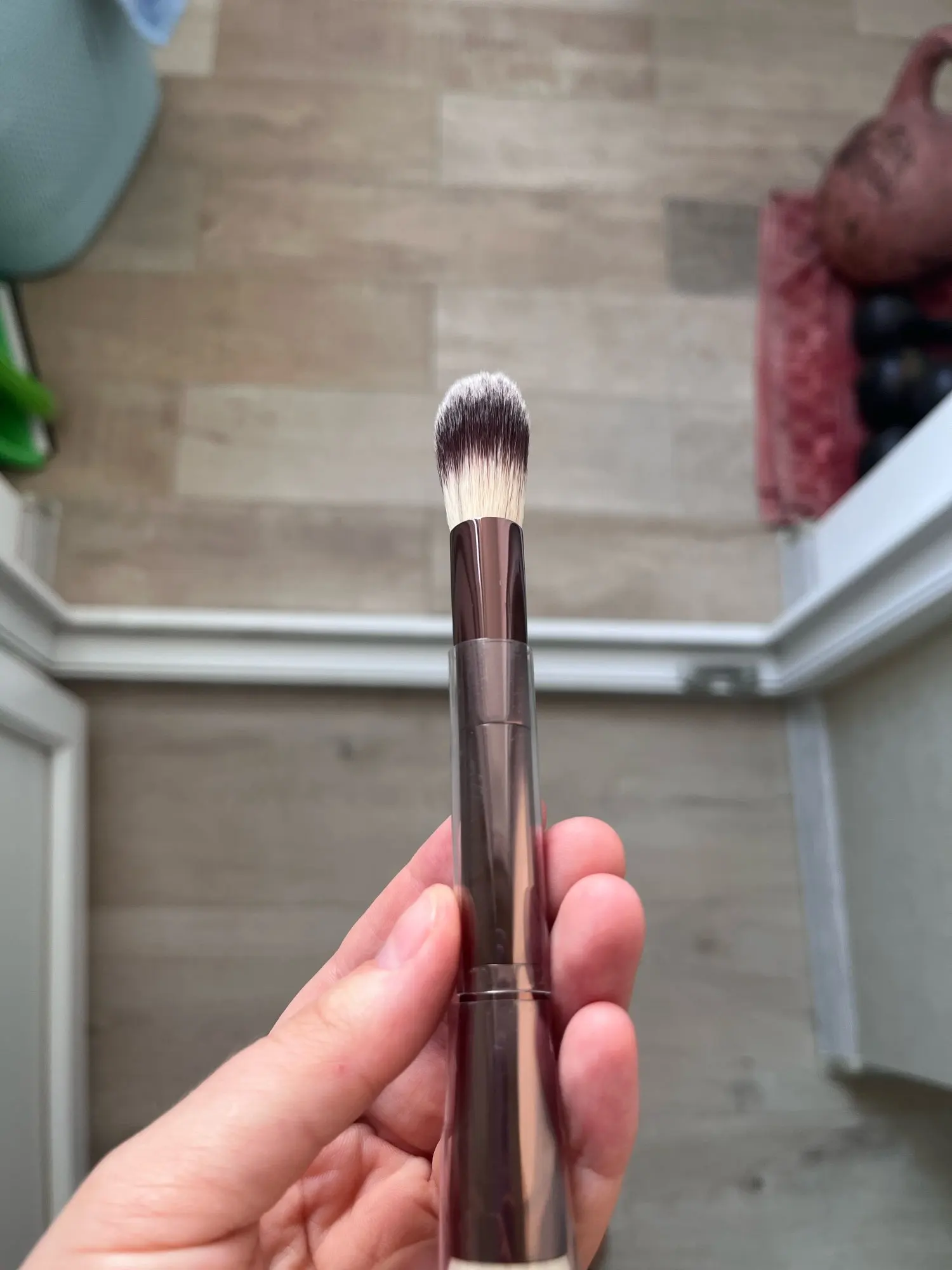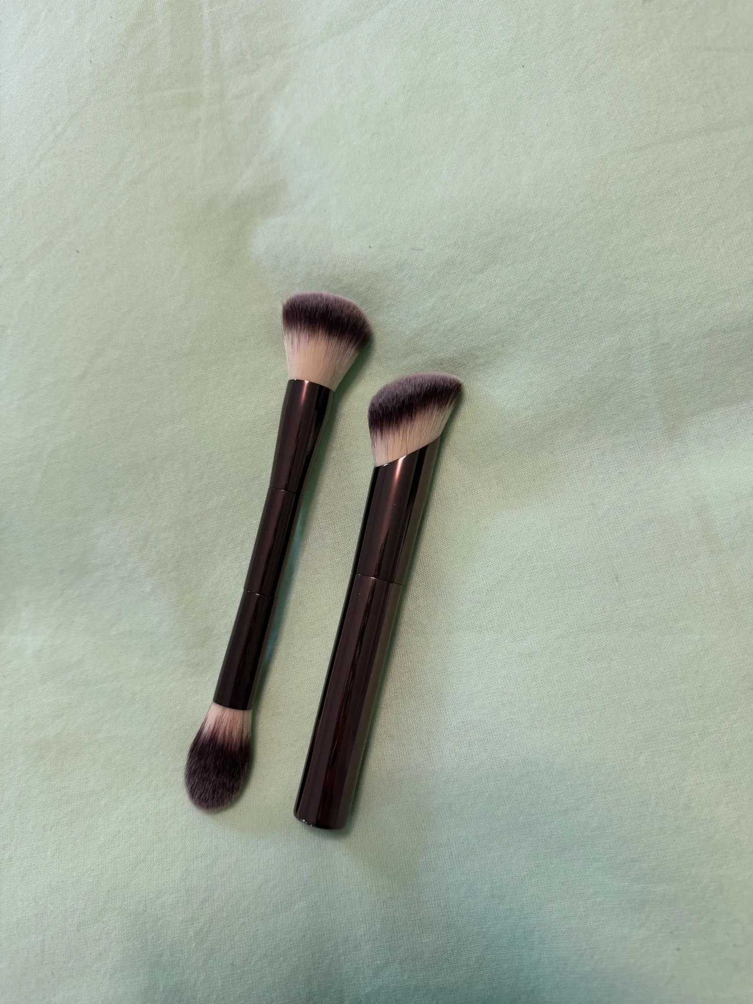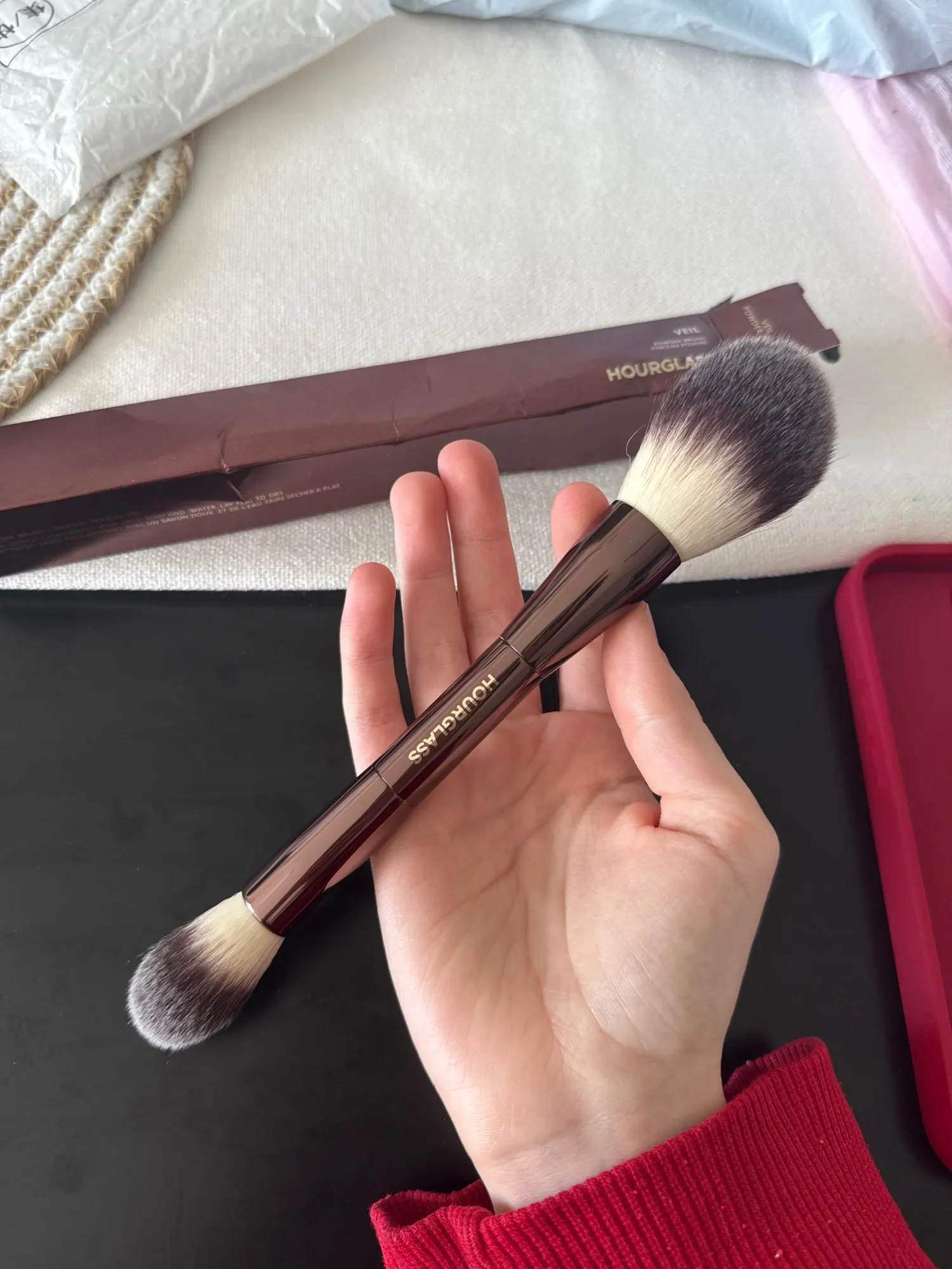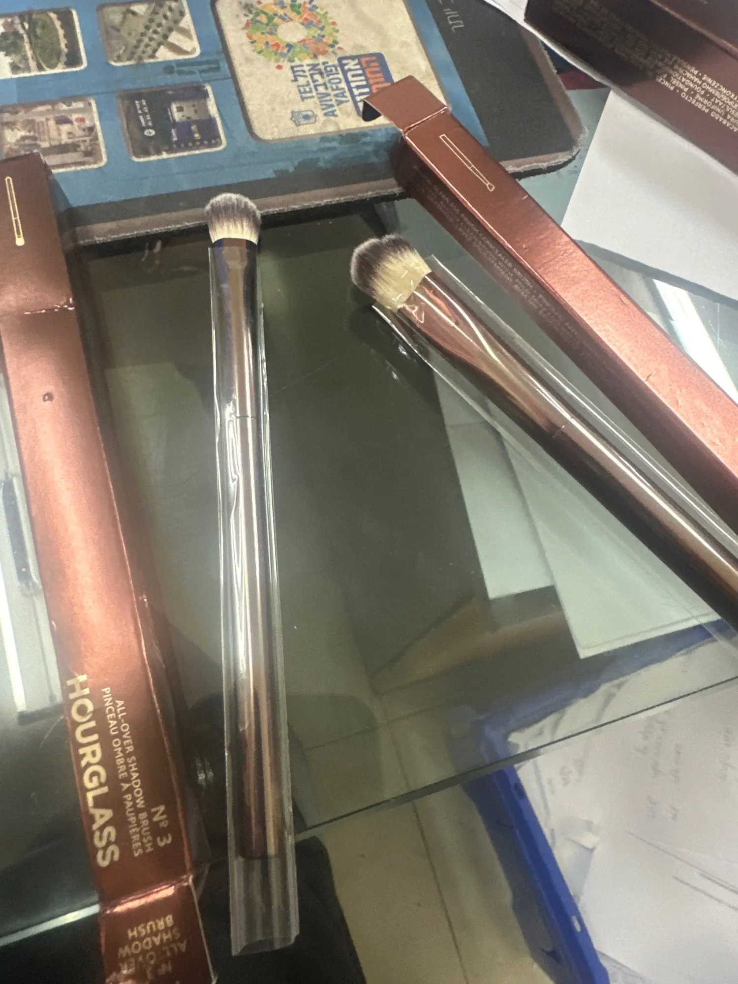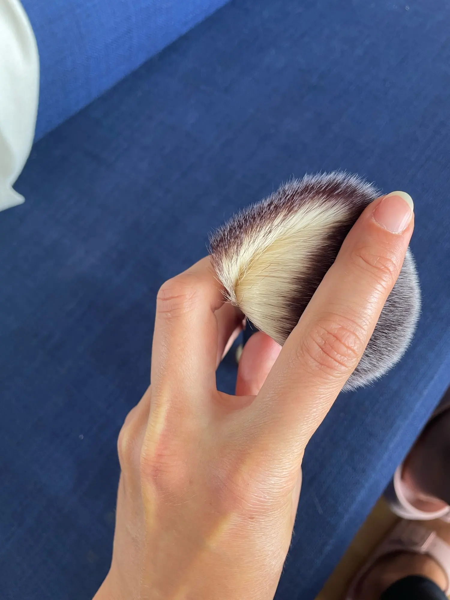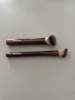 Really nice foundation brush, dense, soft and applies base products smoothly. Brush bristles are even and have a rounded slanted top. Washed the brush twice and no bristles came loose, very good quality but was so dense it took a whole day to dry. Came packaged up nicely in logo cardboard boxes, with plastic moulded around the bristles to keep the shape and the entire brush wrapped in a plastic sleeve. Brush handle is a light bronze, mid-weight and slightly heavy. Hourglass branding on the ambient lighting foundation brush was a warm gold, came with a slight scratch across the g in hourglass but no other defects.
