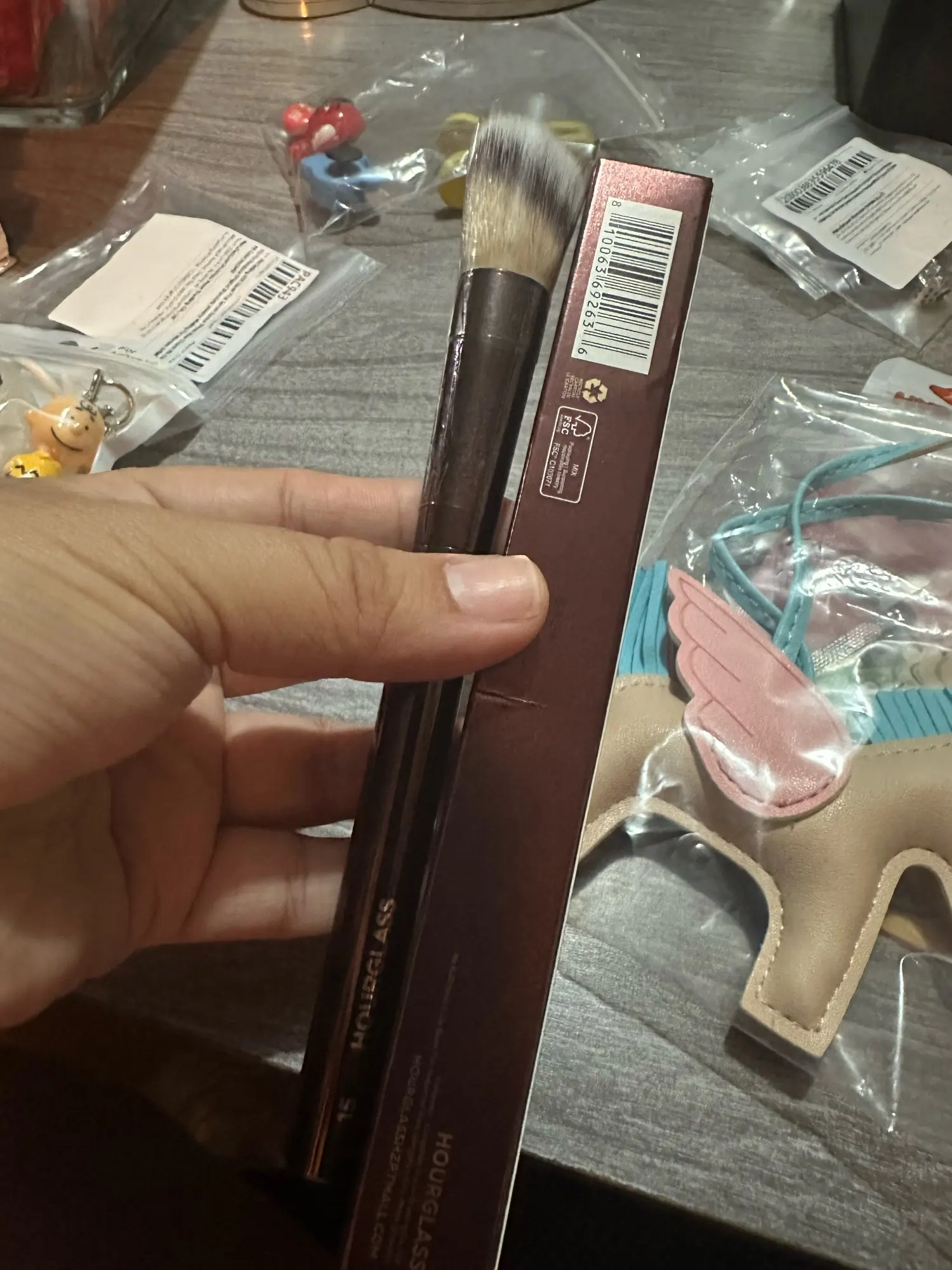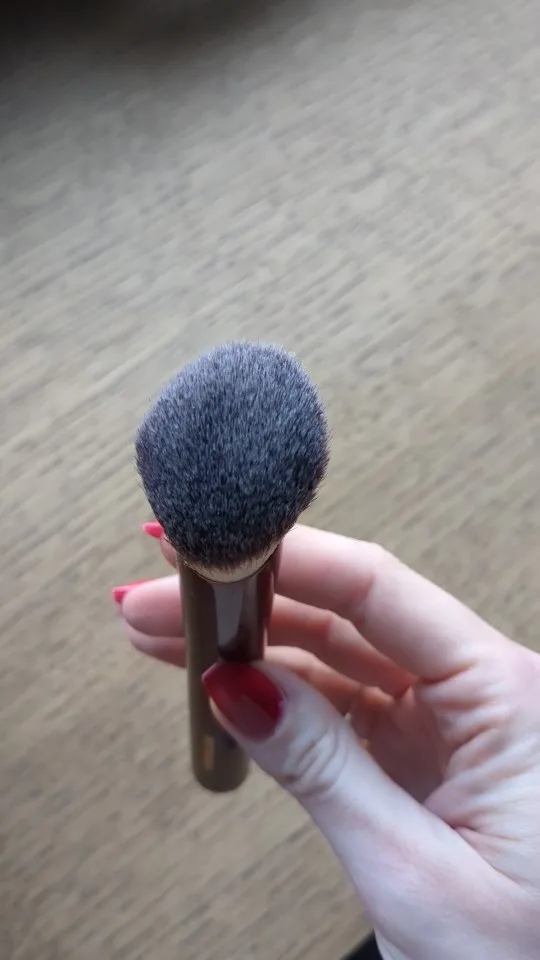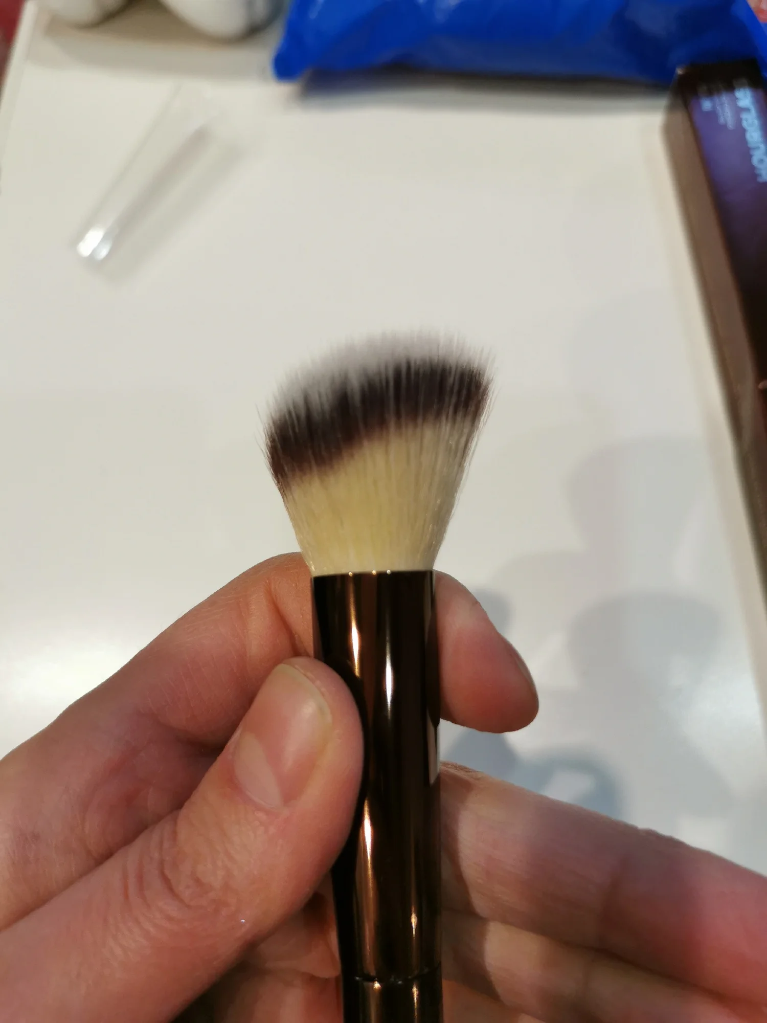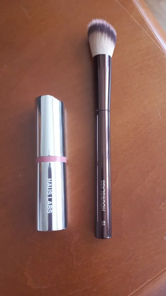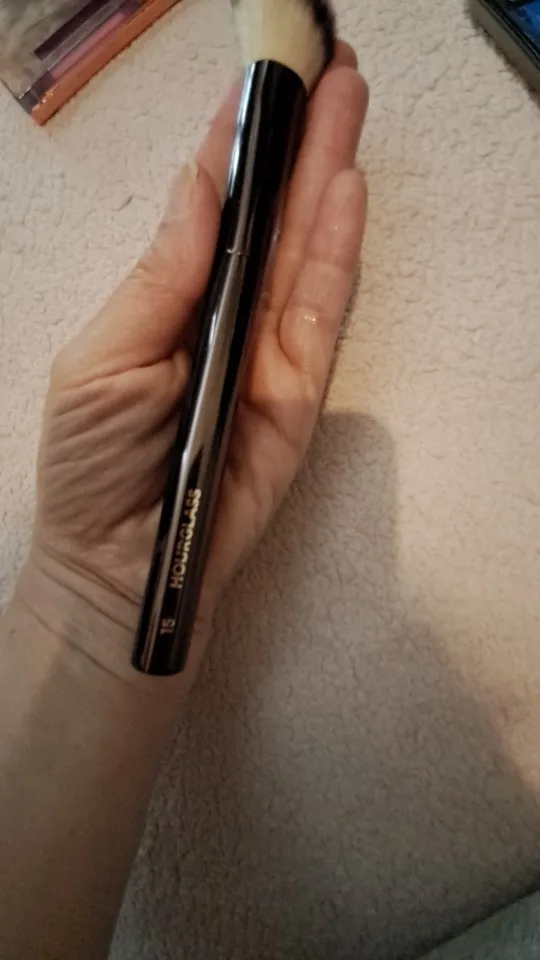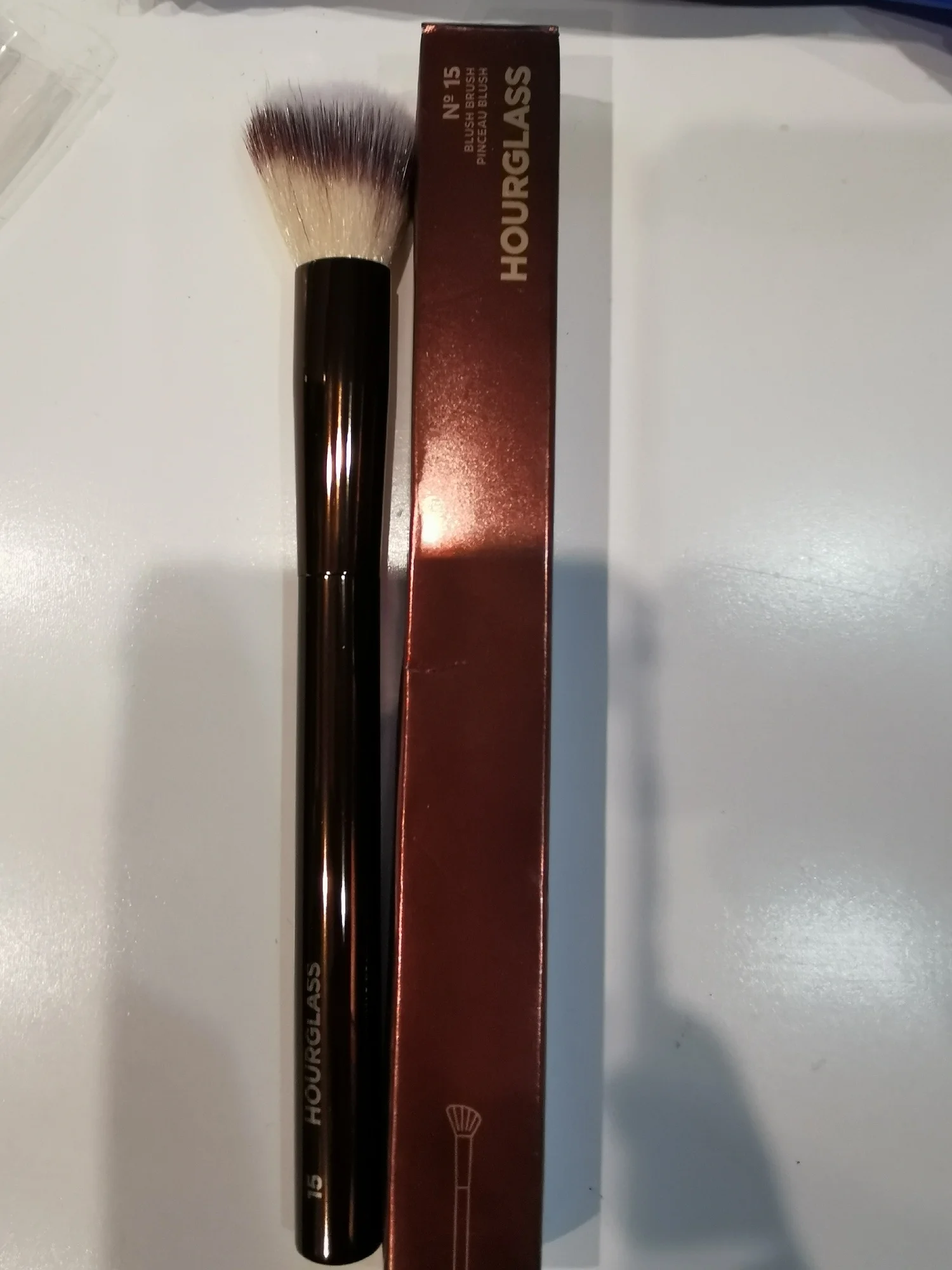 Really nice blush brush, soft and can blend out blush products quickly and efficiently. Brush bristles are cut like a stippling brush, nice and uniform. Washed the brush twice and no bristles came loose, very good quality. Came packaged up nicely in logo cardboard boxes, with plastic moulded around the bristles to keep the shape and the entire brush wrapped in a plastic sleeve. Brush handle is a darker bronze and slightly heavier than the ambient lighting foundation brush. Hourglass branding on the no. 15 blush brush was a cooler gold, no visible defects found.