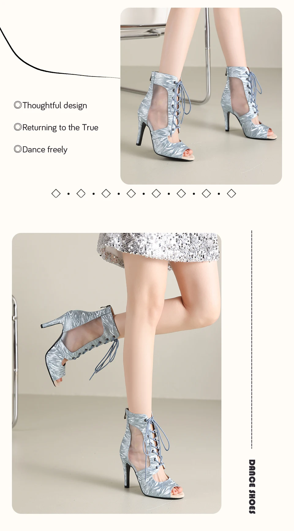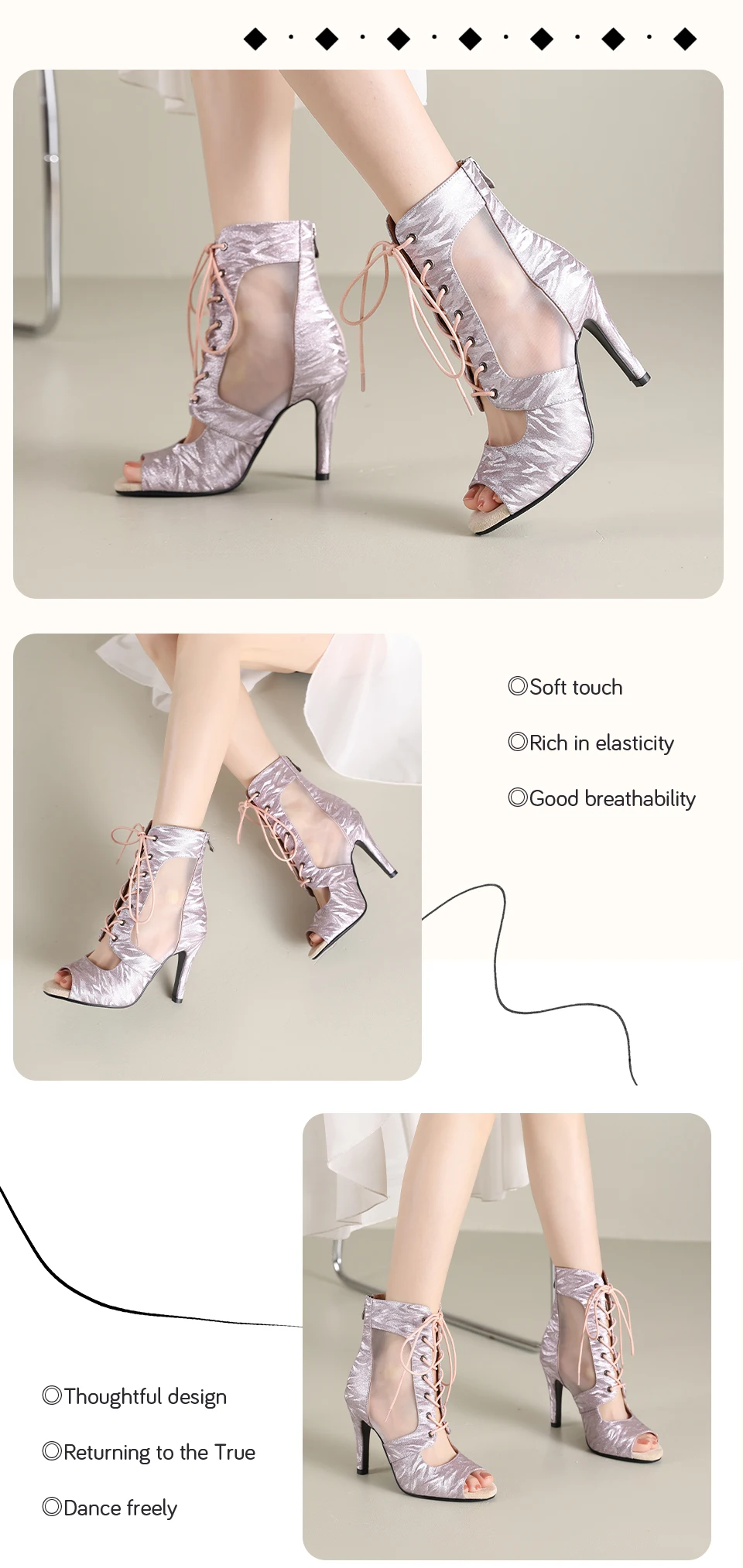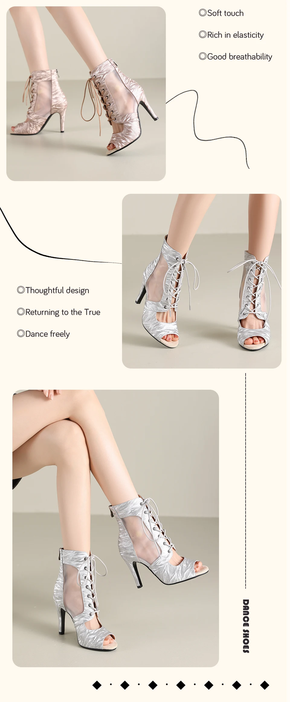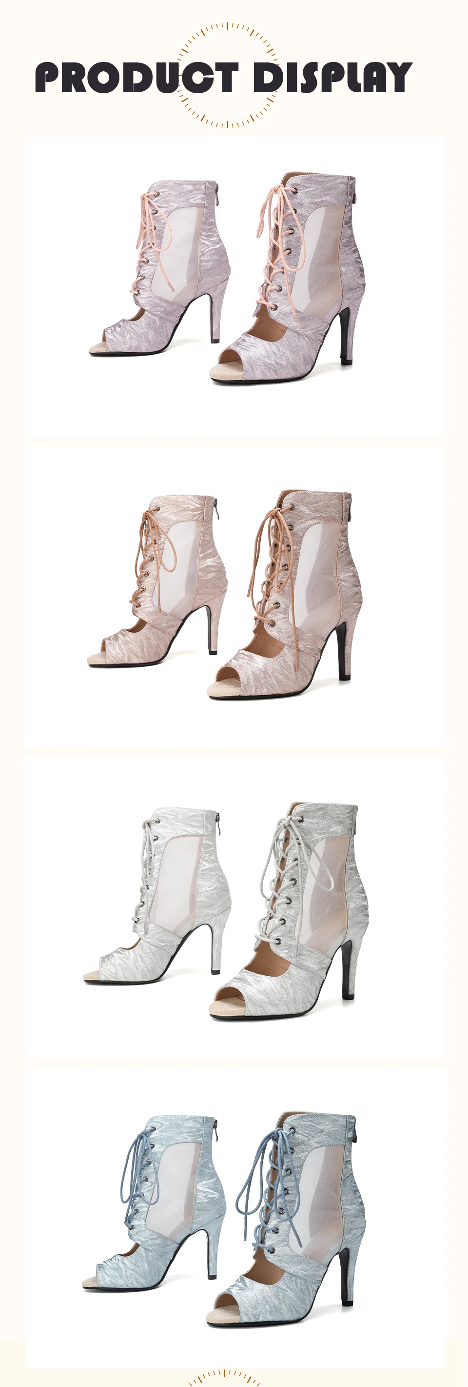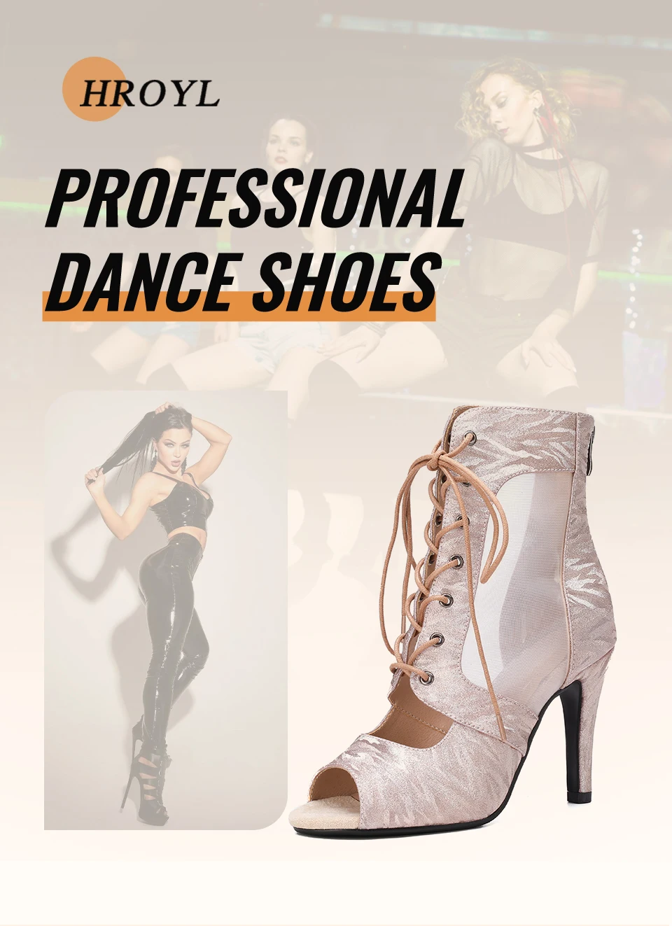 HROYL Ballroom Streamer Mesh Jazz Dance Fish Mouth High Heels Woman Dance Shoes Glitter Satin Pearlescent Short Dance Boots
