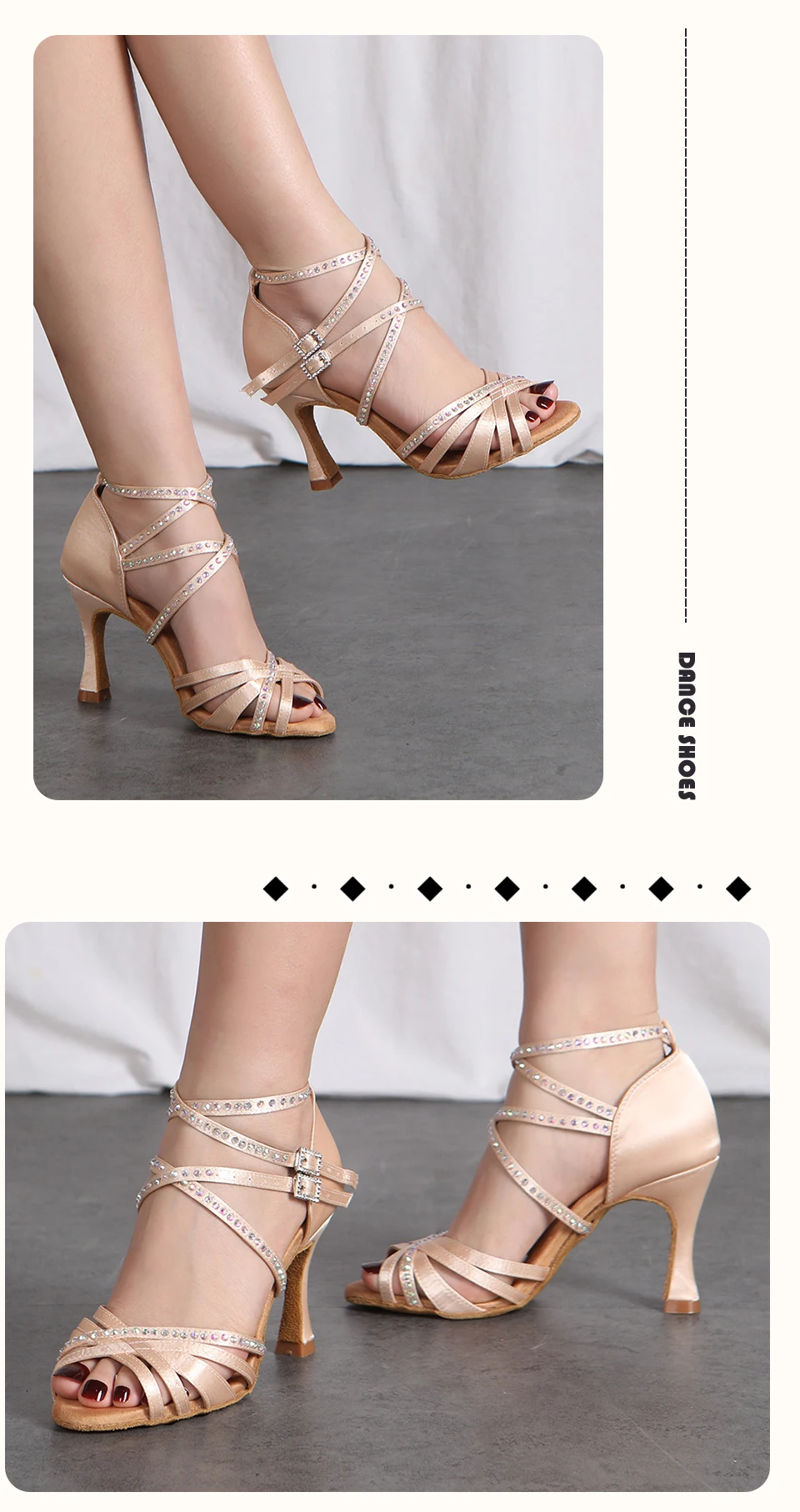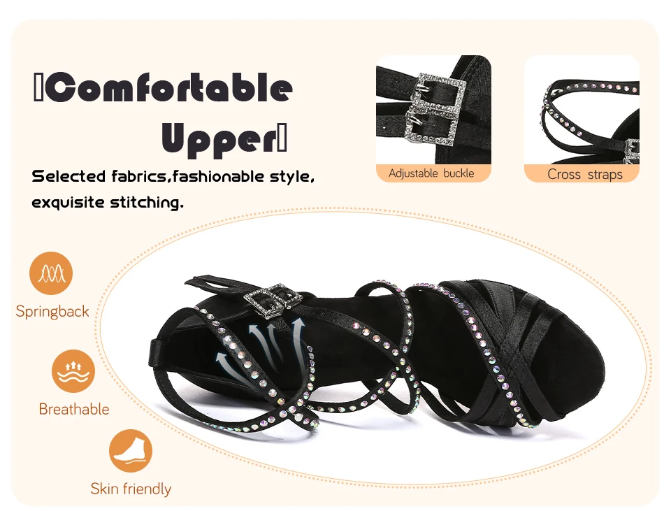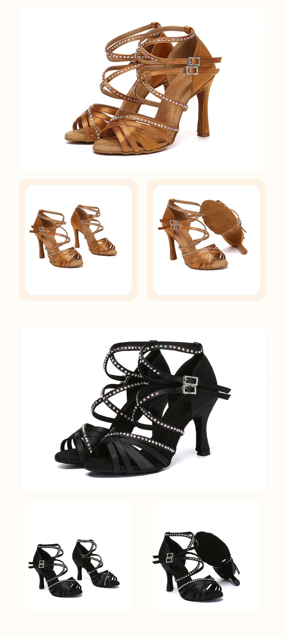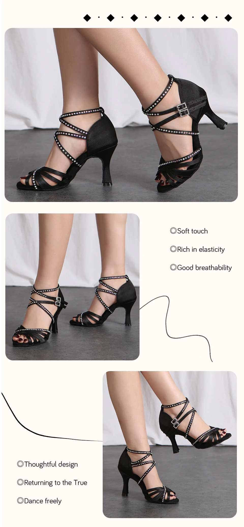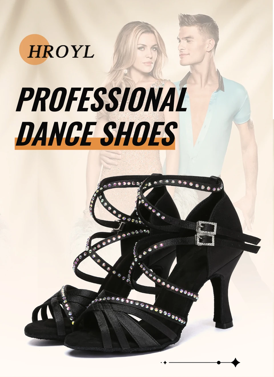 HROYL Double Buckle Satin Women Latin Dance Shoes Rhinestone Latin Salsa Girl Dancing Shoes Shiny Ballroom Dance Shoes Ladies