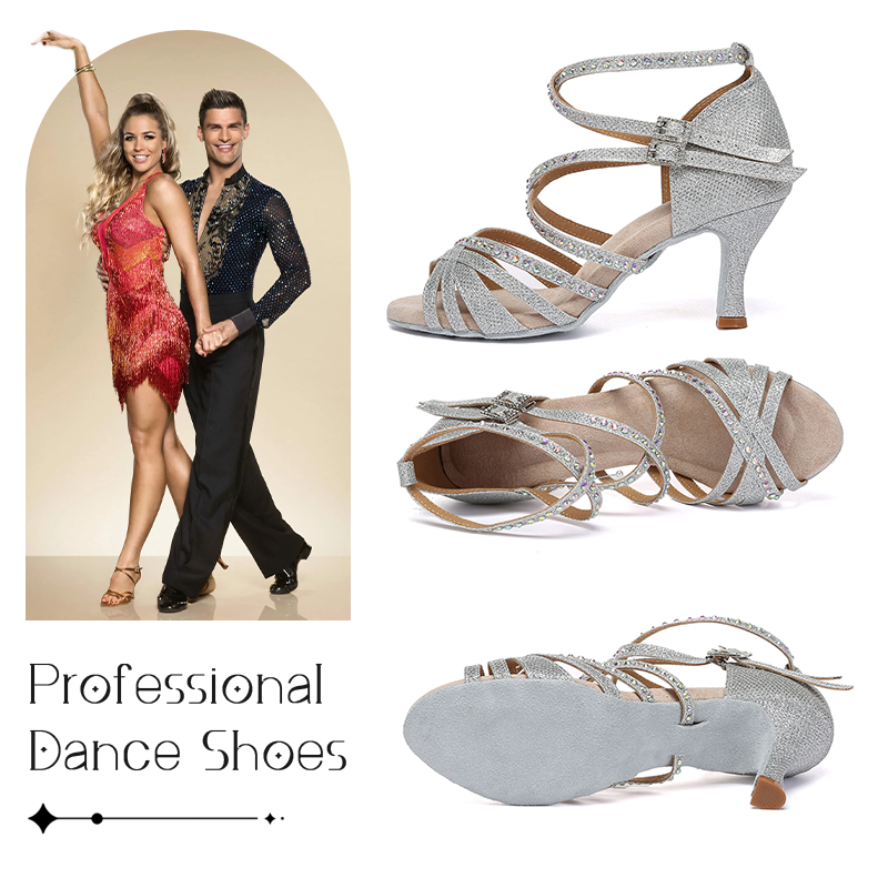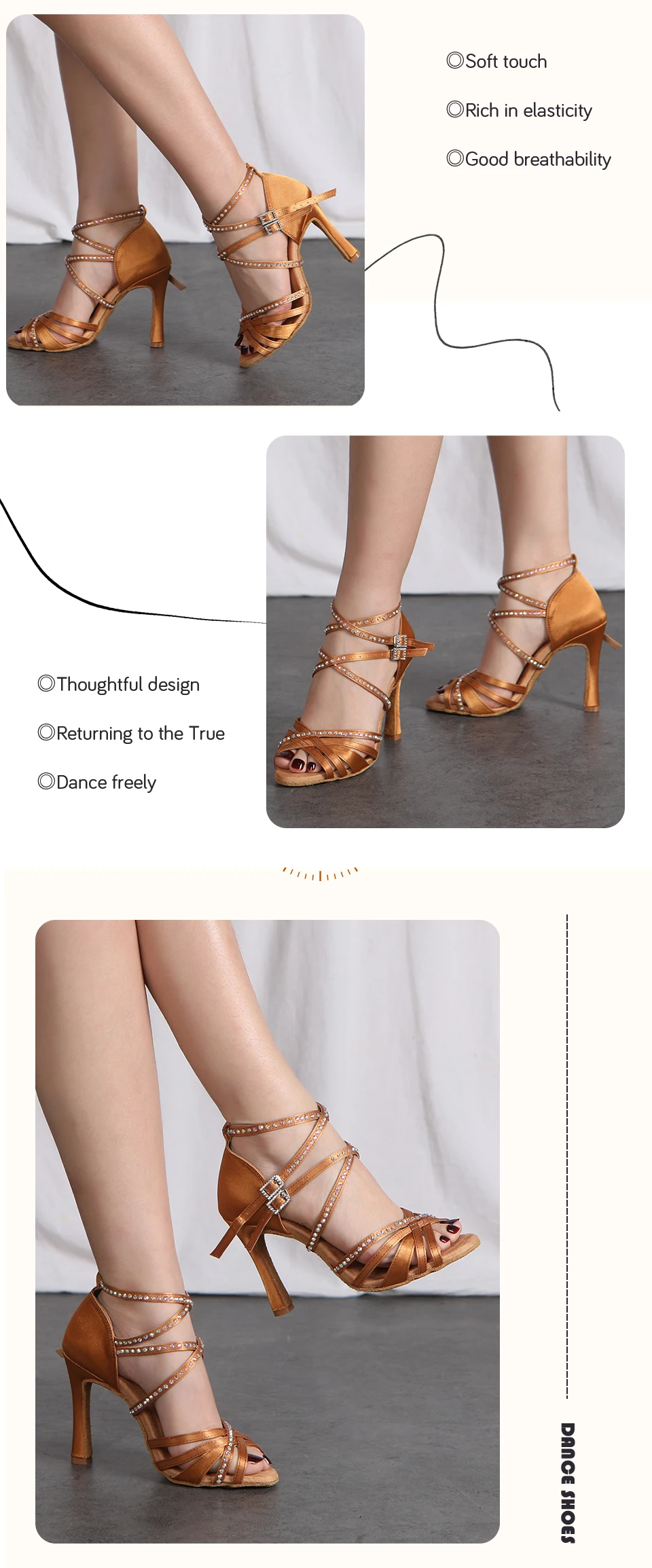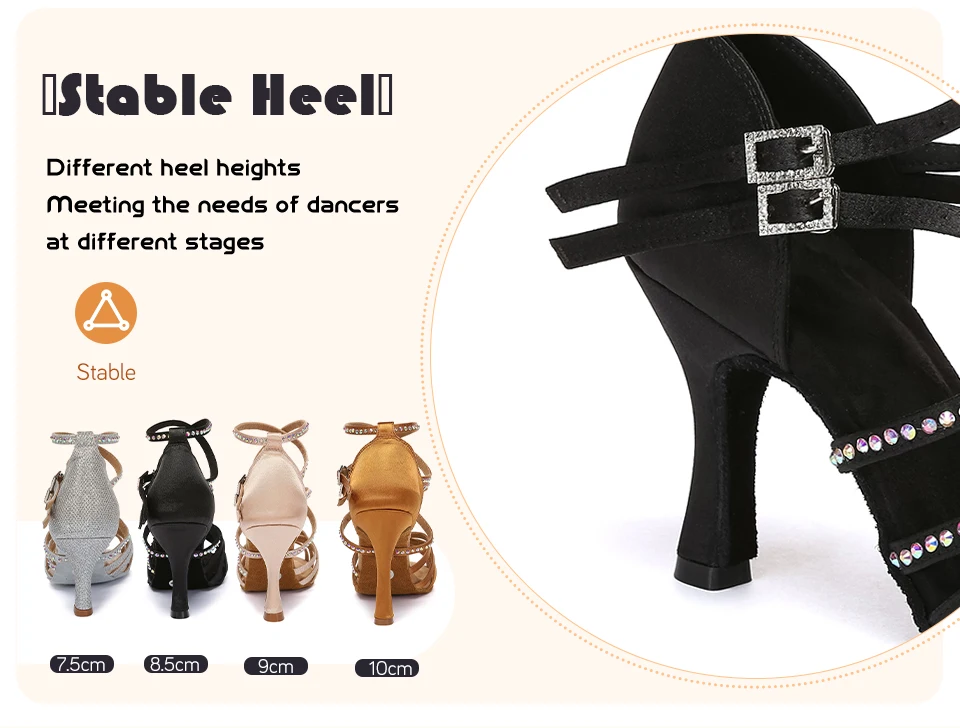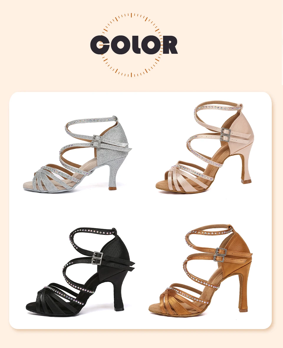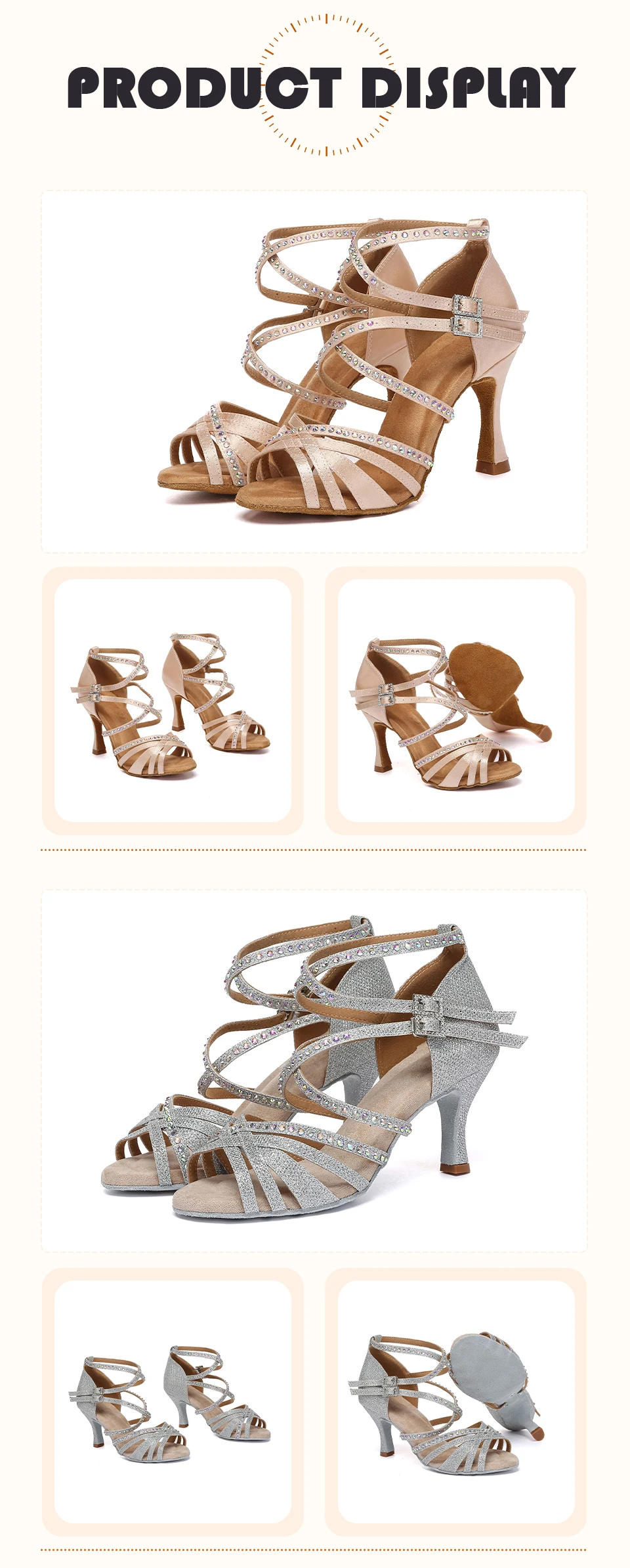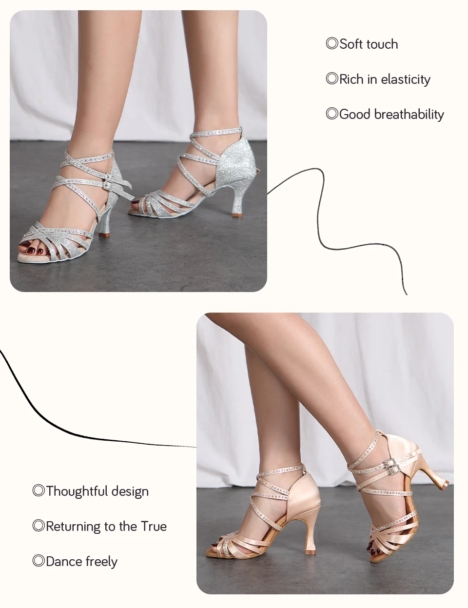 HROYL Double Buckle Satin Women Latin Dance Shoes Rhinestone Latin Salsa Girl Dancing Shoes Shiny Ballroom Dance Shoes Ladies
