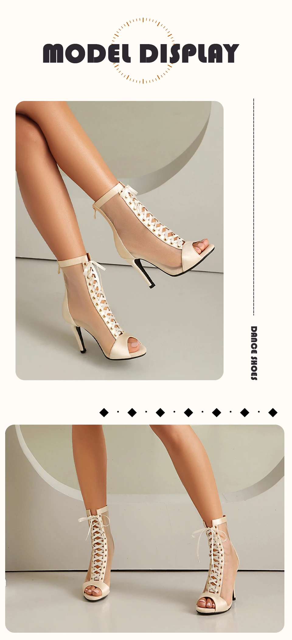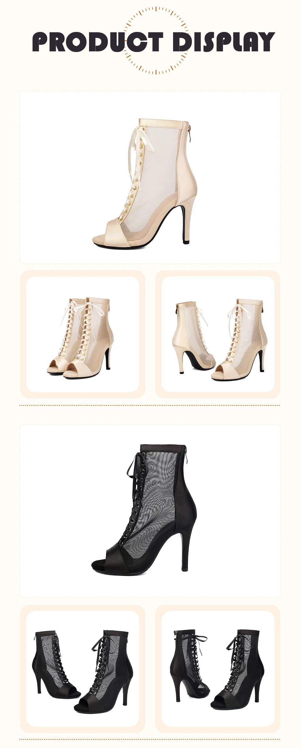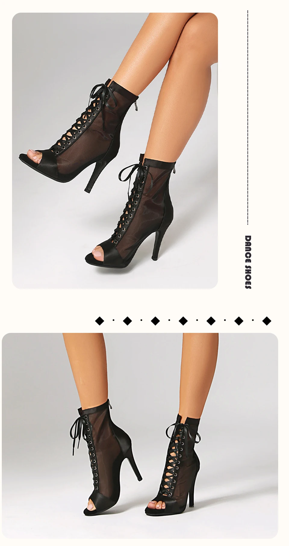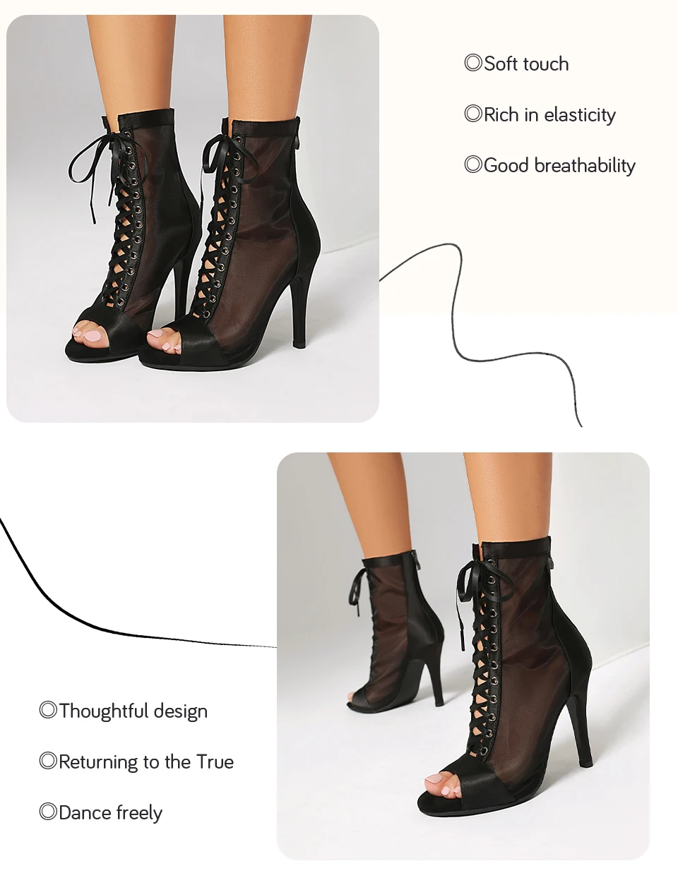 HROYL Jazz Dance Shoes High Heels Women Lace-up Mesh Sandals Sexy Short Boots Summer Net Boots Fish Mouth Dance Boots Ballroom