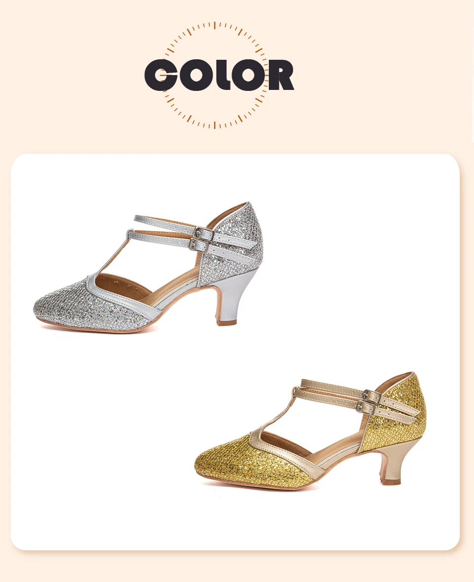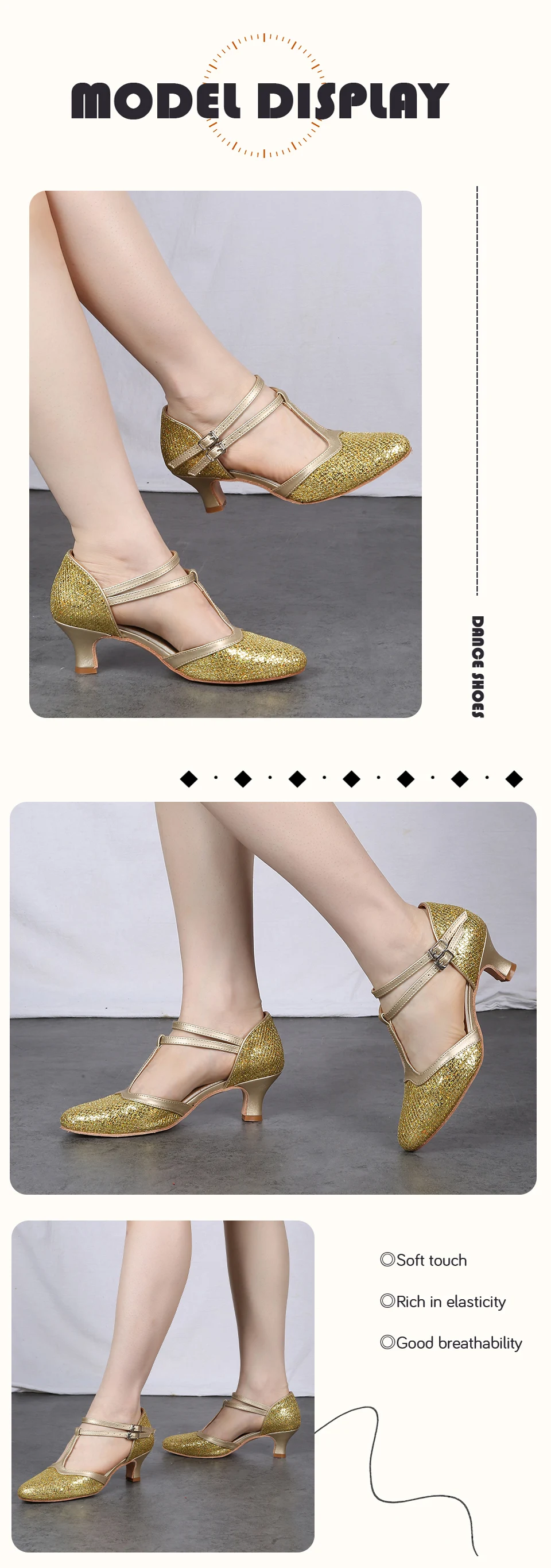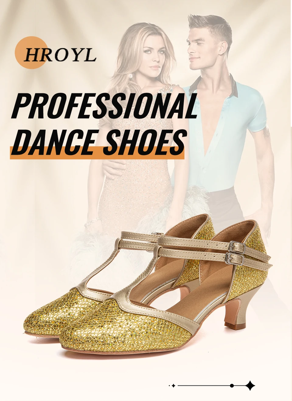 HROYL Ladies Sequined Latin Dance Shoes Soft Sole Square Dance Shoes Mid-heeled Four Seasons Modern Closed Toe Dance Shoes Woman