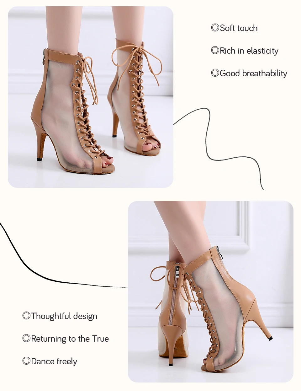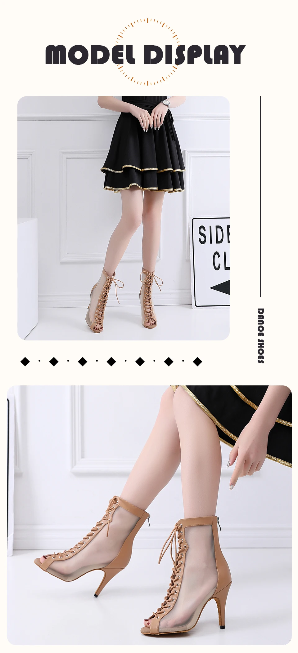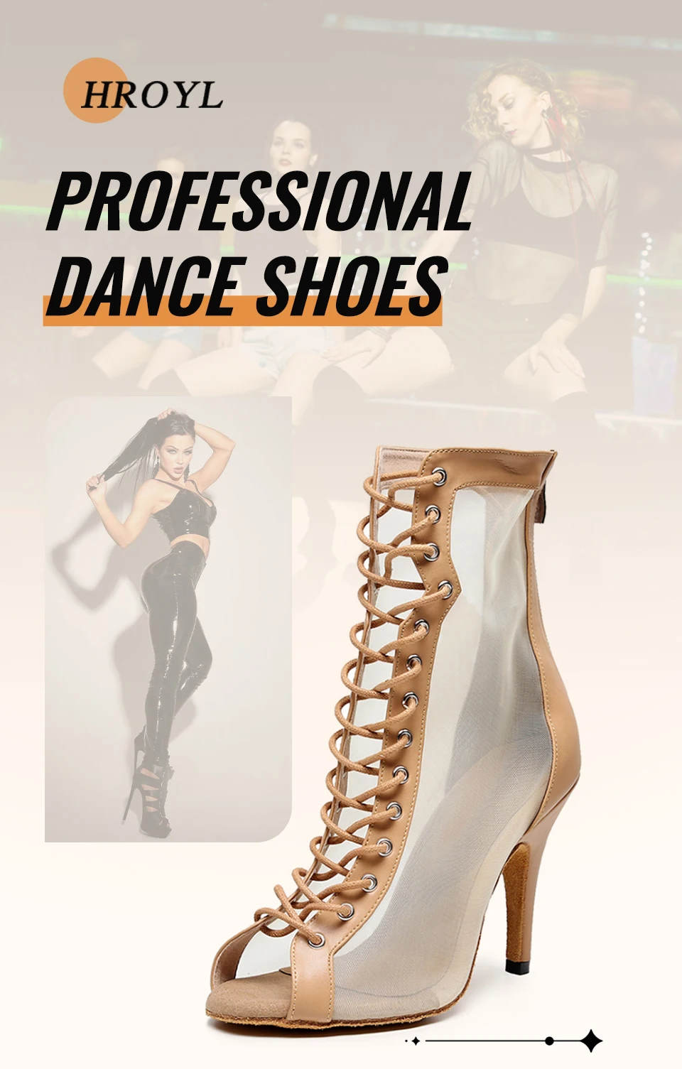 HROYL Latin Dance Shoes Women Jazz Dance High Heels Mesh Sandals Summer Dancing Short Boots Fish Mouth Lace-up Net Boots Girls