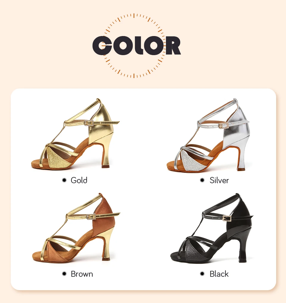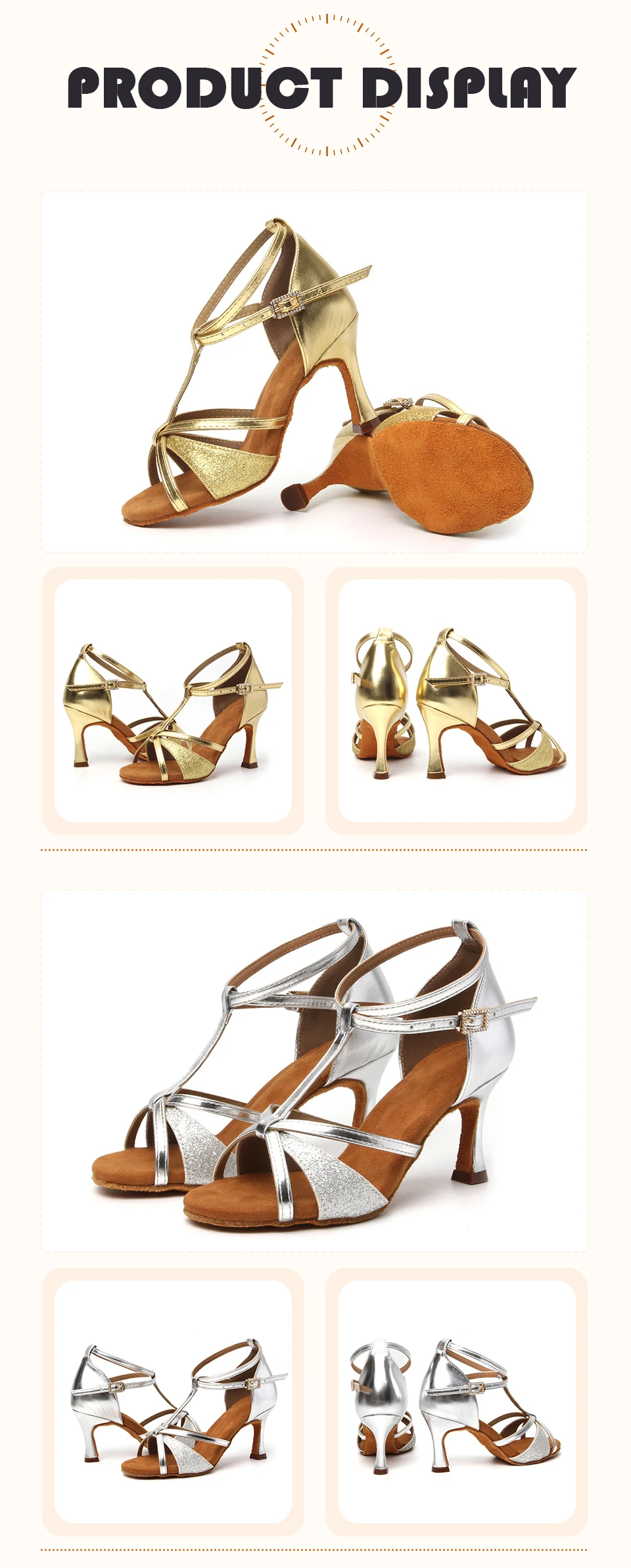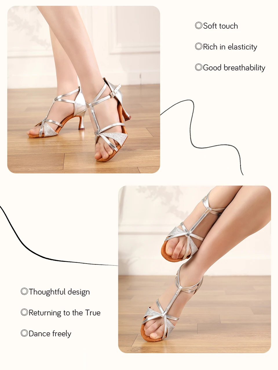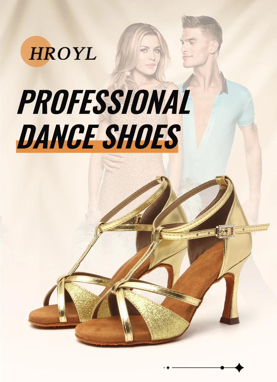 HROYL Latin Dance Shoes Women Modern Ballroom Dance Shoes Mid-high Heel Sequined Satin Dance Shoes Tango Waltz Salsa Sandals