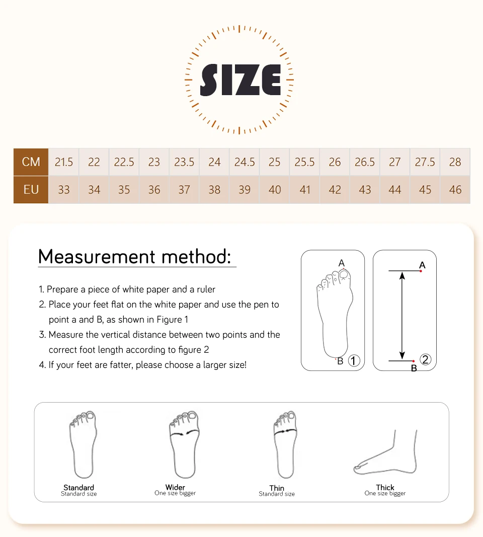 The size chart is not a standard EU/US, please choose the size according to your foot length (CM).