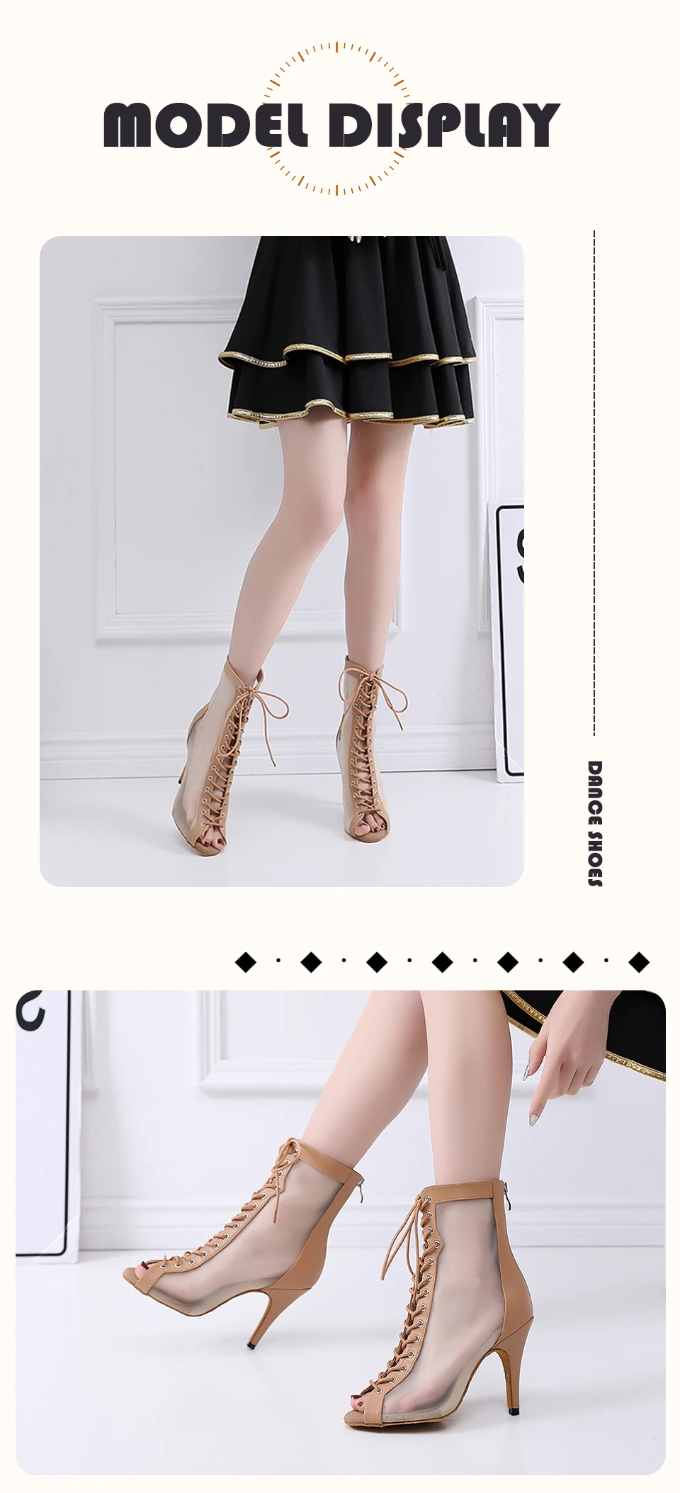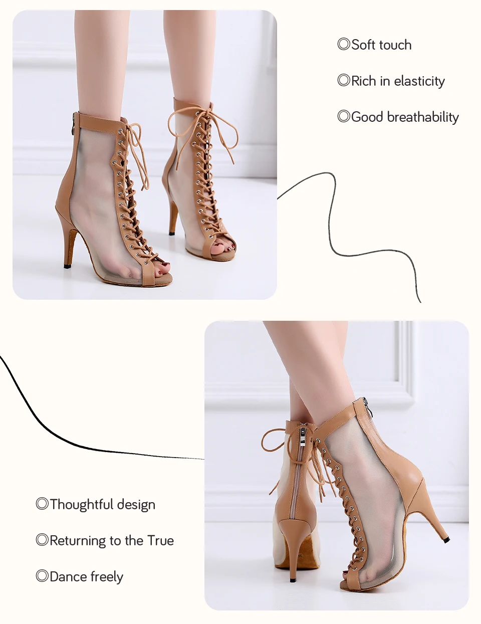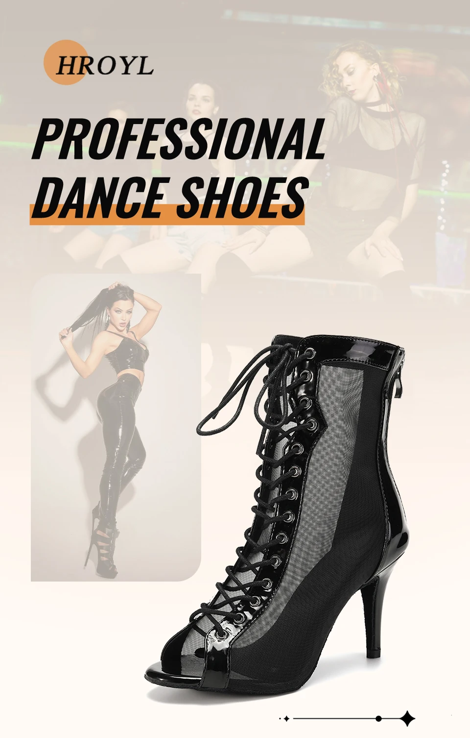 HROYL Mesh Jazz Dance Short Boots Lace-up Jazz Latin Tango Dance High Heels Plus Size Sandals Fish Mouth Dance Shoes Women
