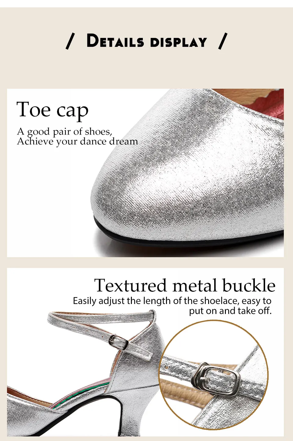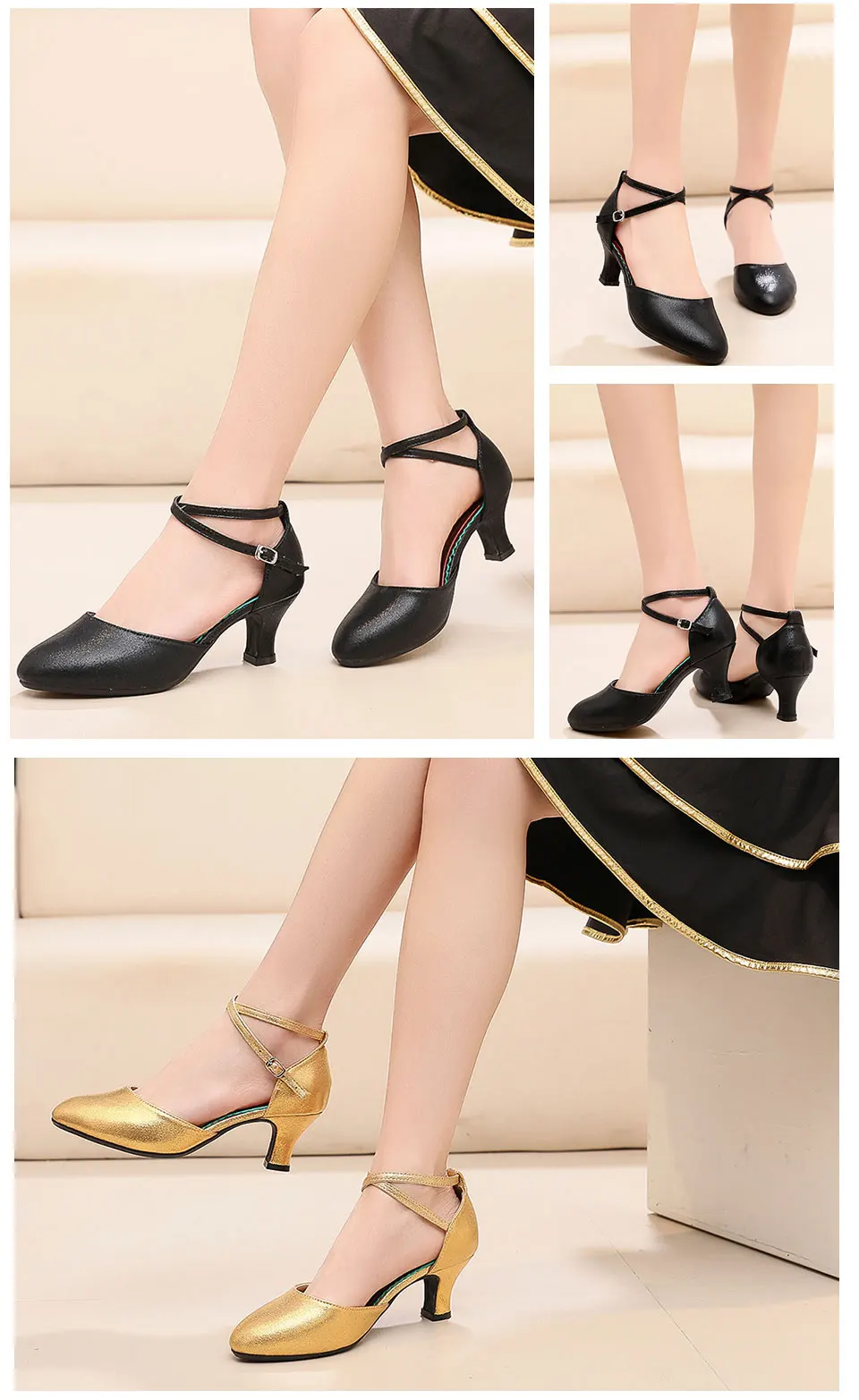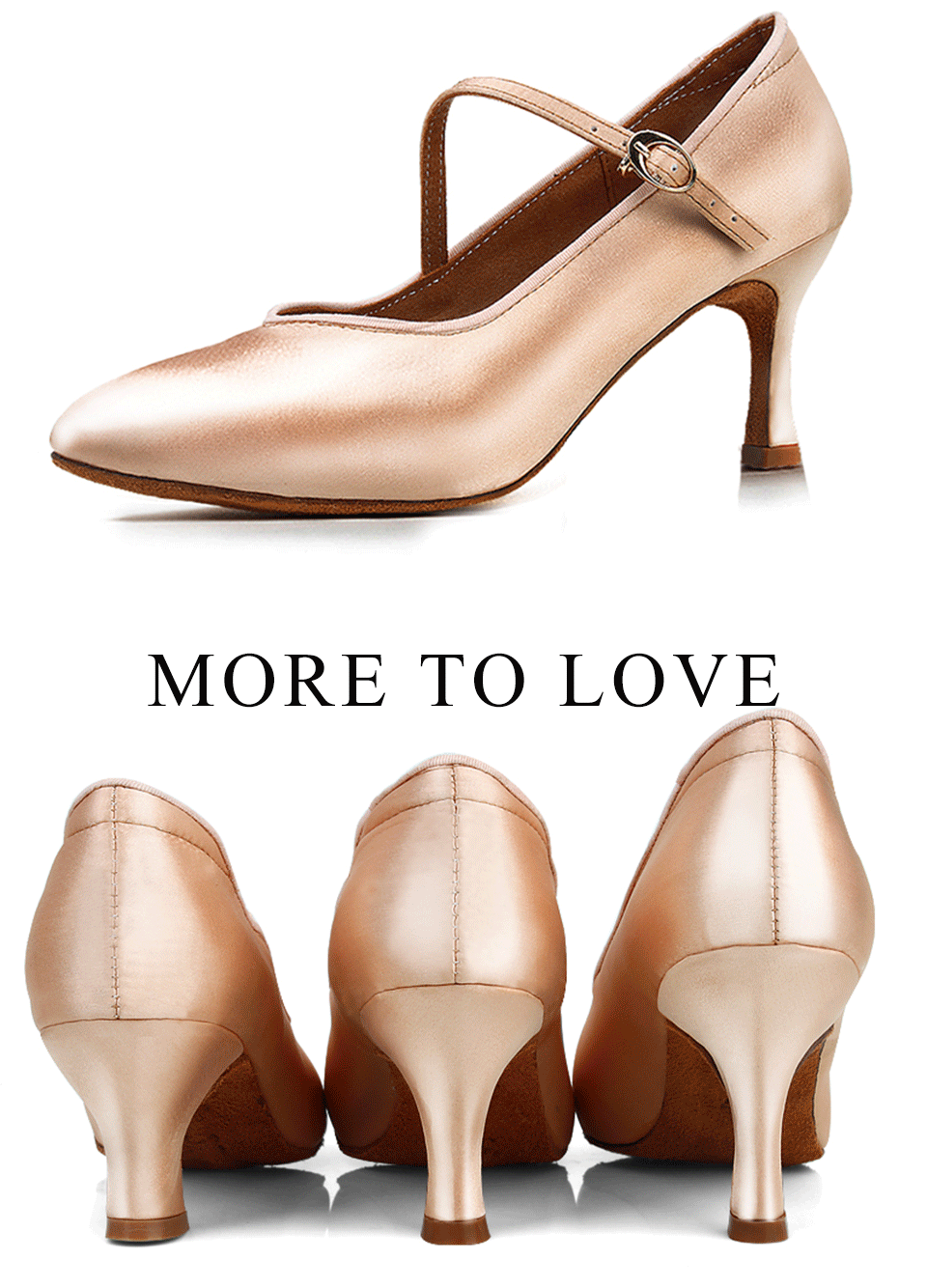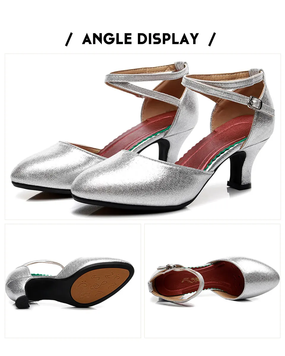An attached ankle cross strap with a pin buckle. Extraordinary flexible, you can dance it all day and don’t hurt your foot