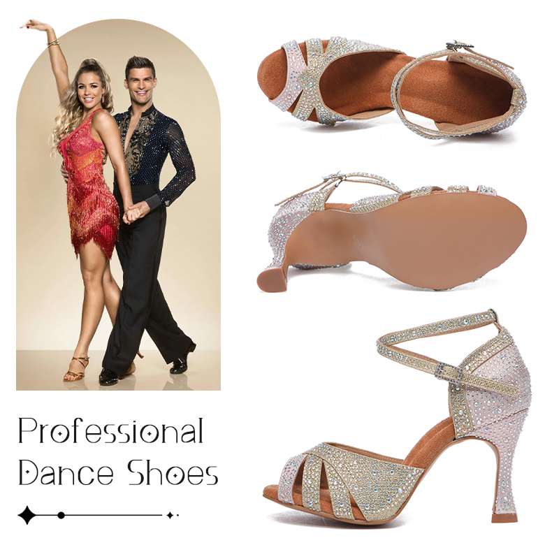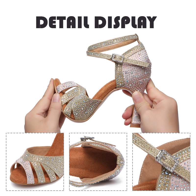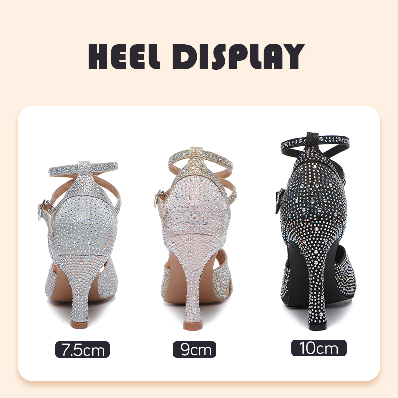 HROYL Rhinestone Satin Latin Dance Shoes Women Breathable Microfiber Inside Ballroom Dance Shoes Jazz Tango Salsa Soft Soled