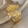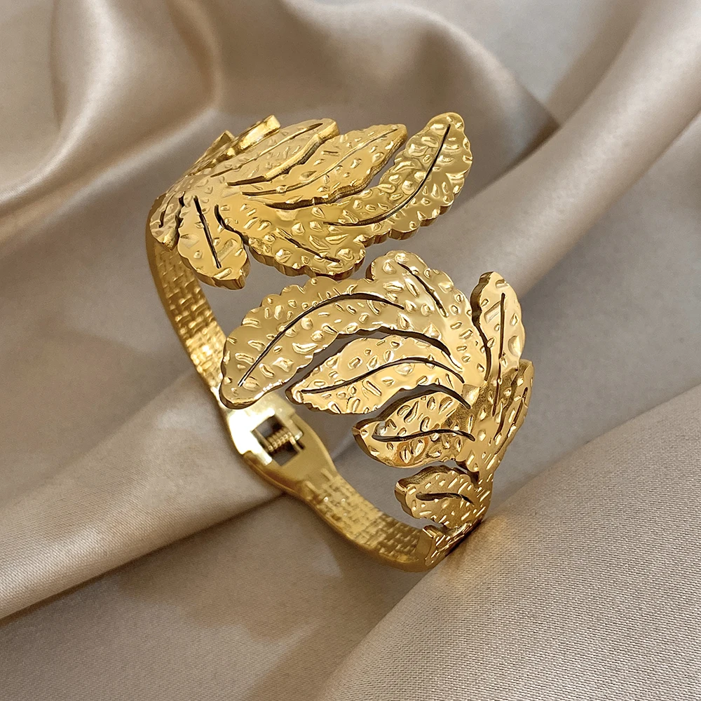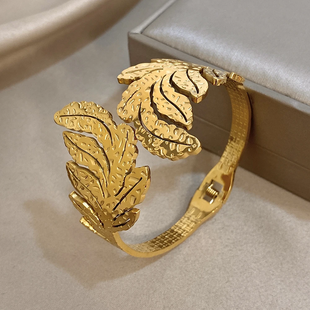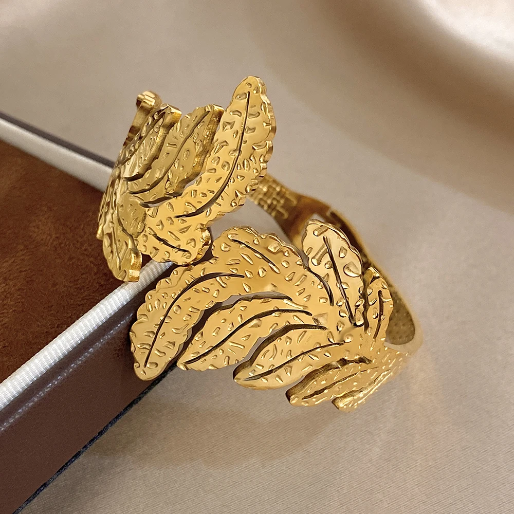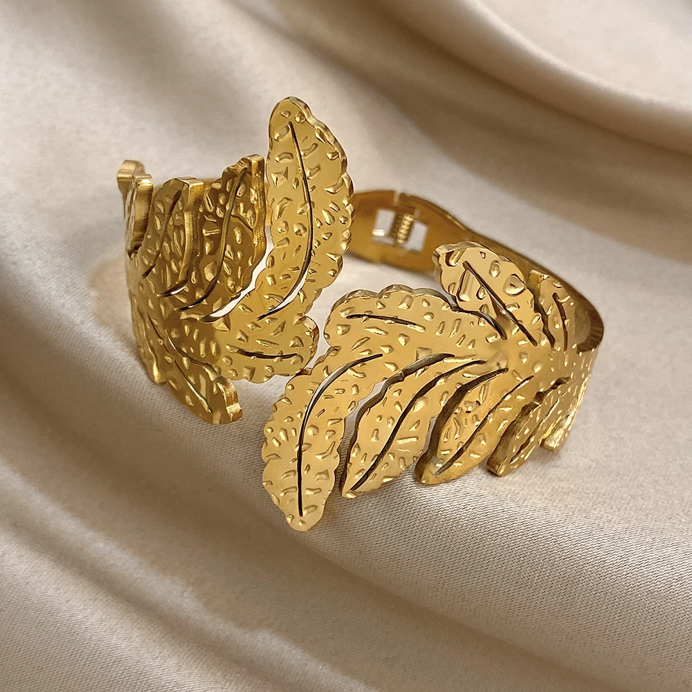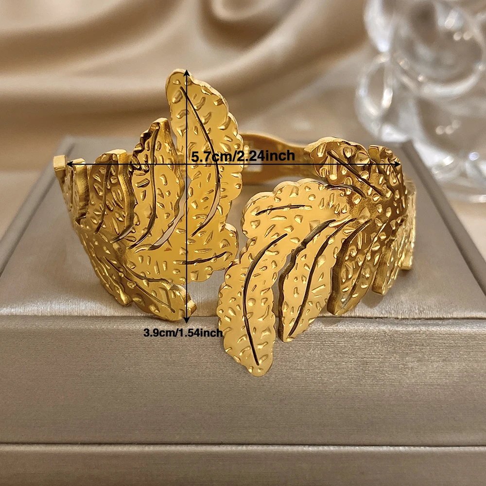 Irregular Carved Textured Leaves Feather Cuff Bangle Exaggerated Gold Plated Stainless Steel Wide Bracelets Waterproof Jewelry