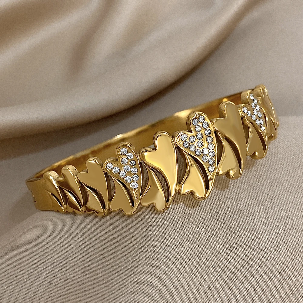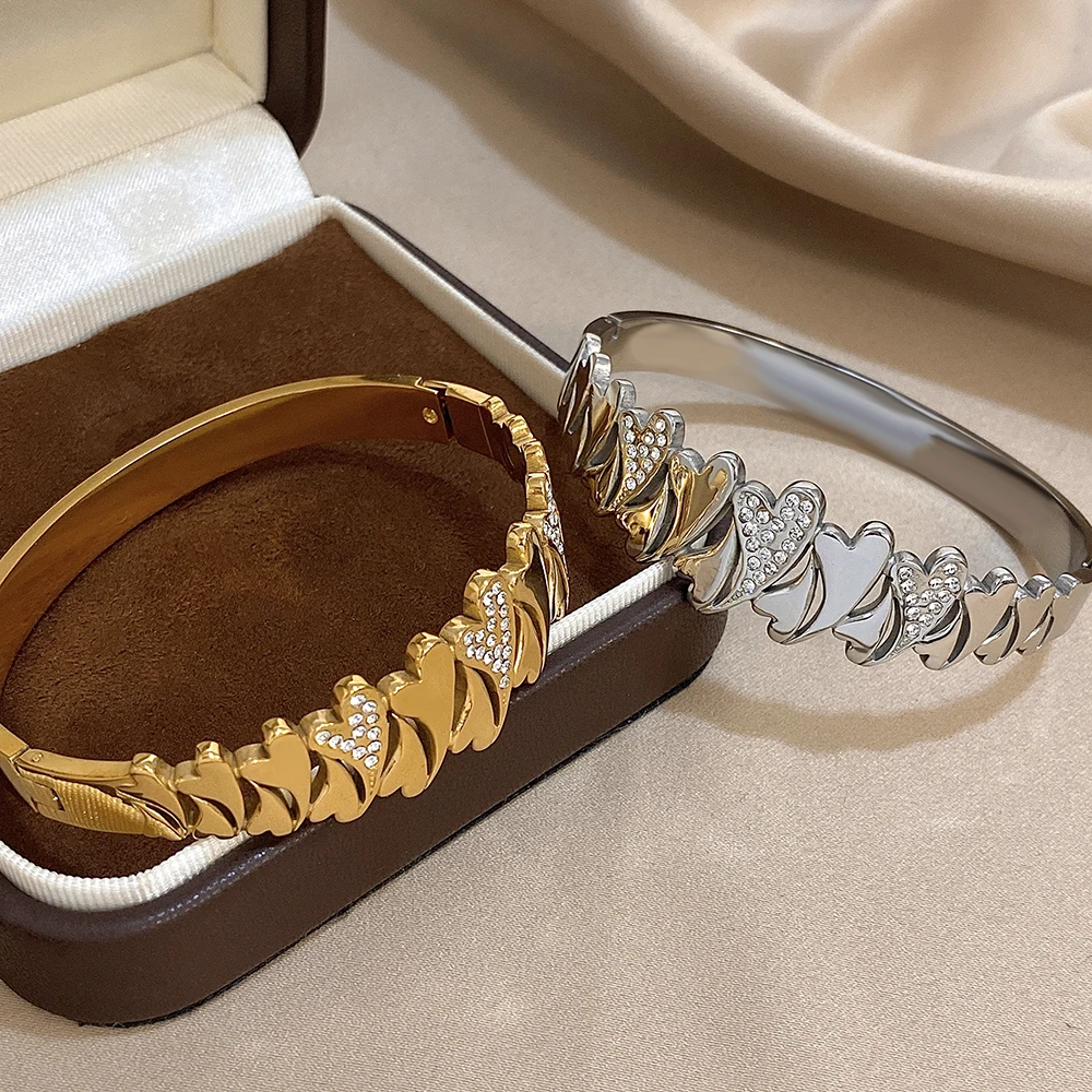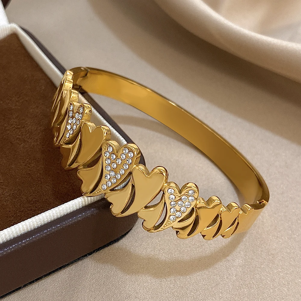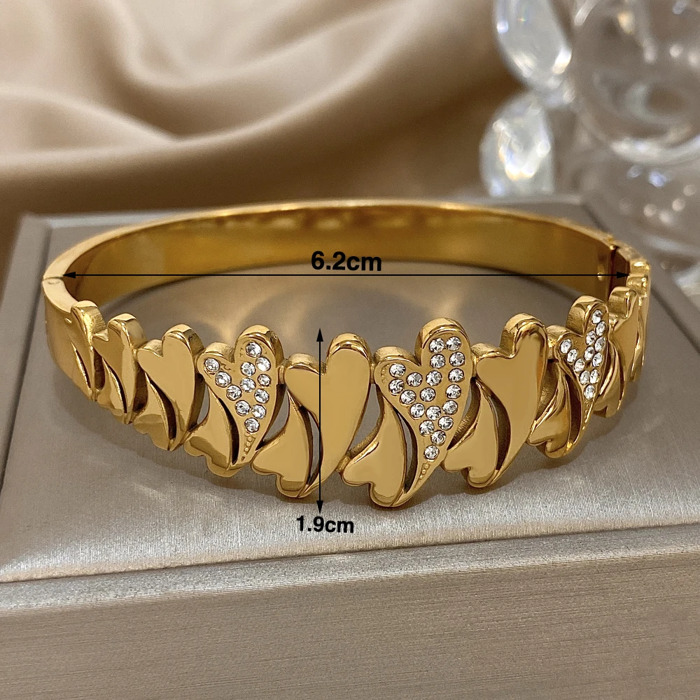 Irregular Rhinestone Heart Stainless Steel Bracelet for Women Stylish Gold Plated Geometric Cuff Bangles Waterproof Jewelry