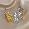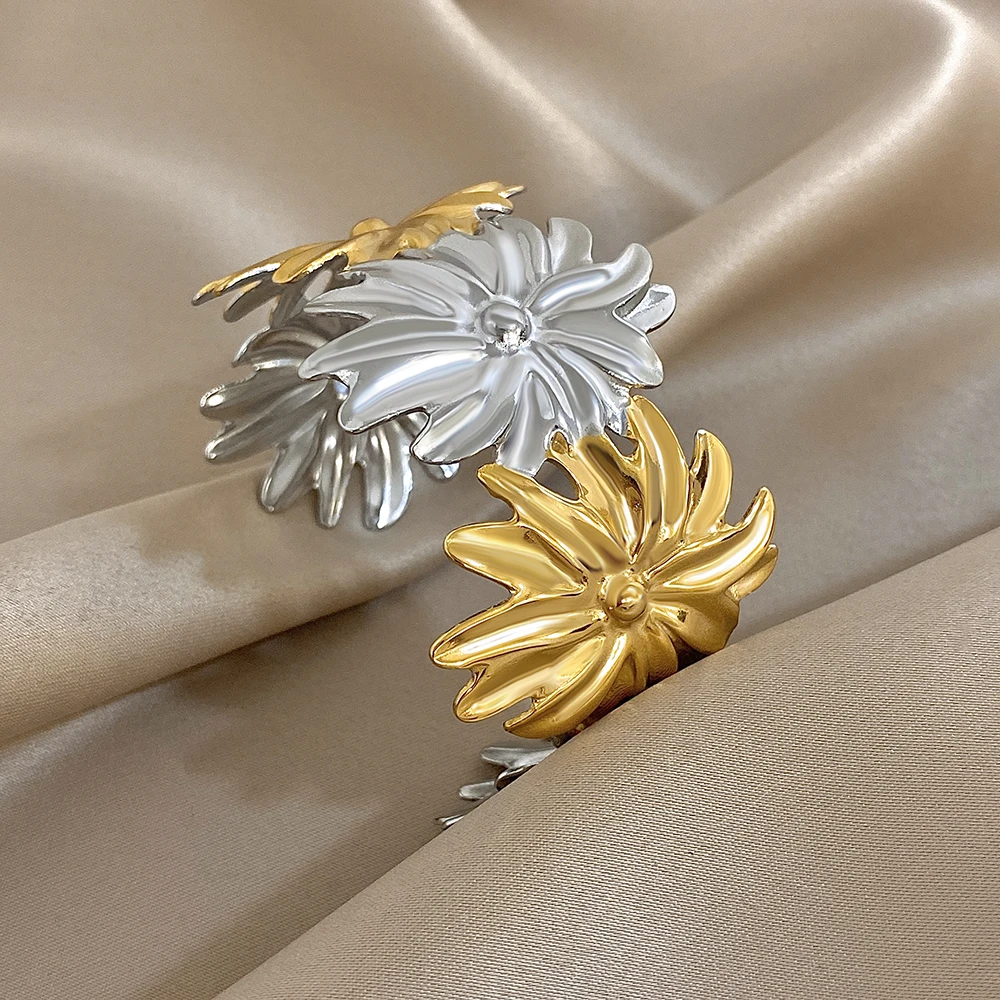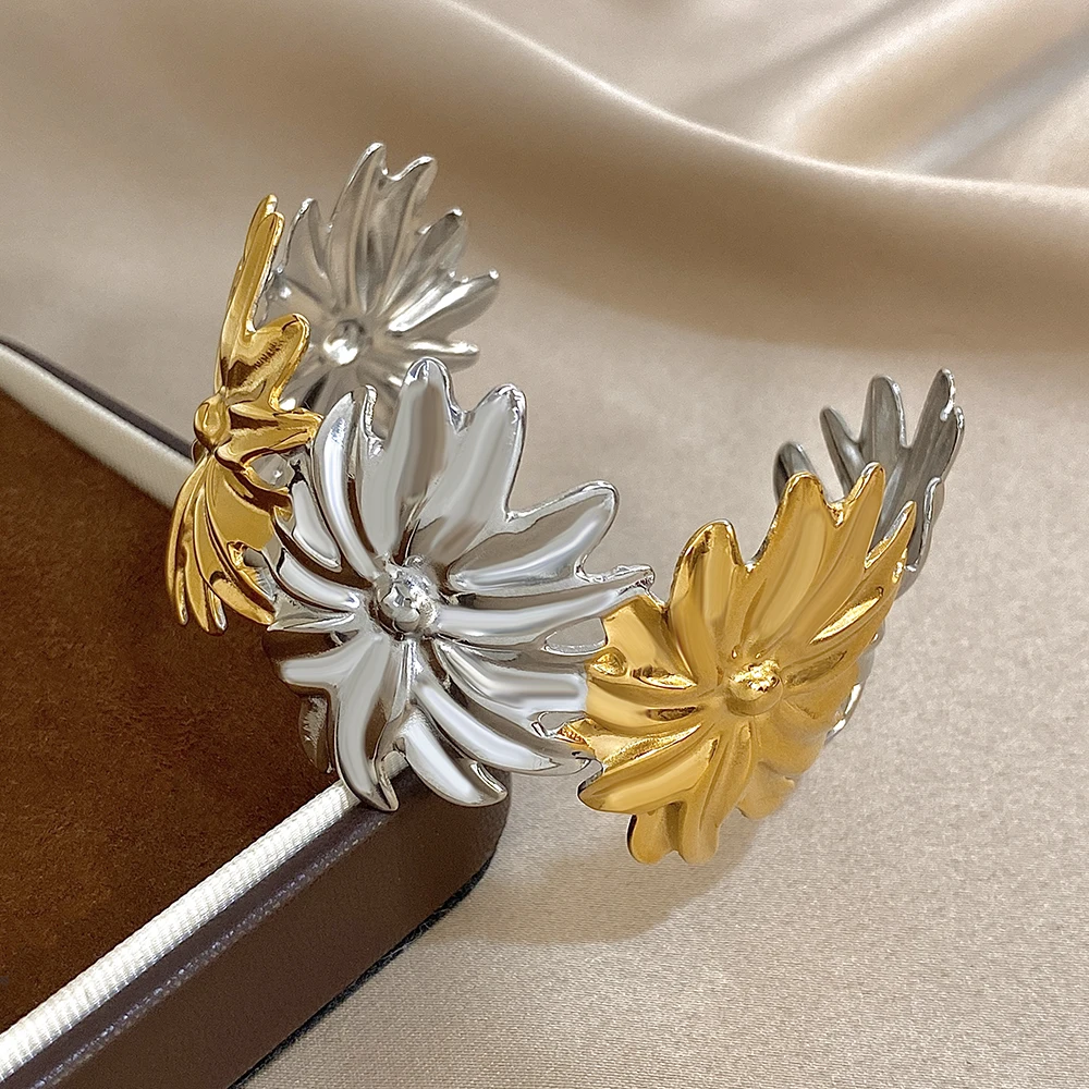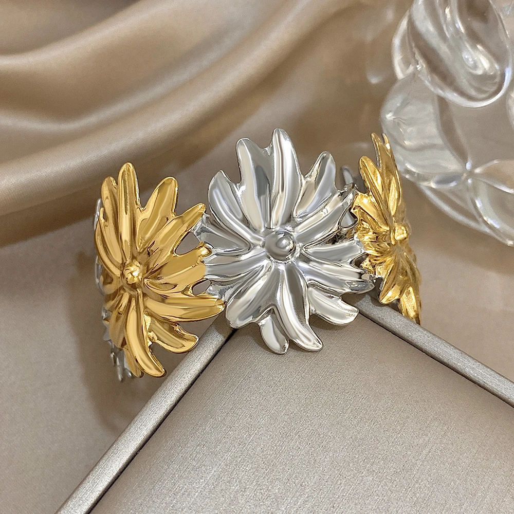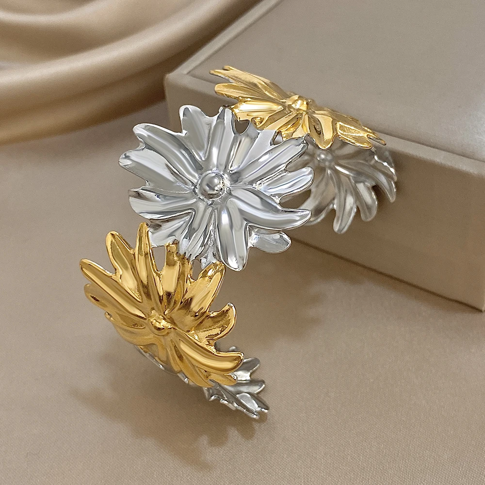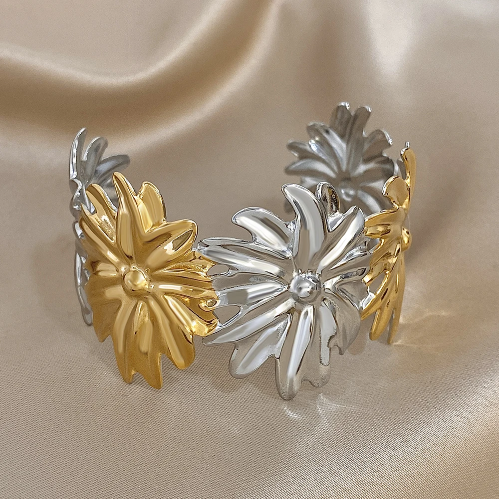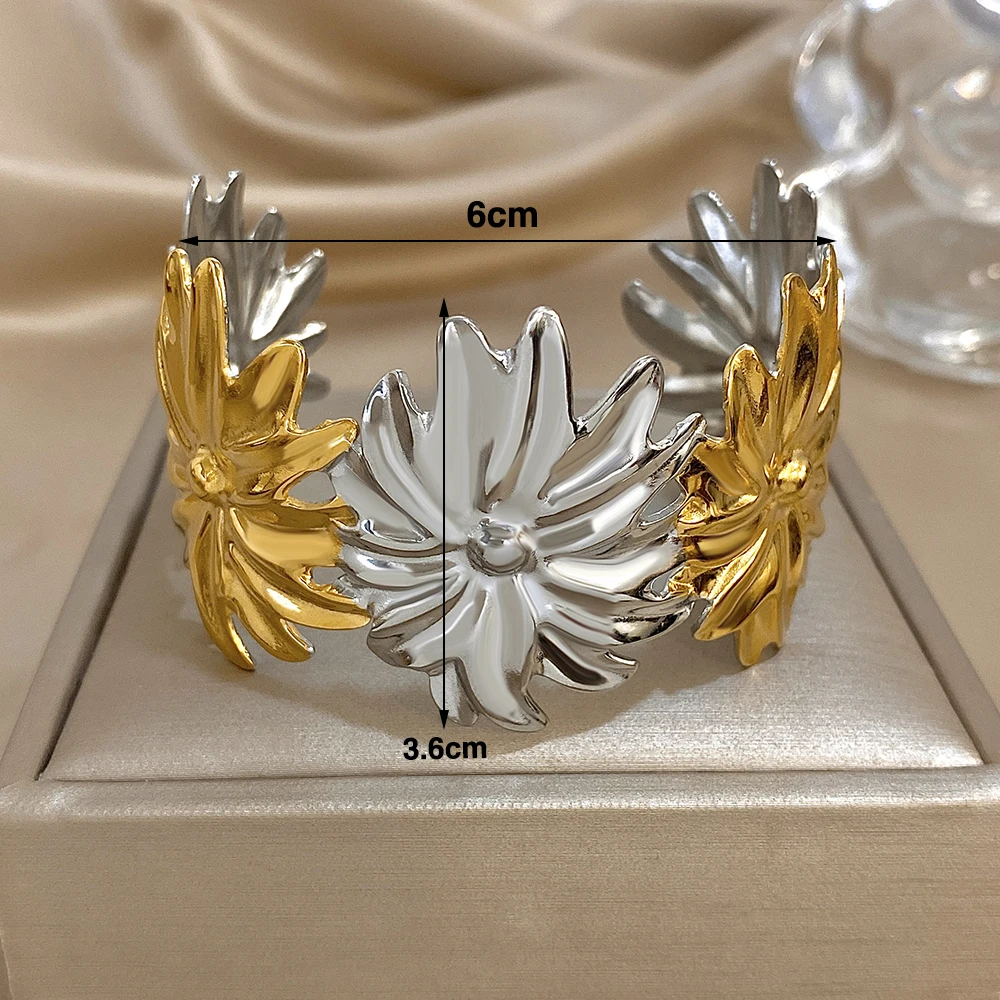 Irregular Two Tone Big Flower Wide Bangle Bracelets for Women Unique Stainless Steel Smooth Cuff Bracelet Waterproof Jewelry