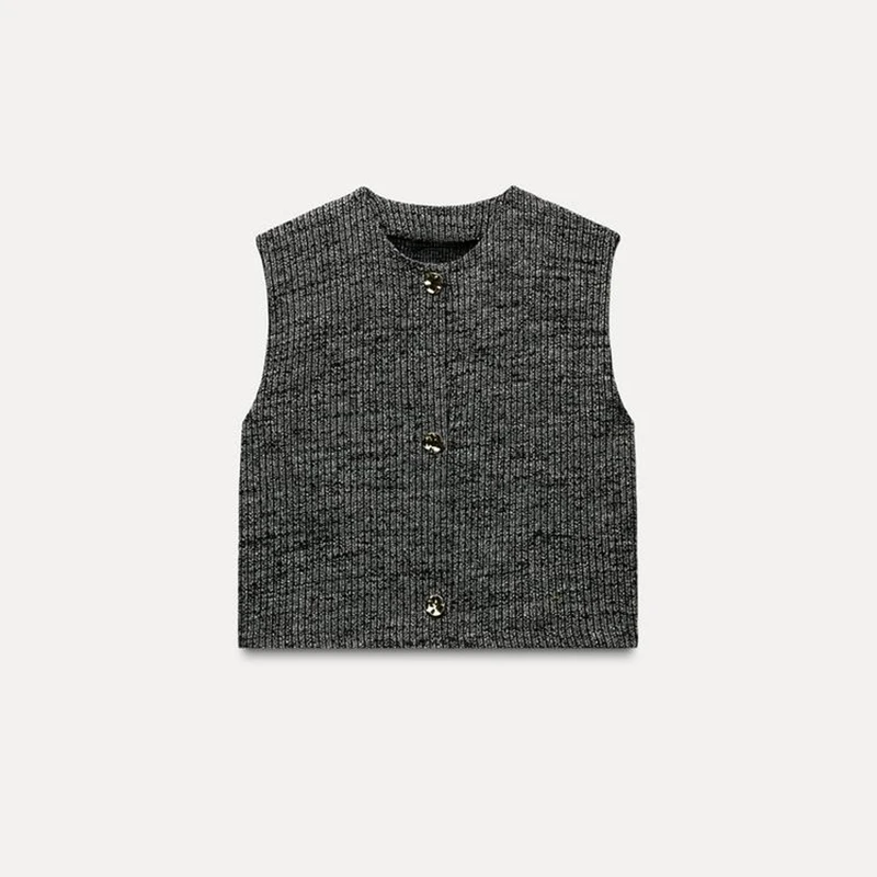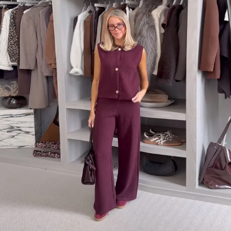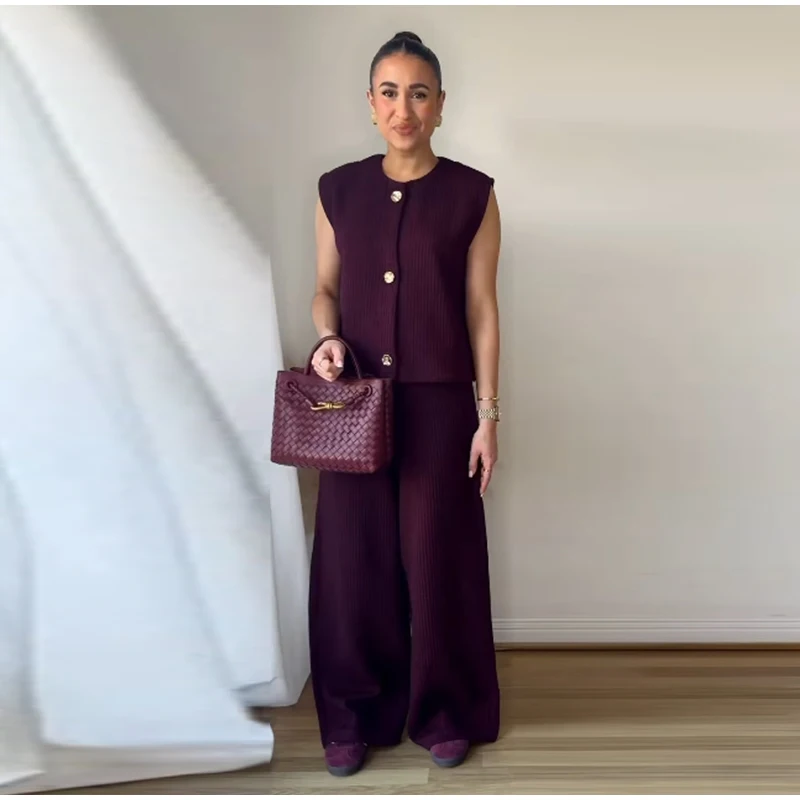 Knit Pant Two Pieces Set Women Casual Sleeveless Single-breasted Cardigan Wide Leg Trousers 2025 Summer Minimalist Loose Outfits