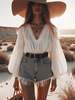Lantern Sleeves Simple Boho Blouse Solid Color V Neck Lace Patchwork Ethnic Style Women Tops Spring Summer Autumn Chic Blouses
