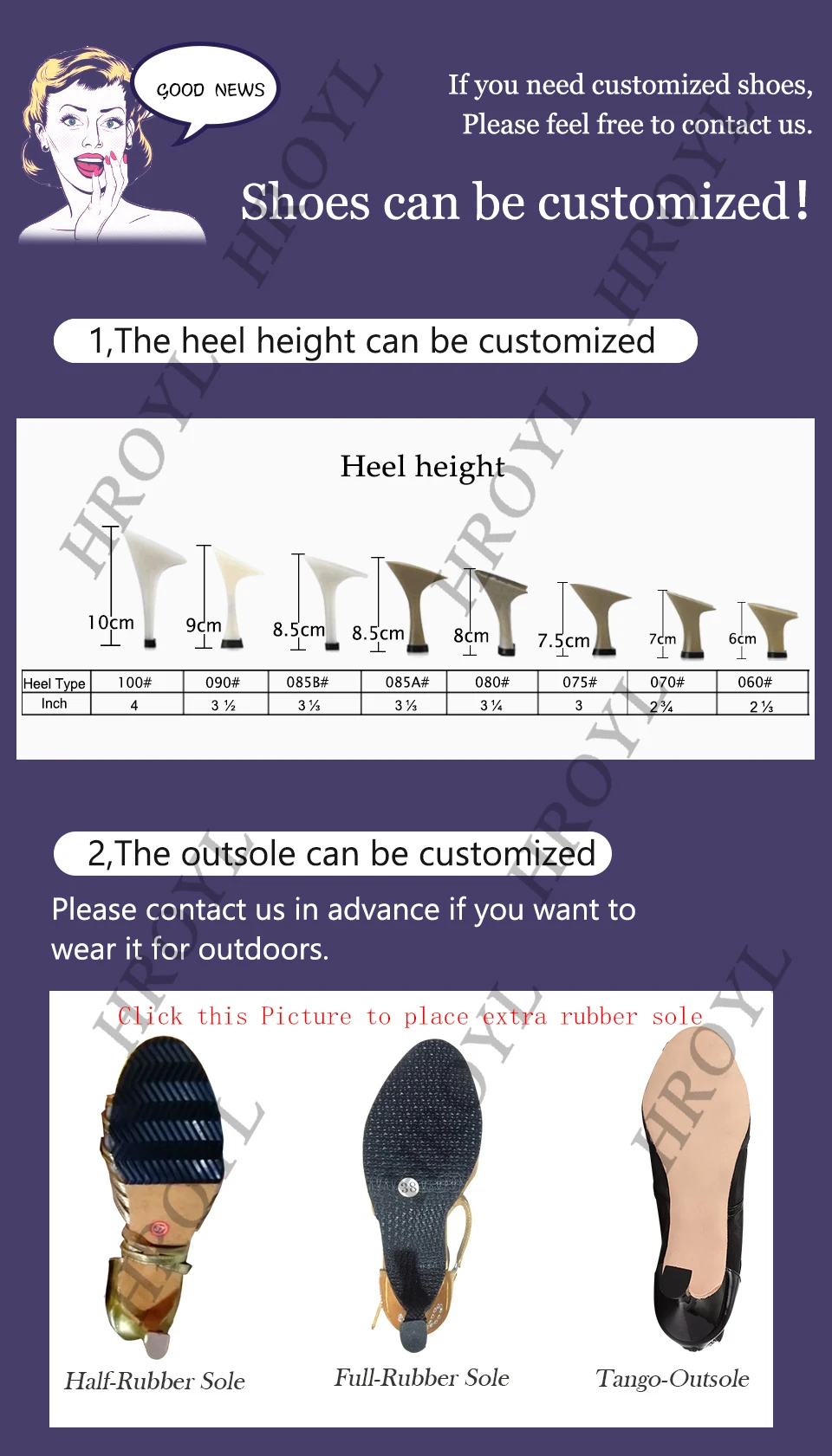 We,HROYL Offical Store,provide all kinds of high quality dance shoes for you(Ballroom/Latin Shoes,Dance Sneakers, Jazz Shoes,Pointe Shoes,Soft Ballet Shoes, Tango/Flamenco Shoes,Tap Shoes ).We supported customized Your Own Brand, Different heel height and sole.Anything you need,Please feel free to contact us.